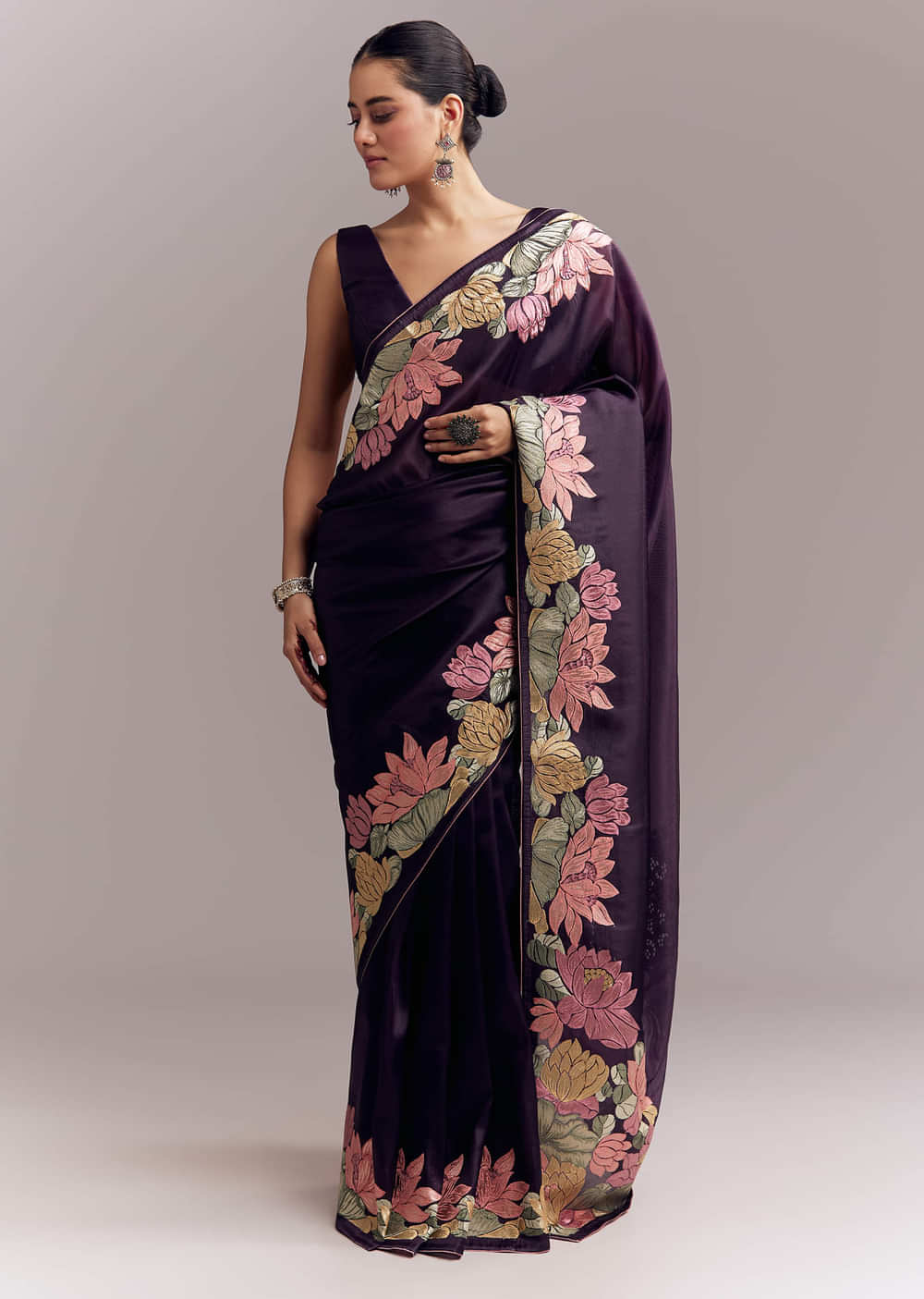 Use a high-pleat nivi drape to show the border. Add crystal drops, glossy hair, and minimal sandals.