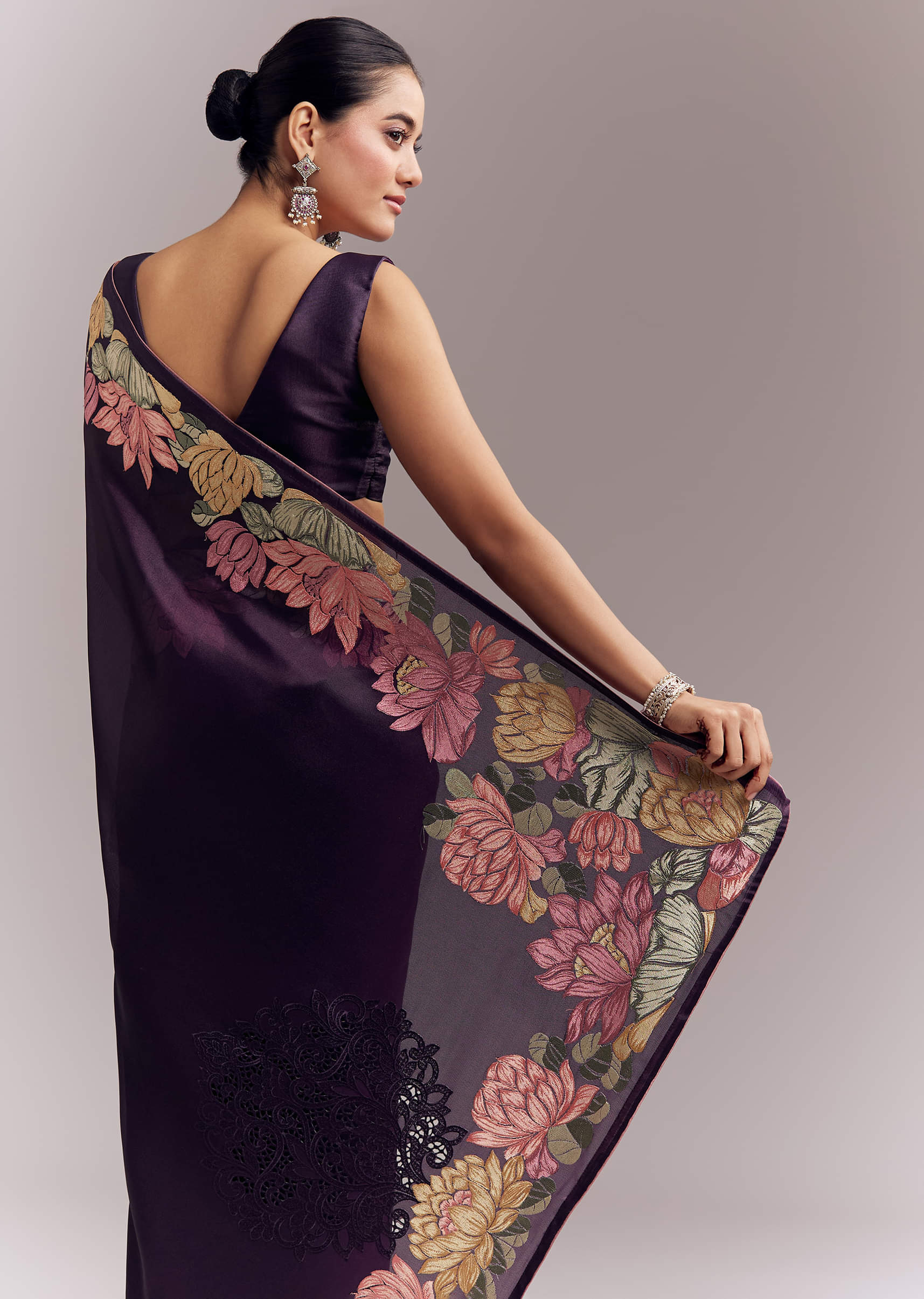Purple Organza Silk Saree With Floral Resham Embroidery And Cutwork