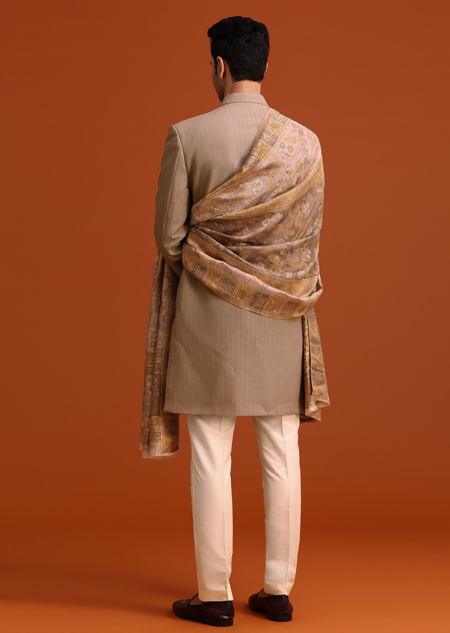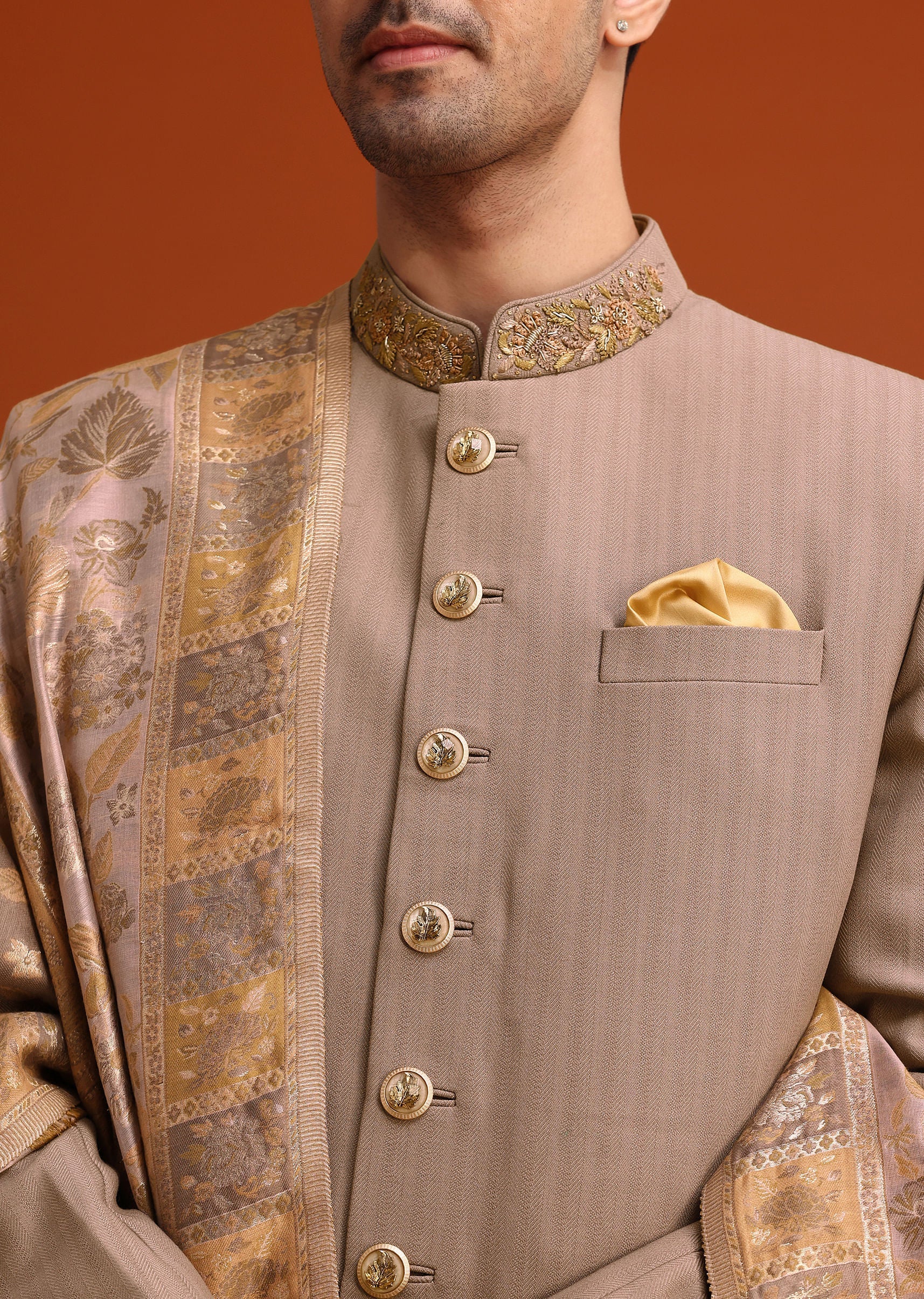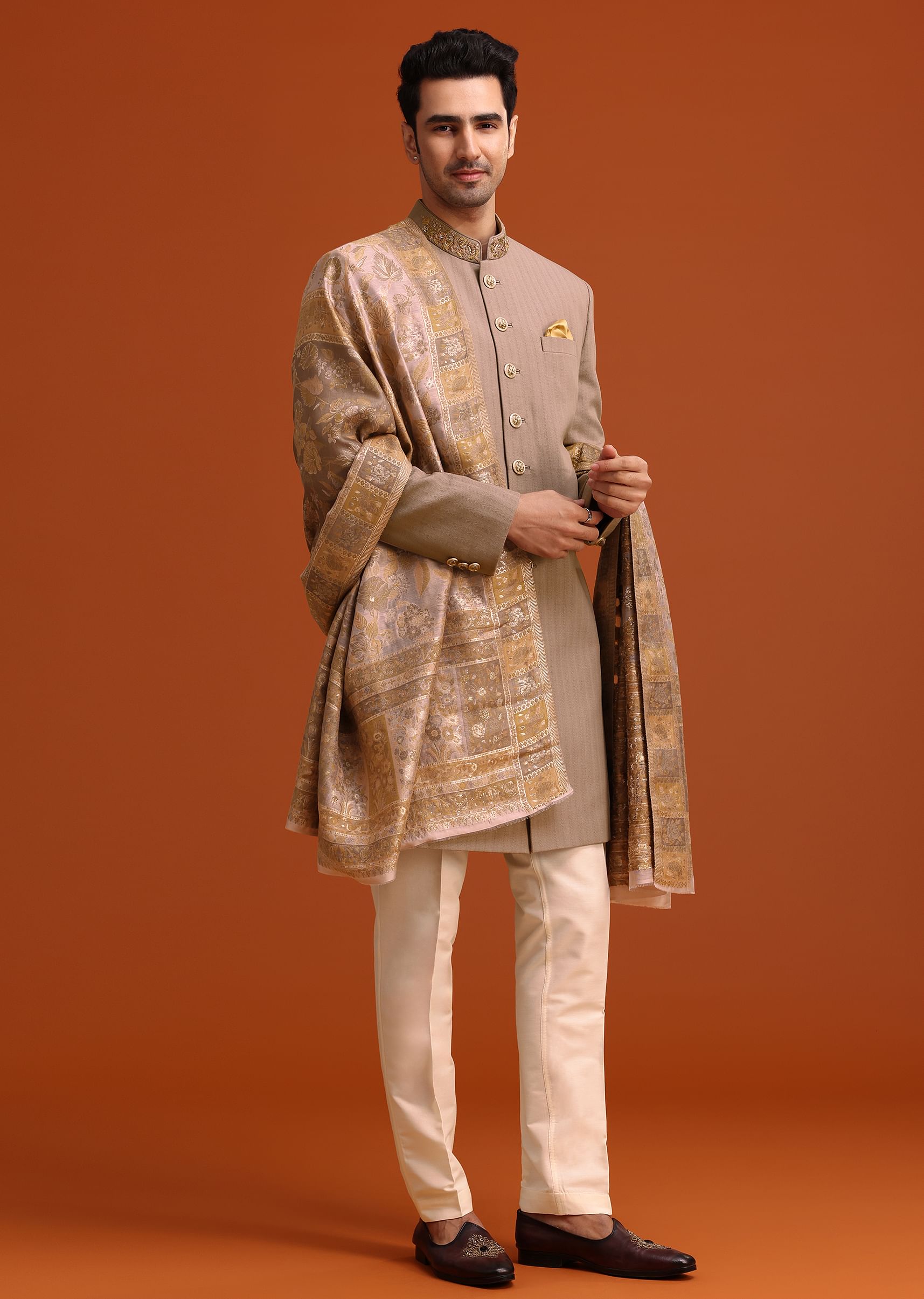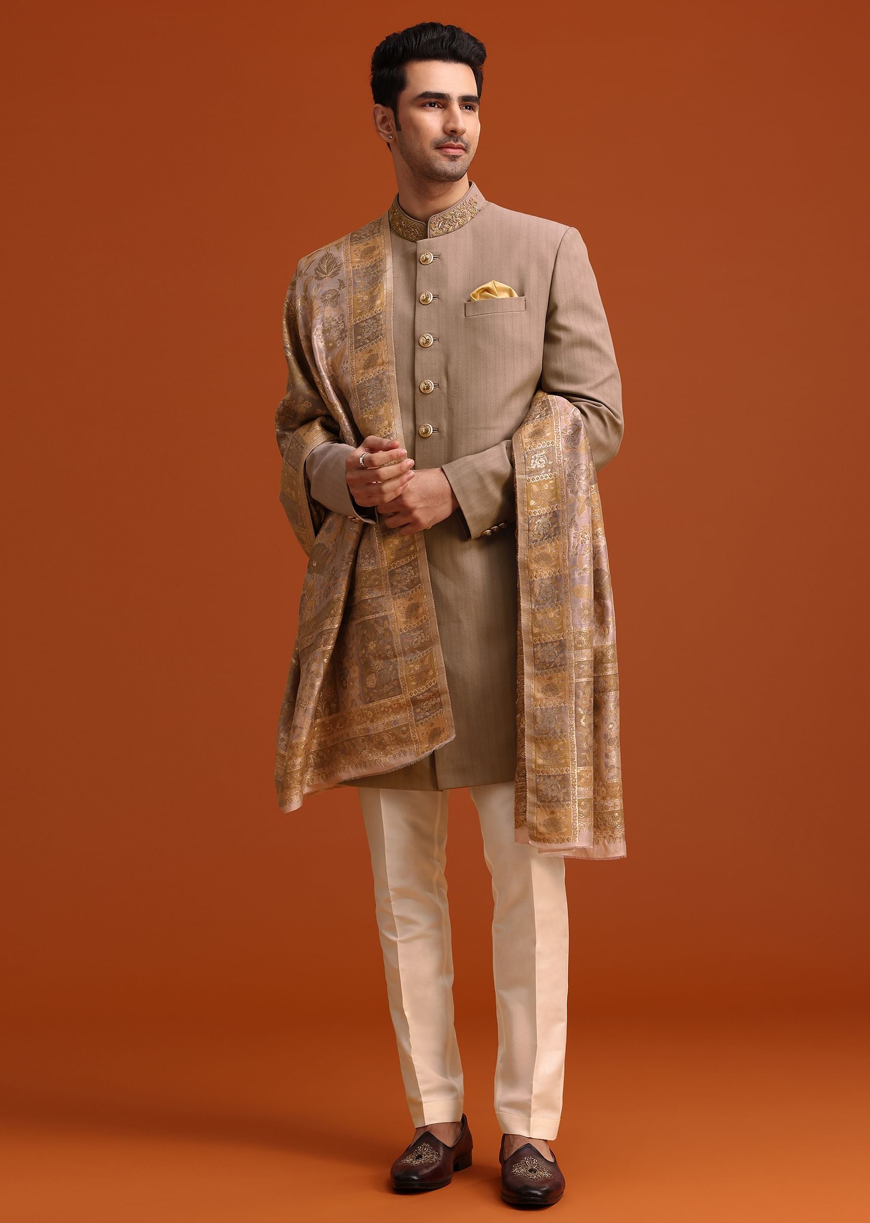 An elegant style to showcase your unmatched charm is this resplendent sherwani set. Elevated with intricate hand work on the neckline, the captivating purple hue add to its charm. Decked on an opulent base, it showcases a mandarin collar, full sleeves and fancy front buttons. Completed with co-ordinating bottoms and a dupatta, this set is perfect for year-round weddings. Awarded as the Most Trusted Brand, we're delivering styles you love, just as promised.