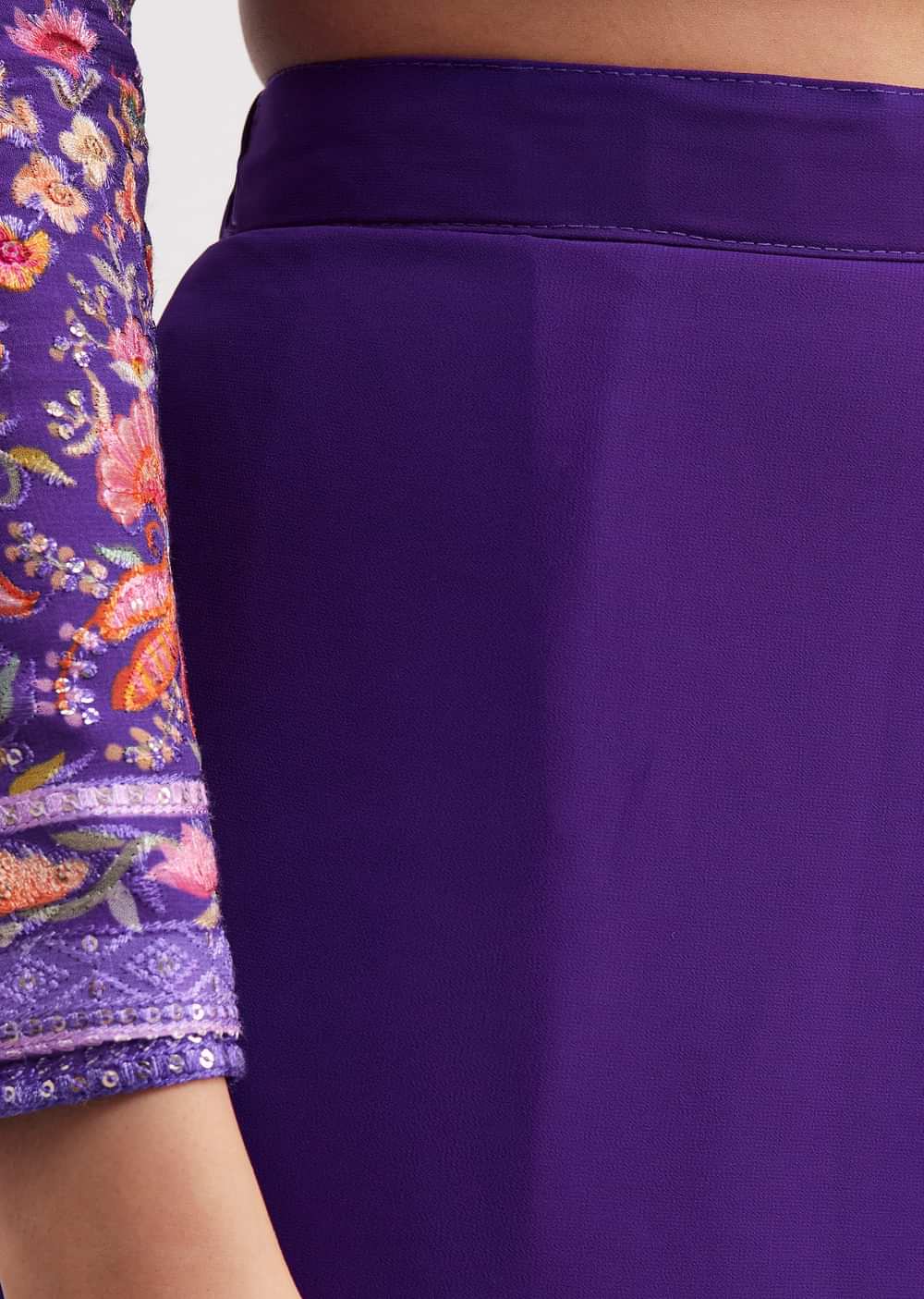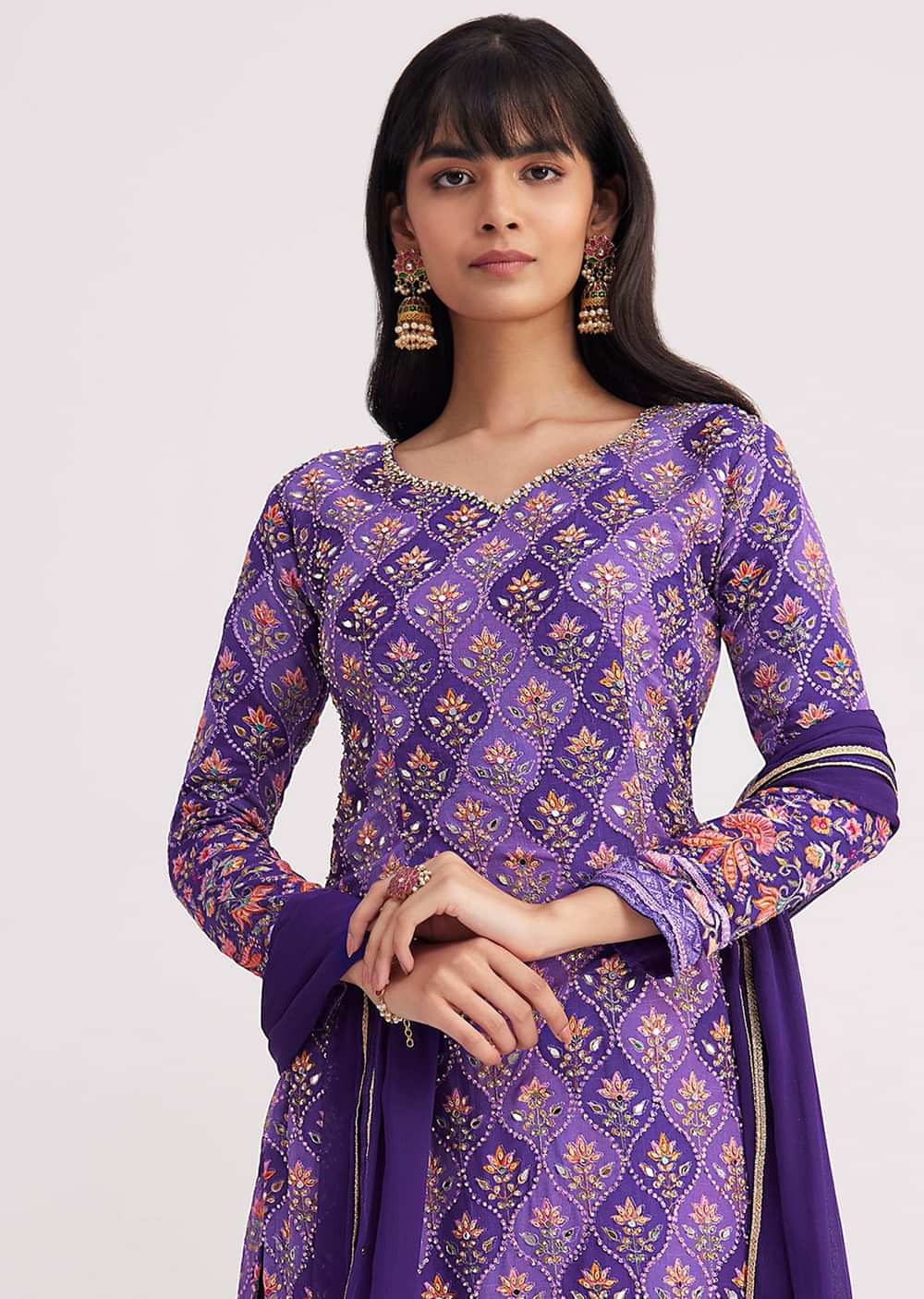 Purple Printed Mirror Work Kurta Set With Flared Palazzo