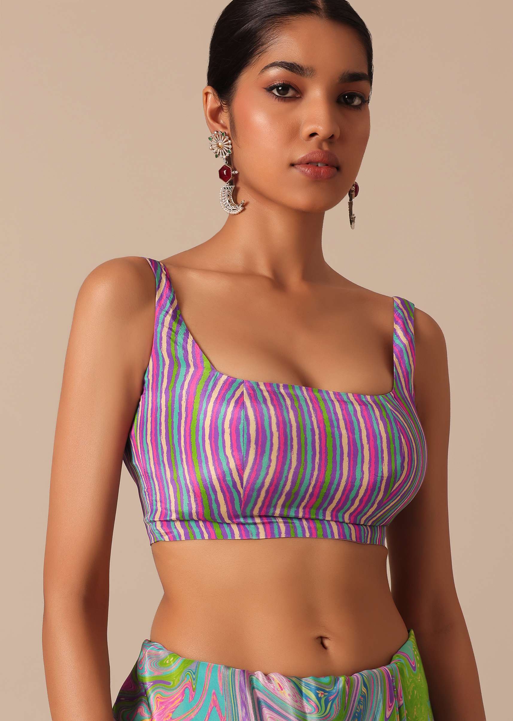 Purple Printed Saree With Mirror Work And Unstitched Blouse Piece