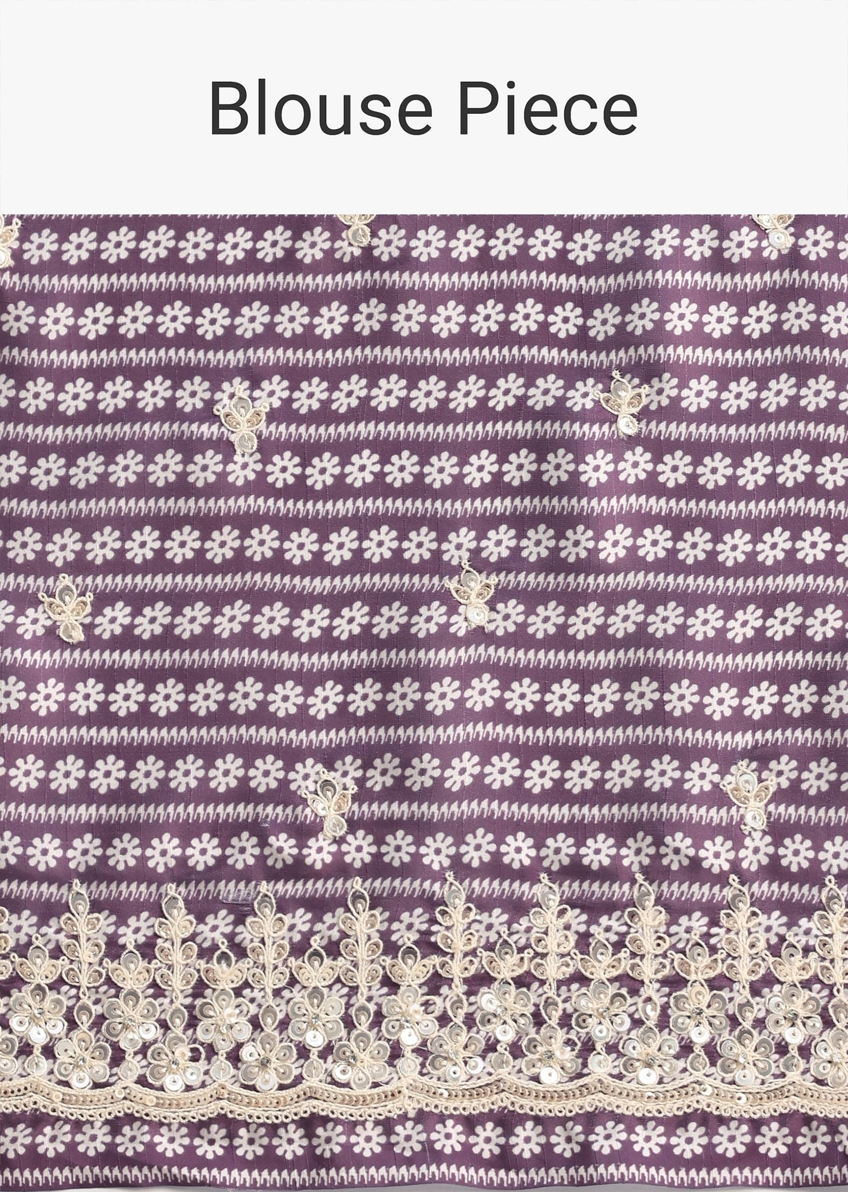 Purple Printed Satin Saree With Sequins Embroidered Border And Unstitched Blouse