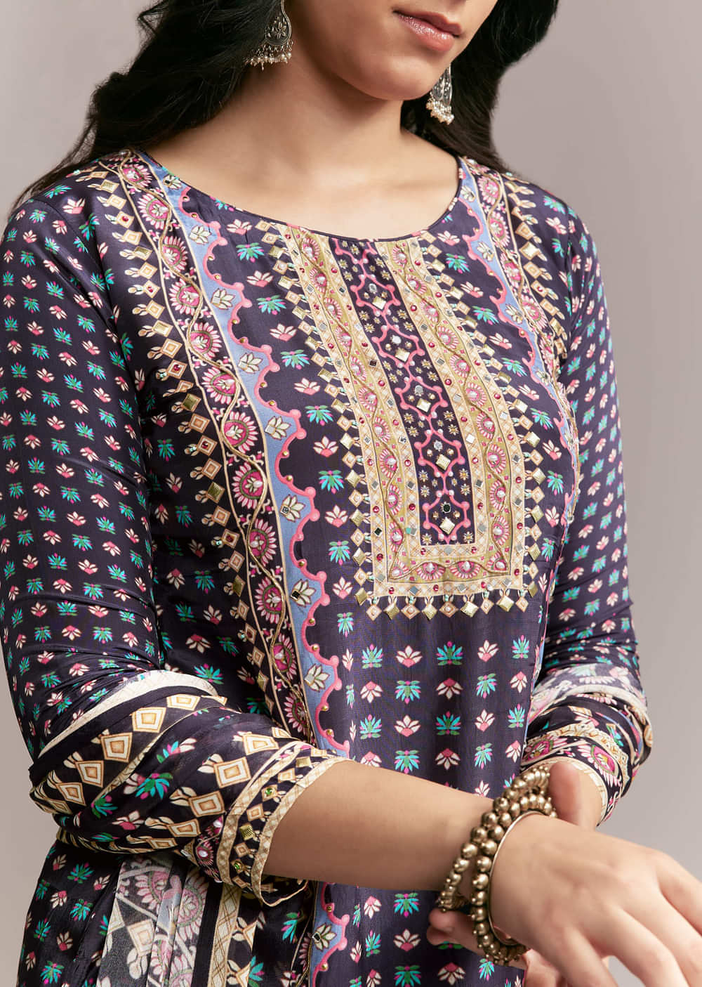 This dark purple crepe kurta and sharara duo is a celebration in print—easy to wear, fun to flaunt, and perfect for all the dancing. A little boho, a lot of... More Product Details
