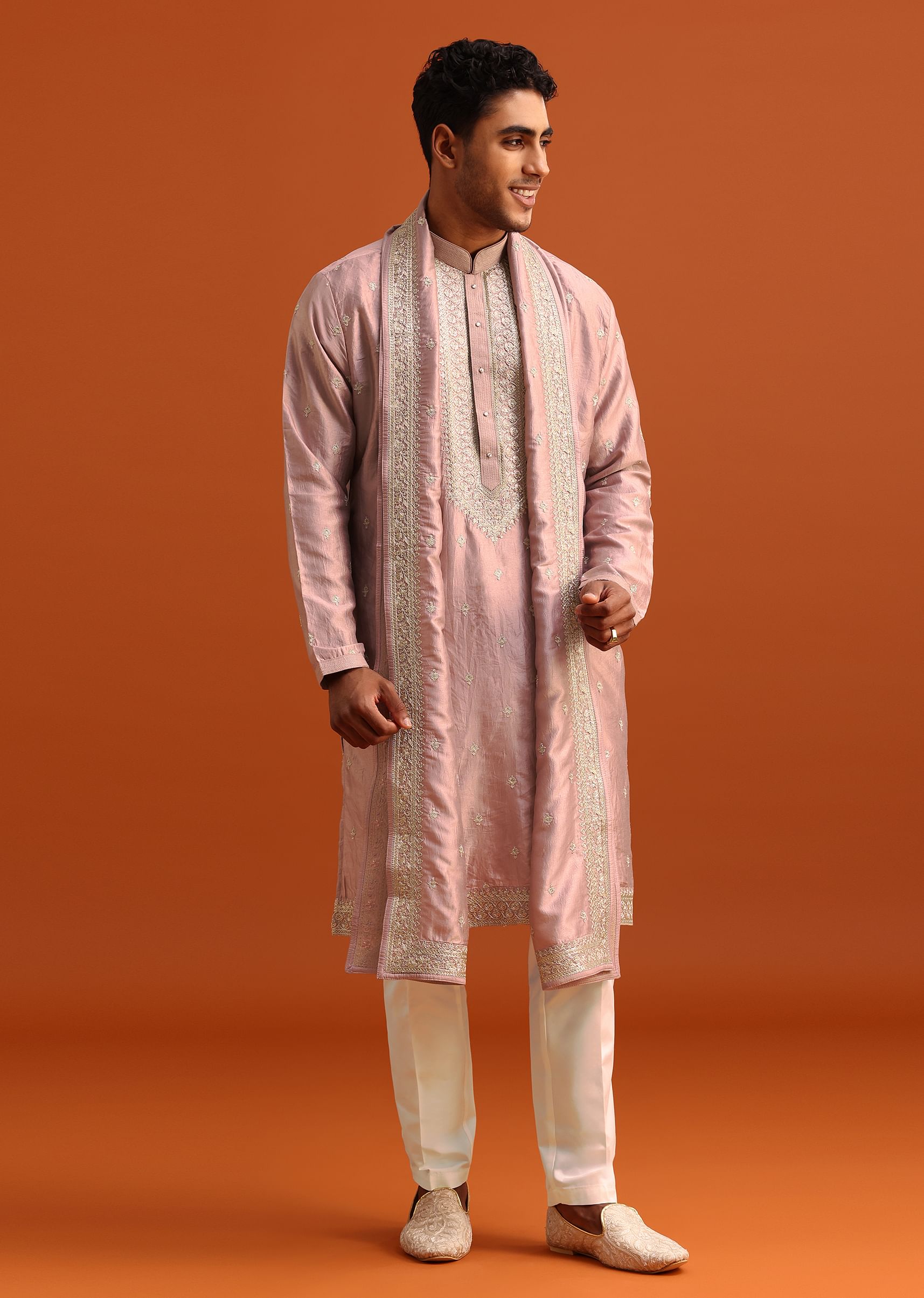Purple Raw Silk Kurta Set With Thread Work Dupatta