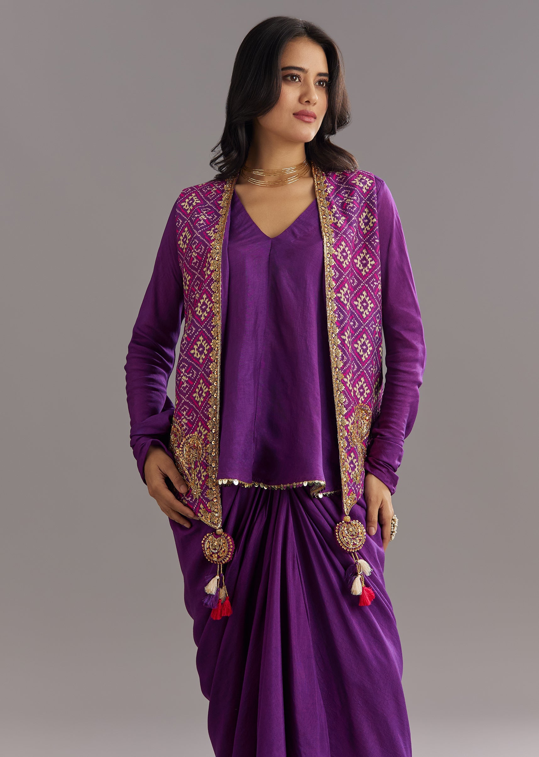 This purple ensemble features a loose top with gotta lace, ikat printed jacket with zardosi border, and a pleated skirt. Designed for cocktail or sangeet nights.