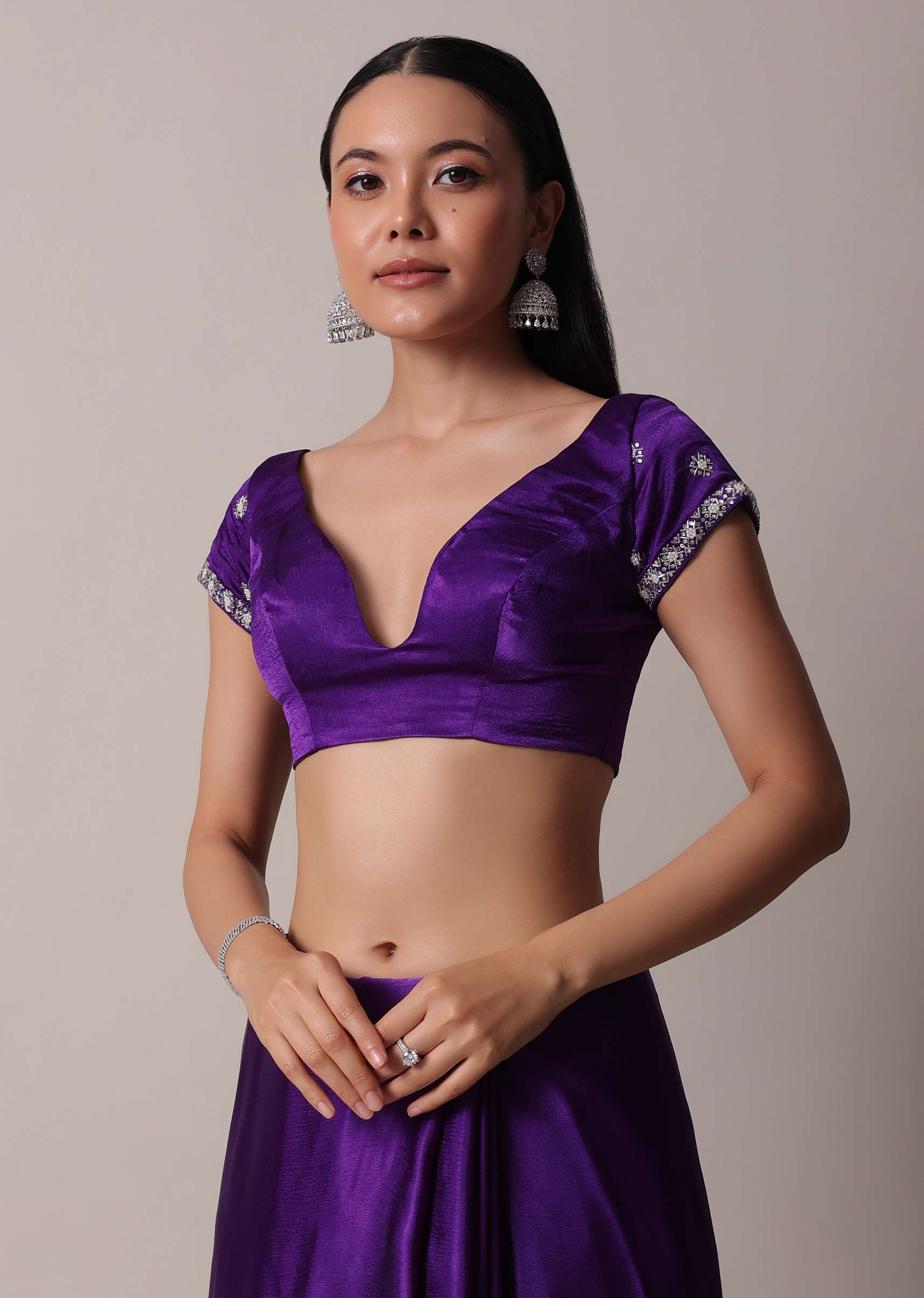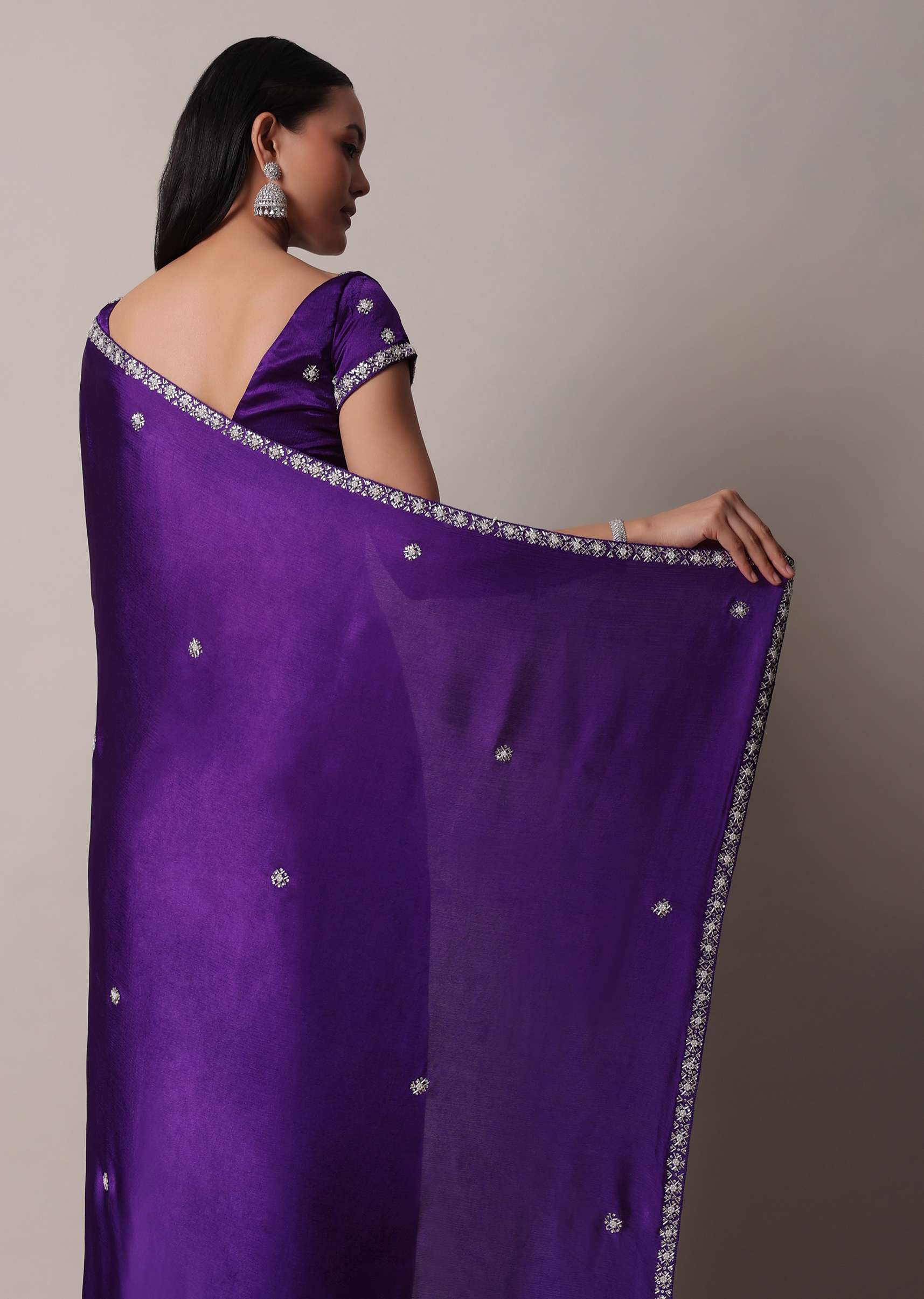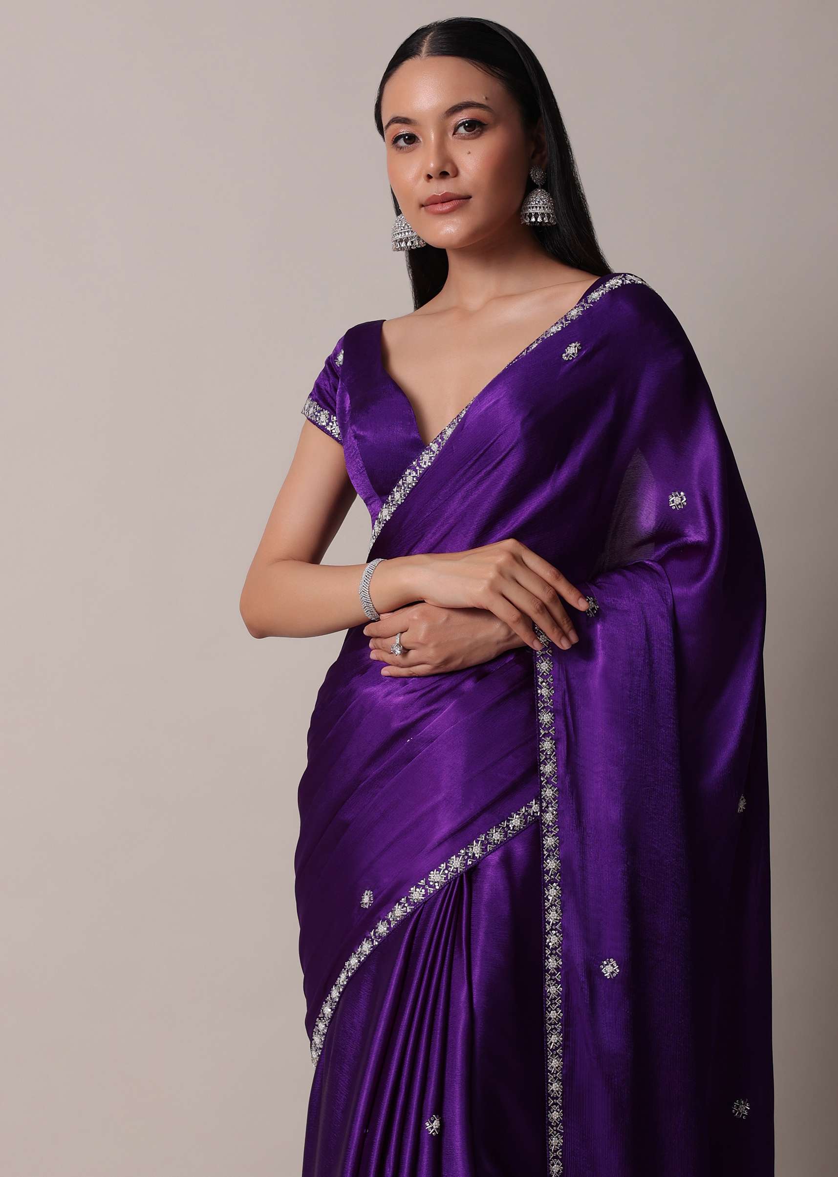 Purple Satin Chinon Saree With Stone Embellishments And Unstitched Blouse Piece