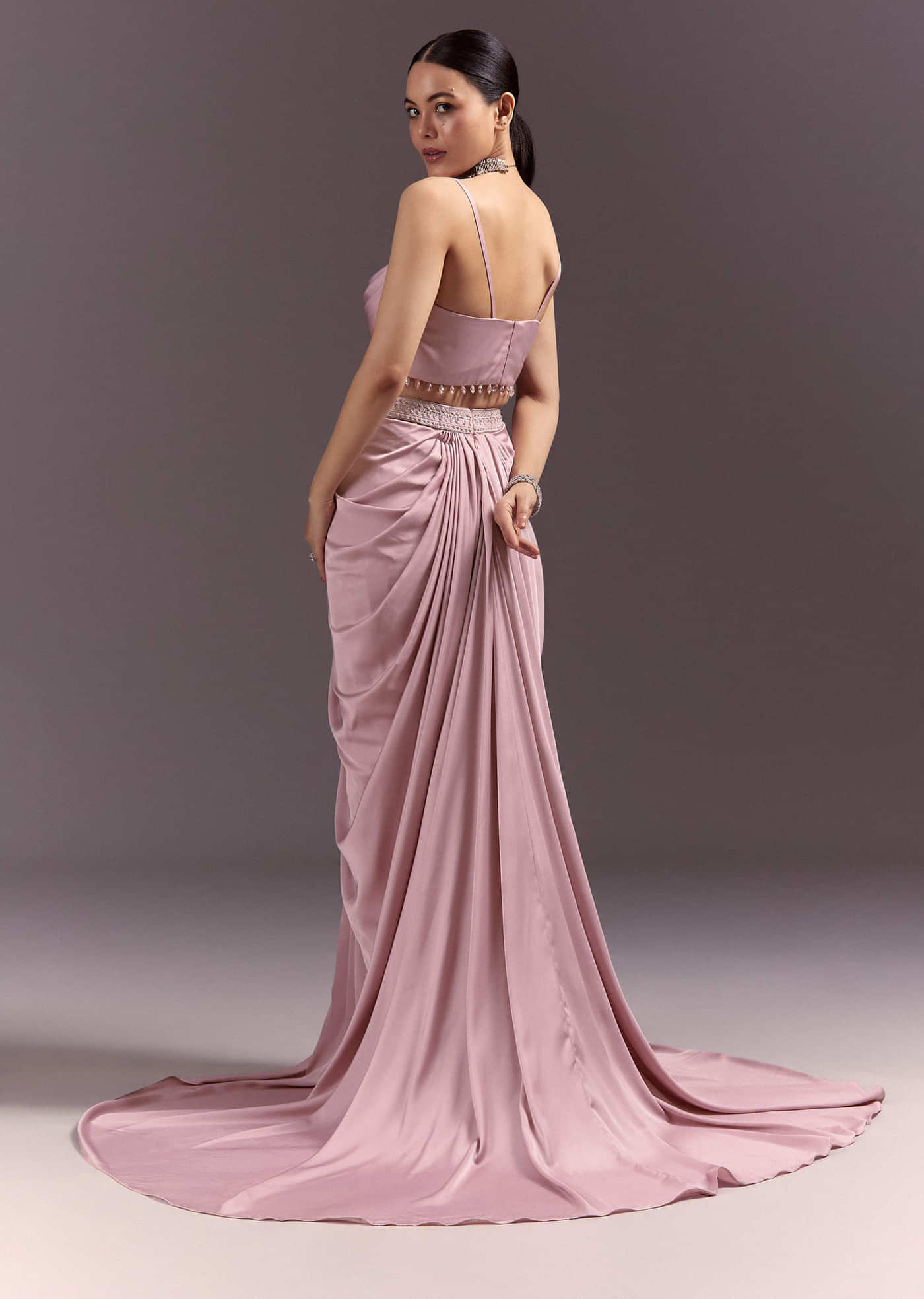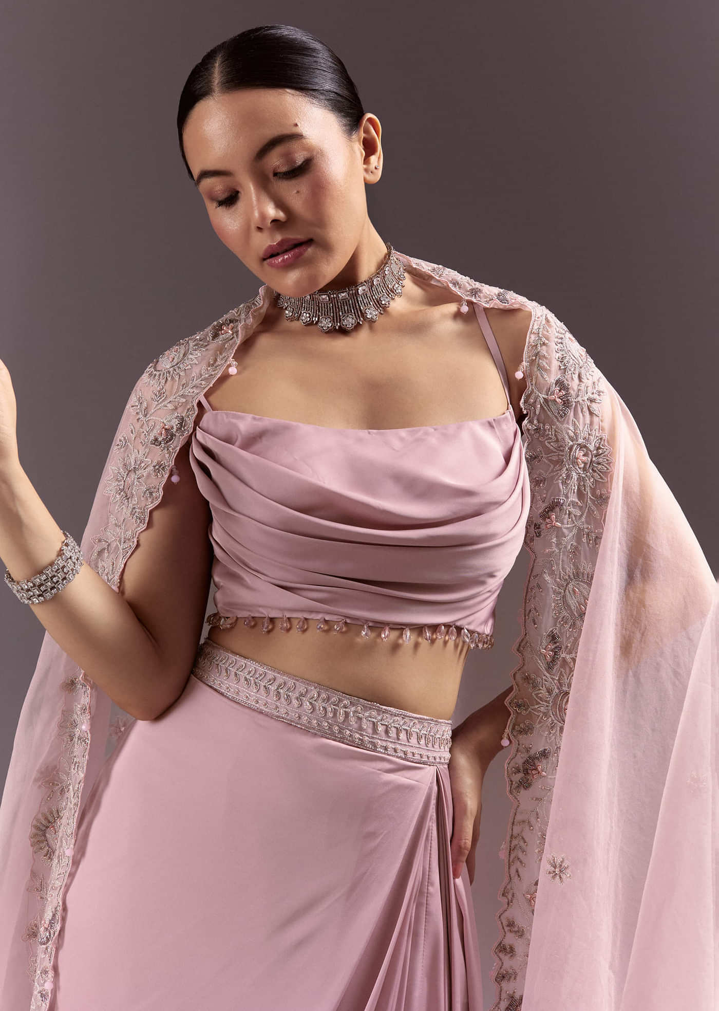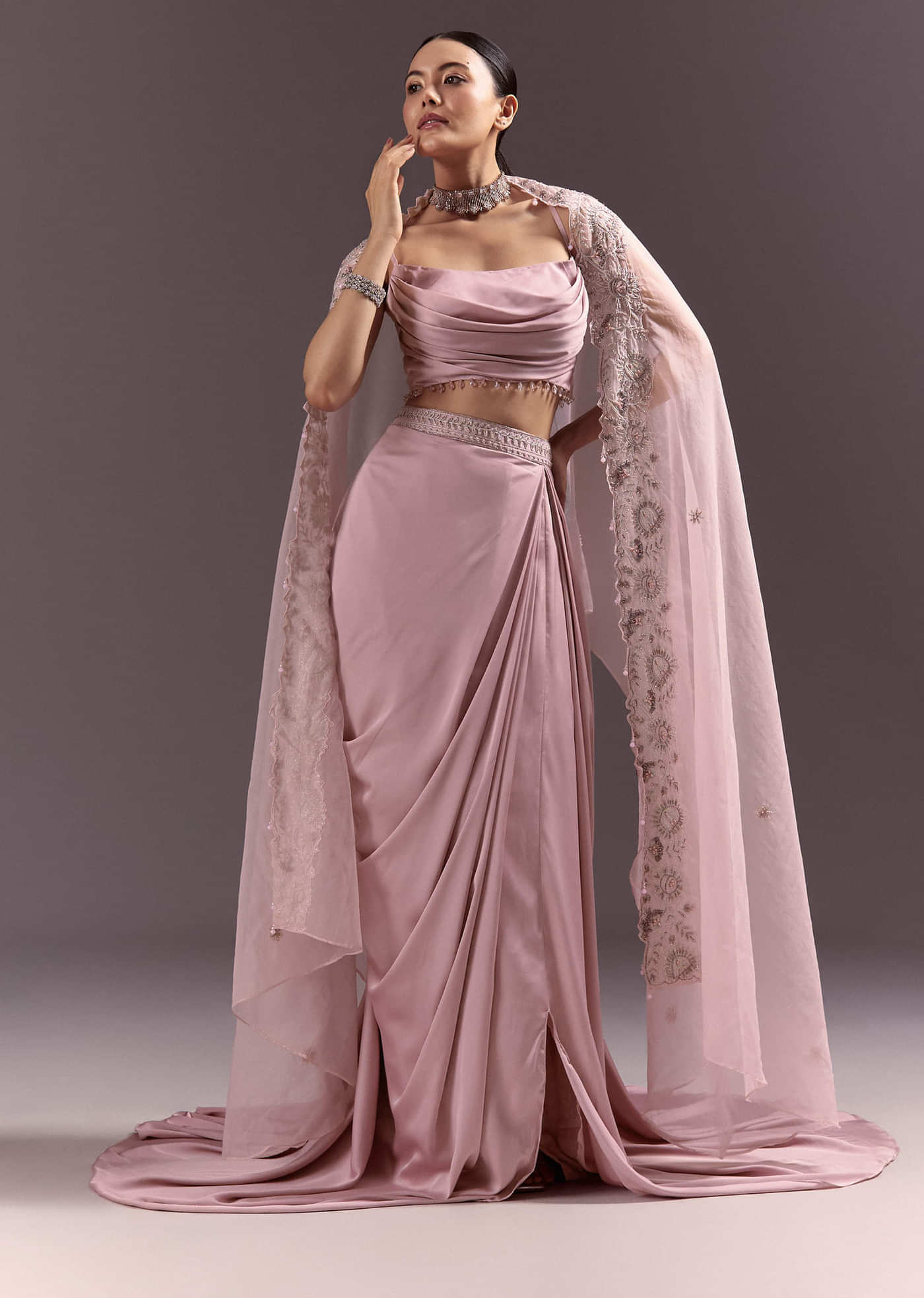 A fusion masterpiece in rich purple satin. Sequinned blouse sparkles under a soft net cape. Skirt adds volume and festivity to the silhouette. Crafted for sangeets or pre-wedding shoots. Awarded... More Product Details