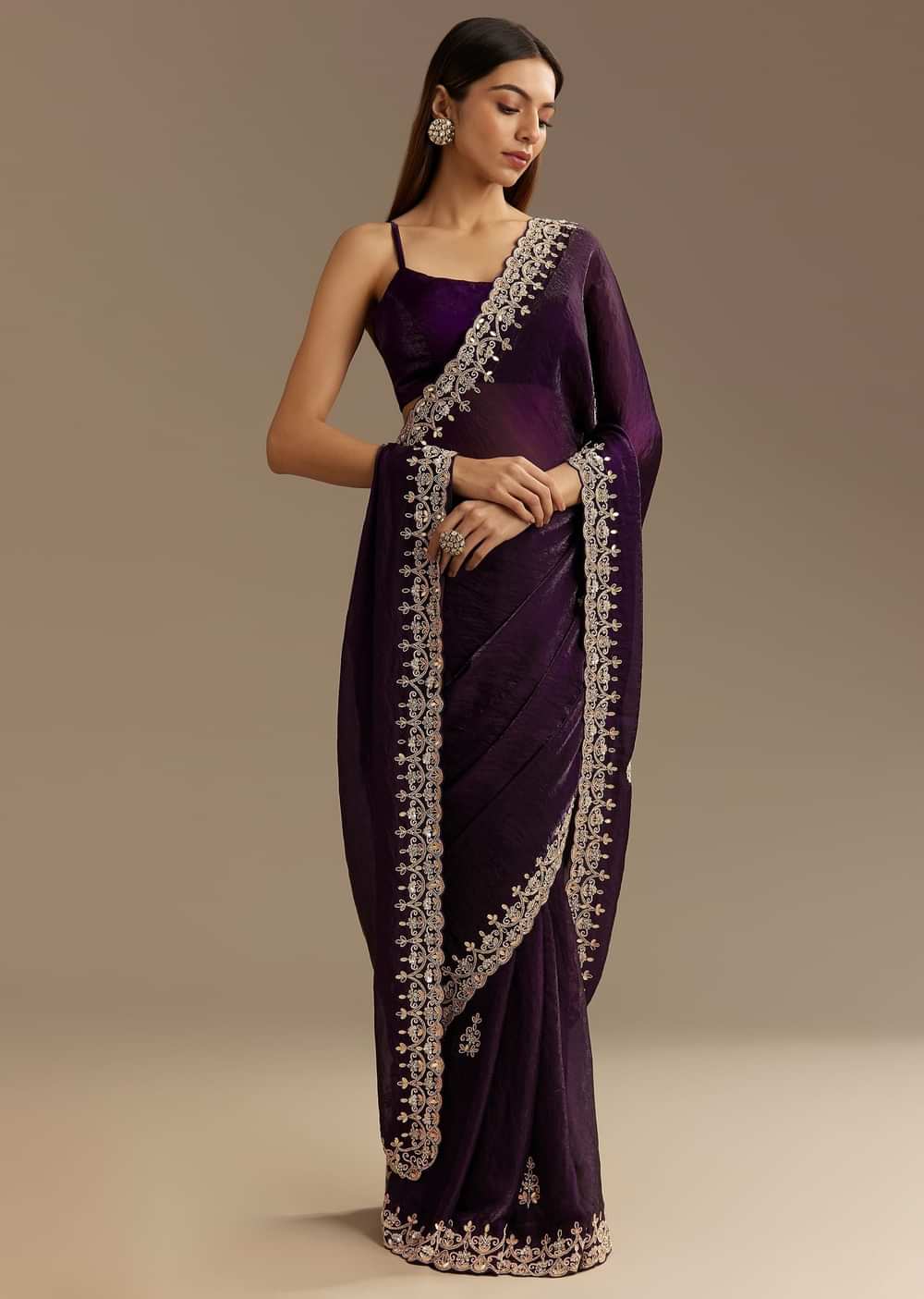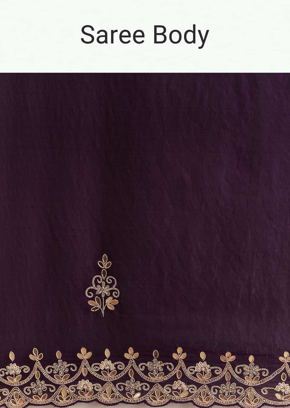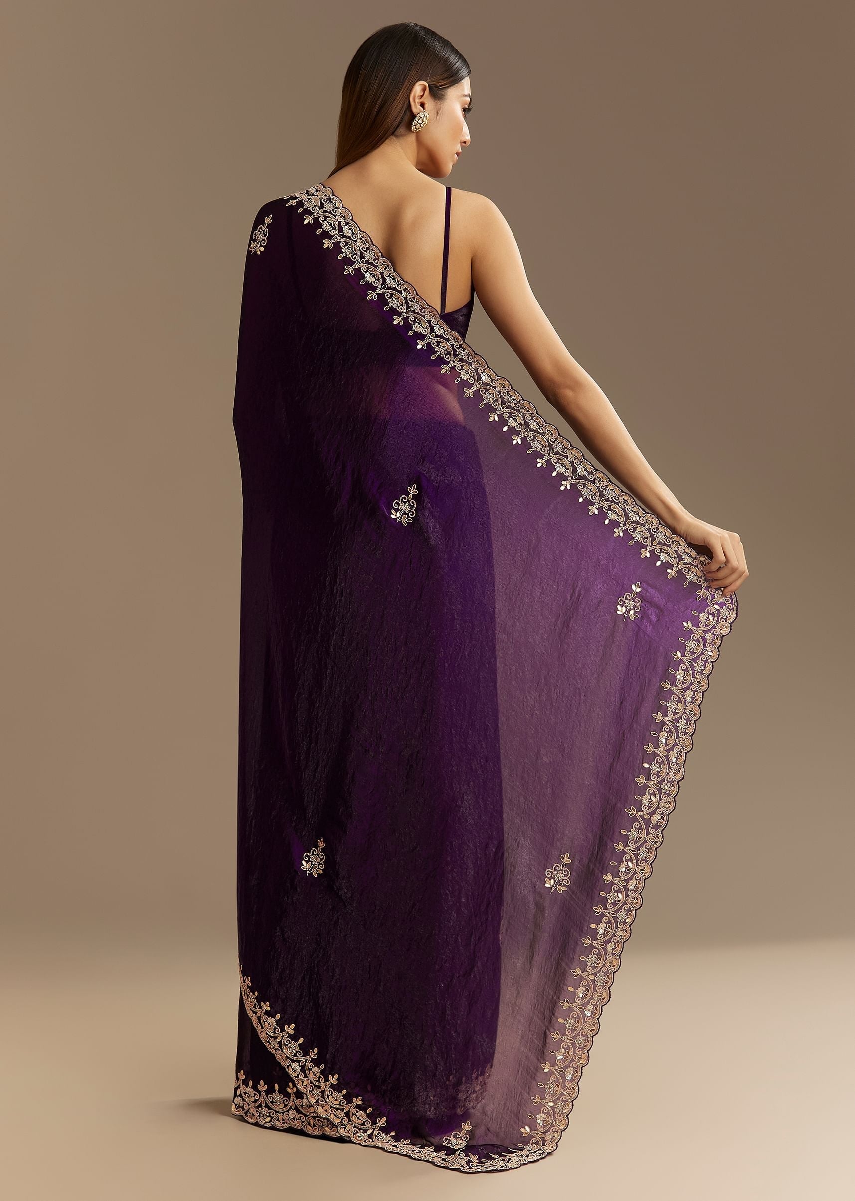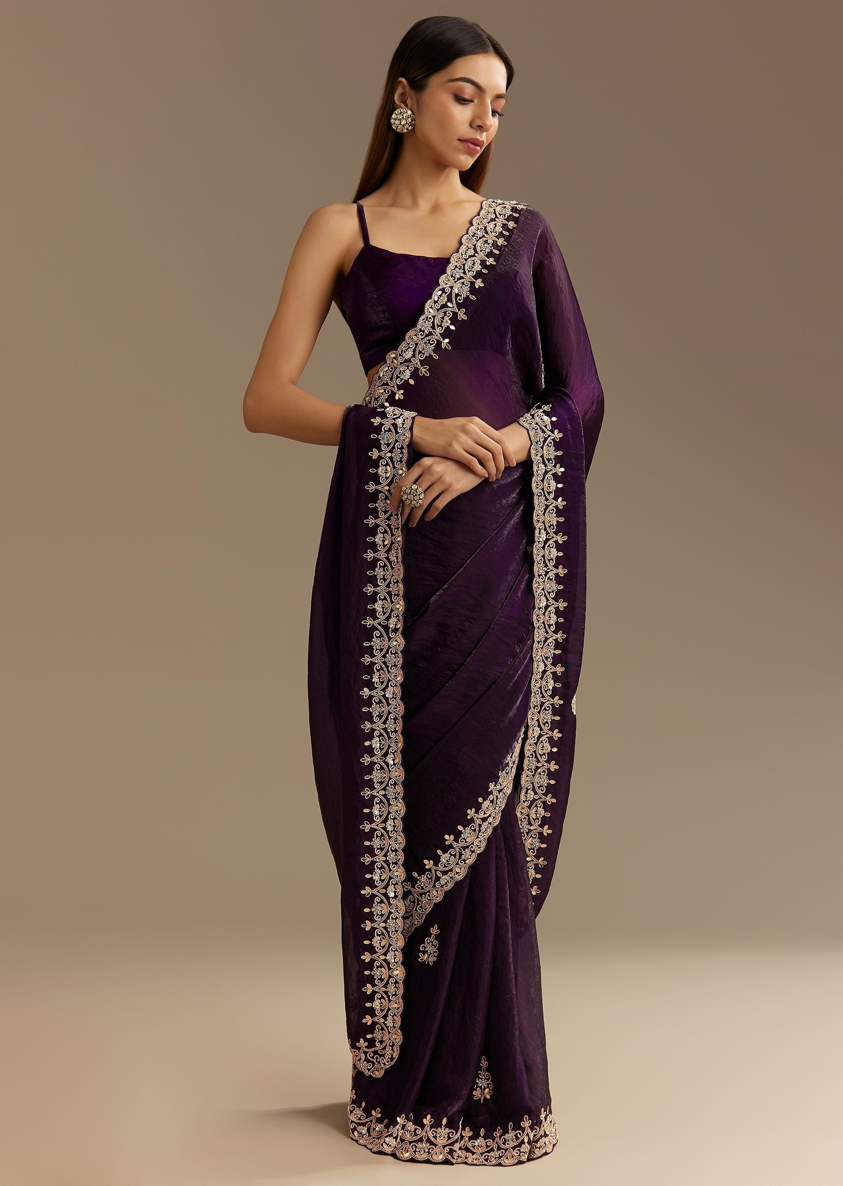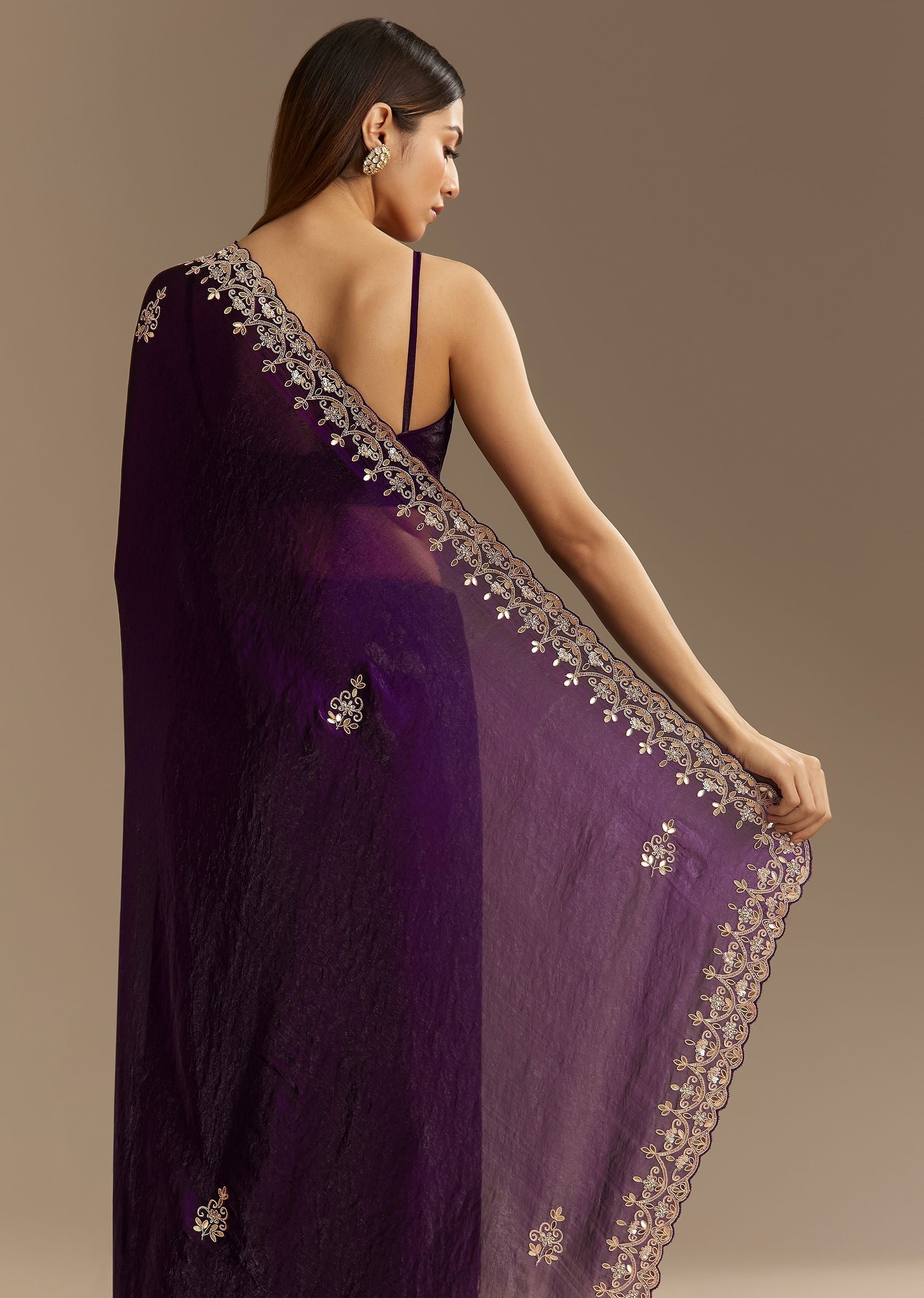 Indulge In Timeless Elegance With This Purple Satin Saree Adorned With Intricate Sequins Cutdana And Gotapatti Embroidery. The Deep Purple Hue Exudes Sophistication While The Scallop Border Enhances Its Regal Charm. The Smooth Satin Fabric Drapes Effortlessly Creating A Fluid Silhouette With A Luxurious Finish. Perfect For Weddings And Festive Occasions This Saree Is A Refined Statement Of Grace.Awarded As The Most Trusted Brand We'Re Delivering Styles You Love Just As Promised.
