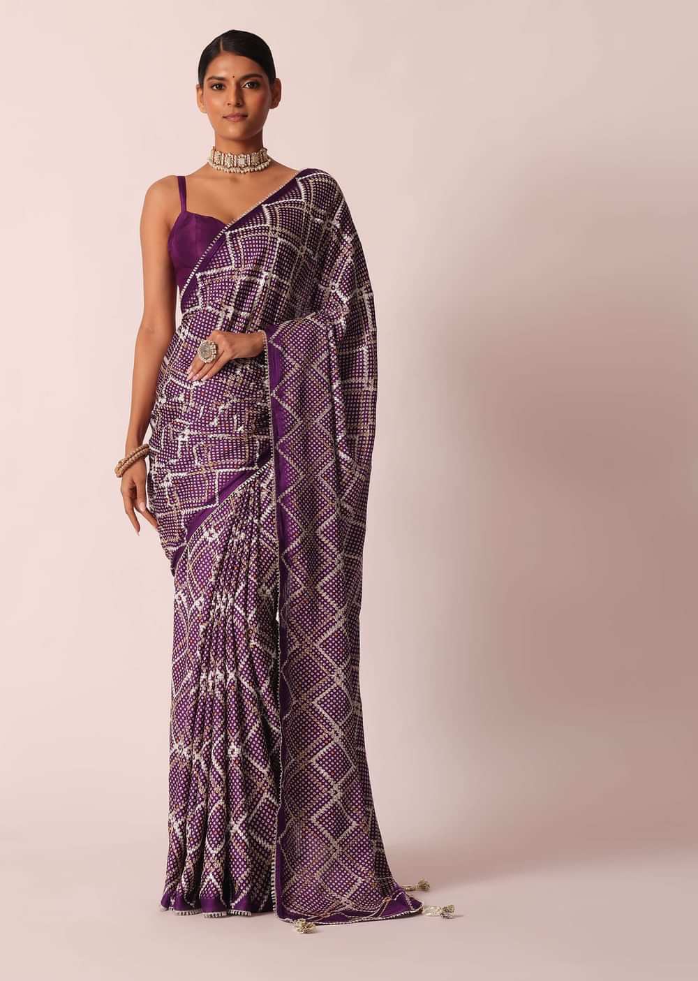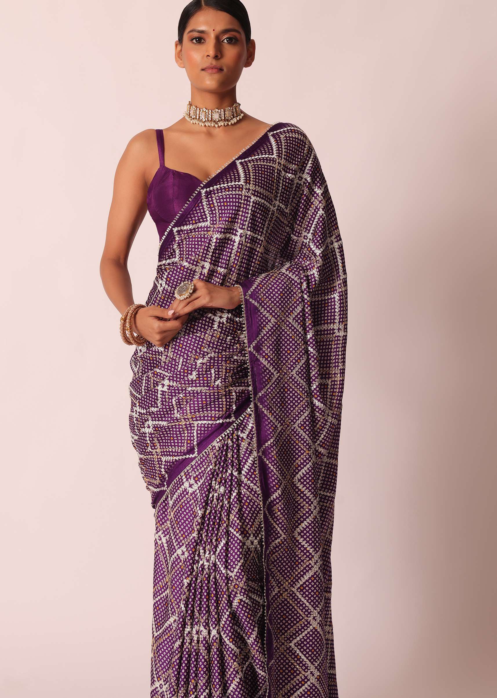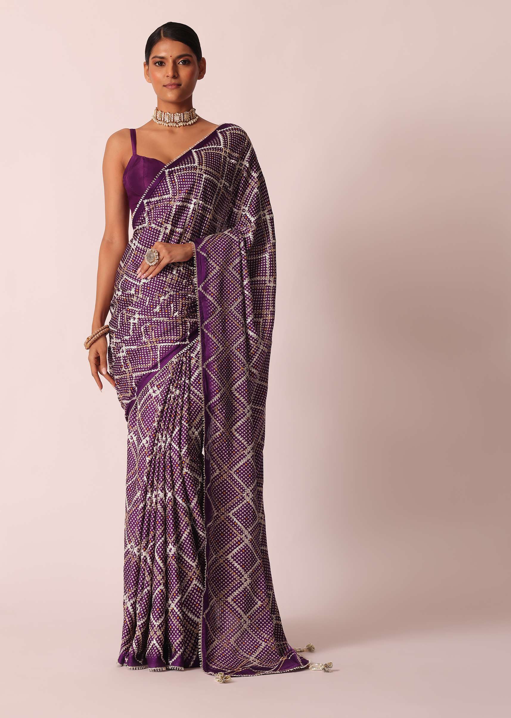 Purple Silk Bandhani Print Saree With Gota Embroidery And Unstitched Blouse Piece