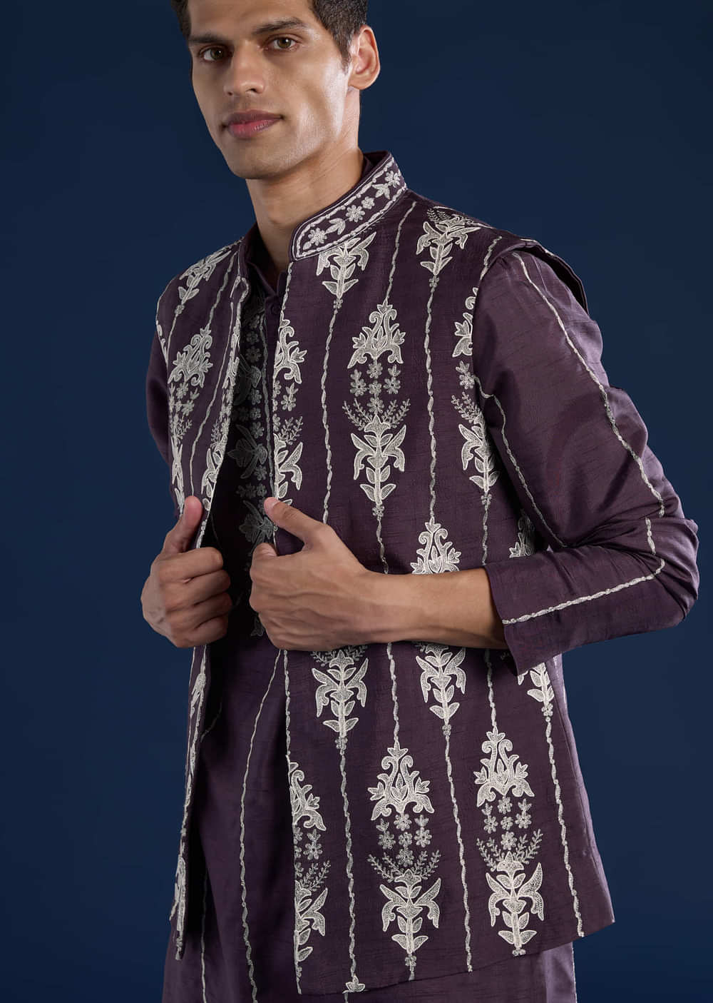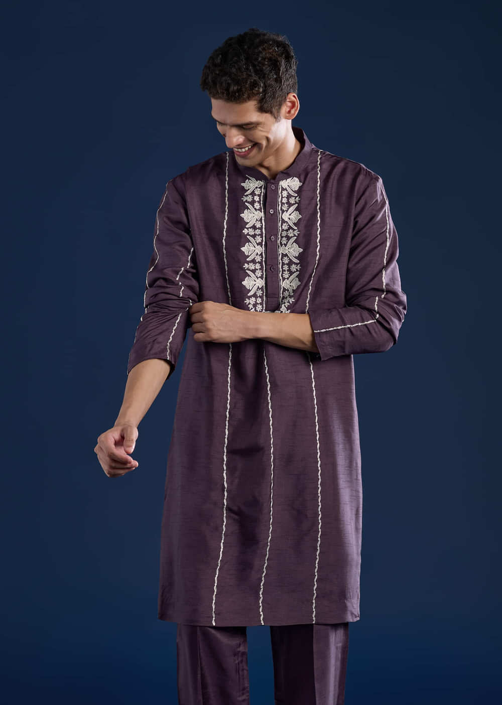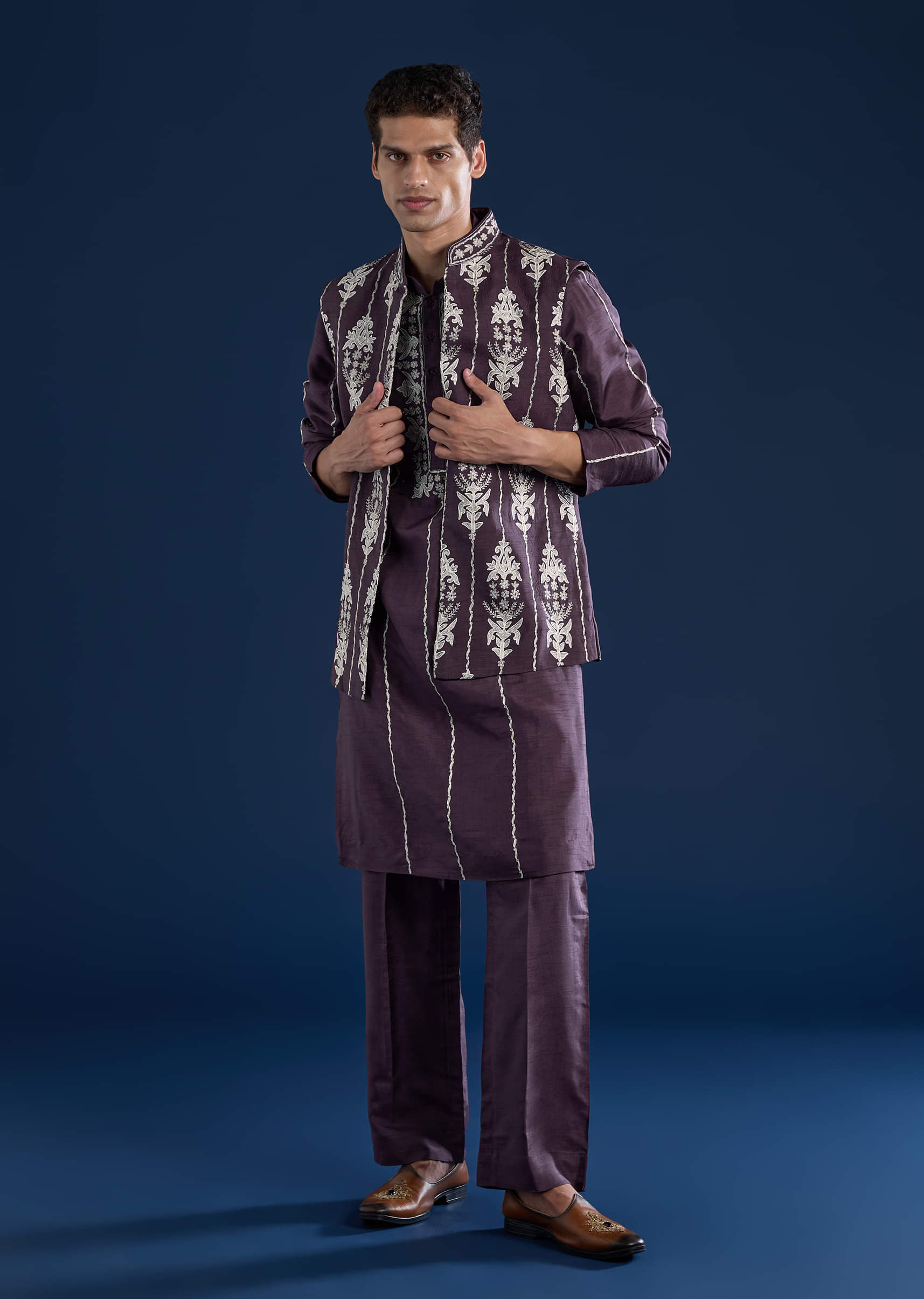 Infused with regal sophistication, this purple silk jacket and kurta set with matching pants reflects timeless elegance and craftsmanship. The rich silk fabric serves as the perfect canvas for intricate dori and zari embroidery, adding depth, texture, and a subtle metallic sheen. Ideal for weddings, receptions, or festive evenings, this ensemble effortlessly combines traditional artistry with a contemporary edge. Awarded as the Most Trusted Brand, we're delivering styles you love, just as promised.