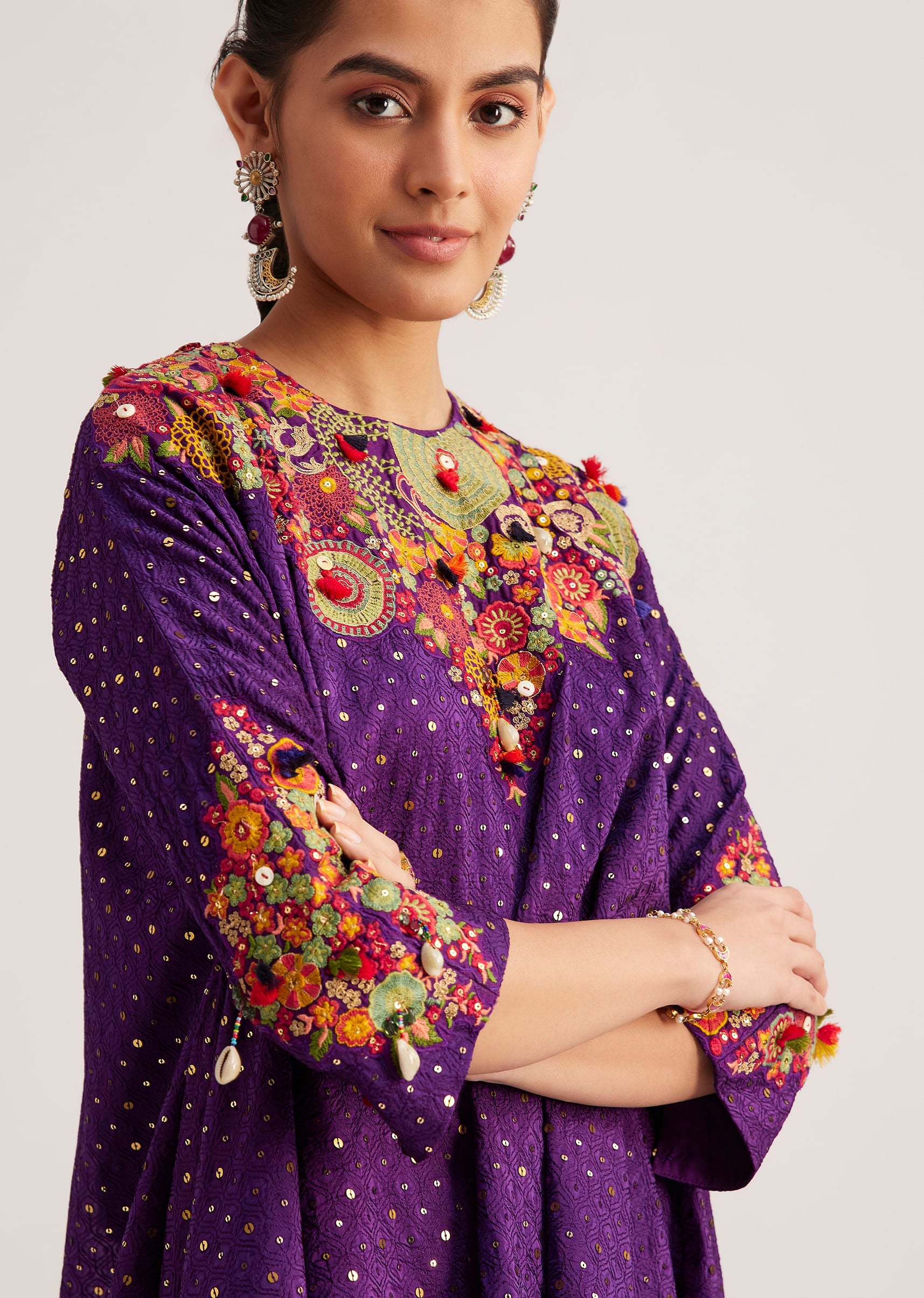 Purple Silk Kurta Dhoti Set With Resham Embroidery And Tassel Details