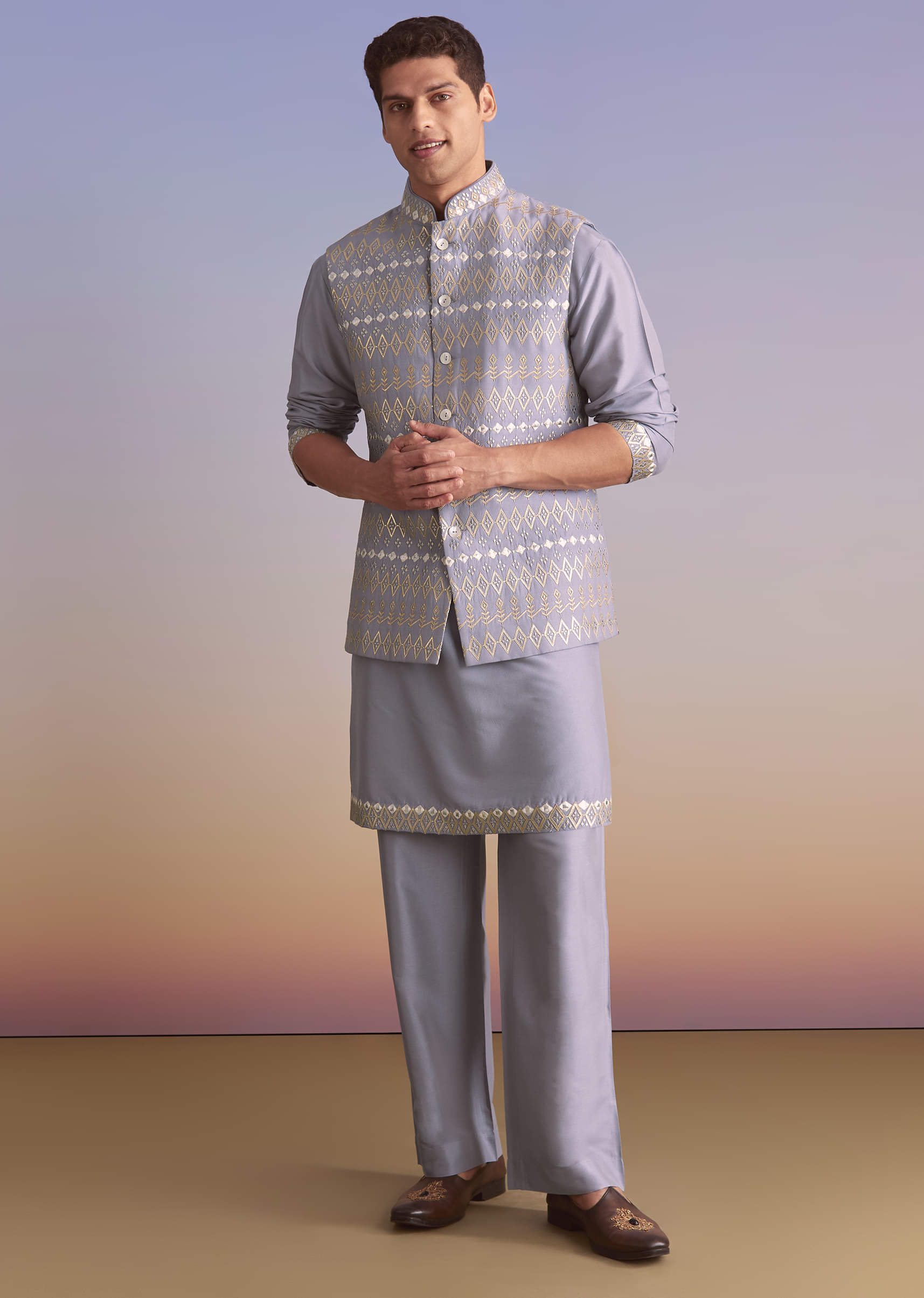 Purple Silk Kurta Jacket Set For Men With Mirror Zari And Resham Work