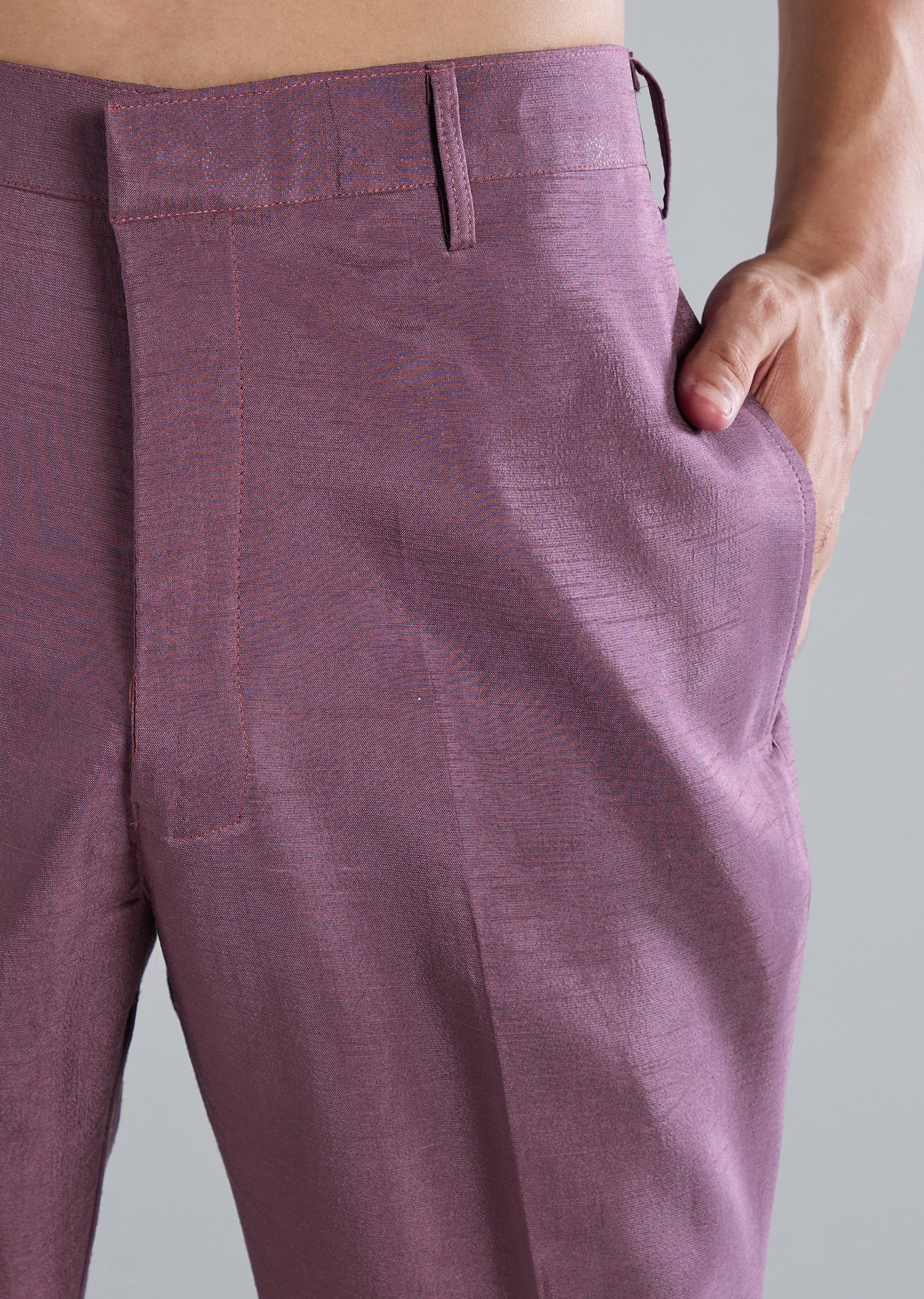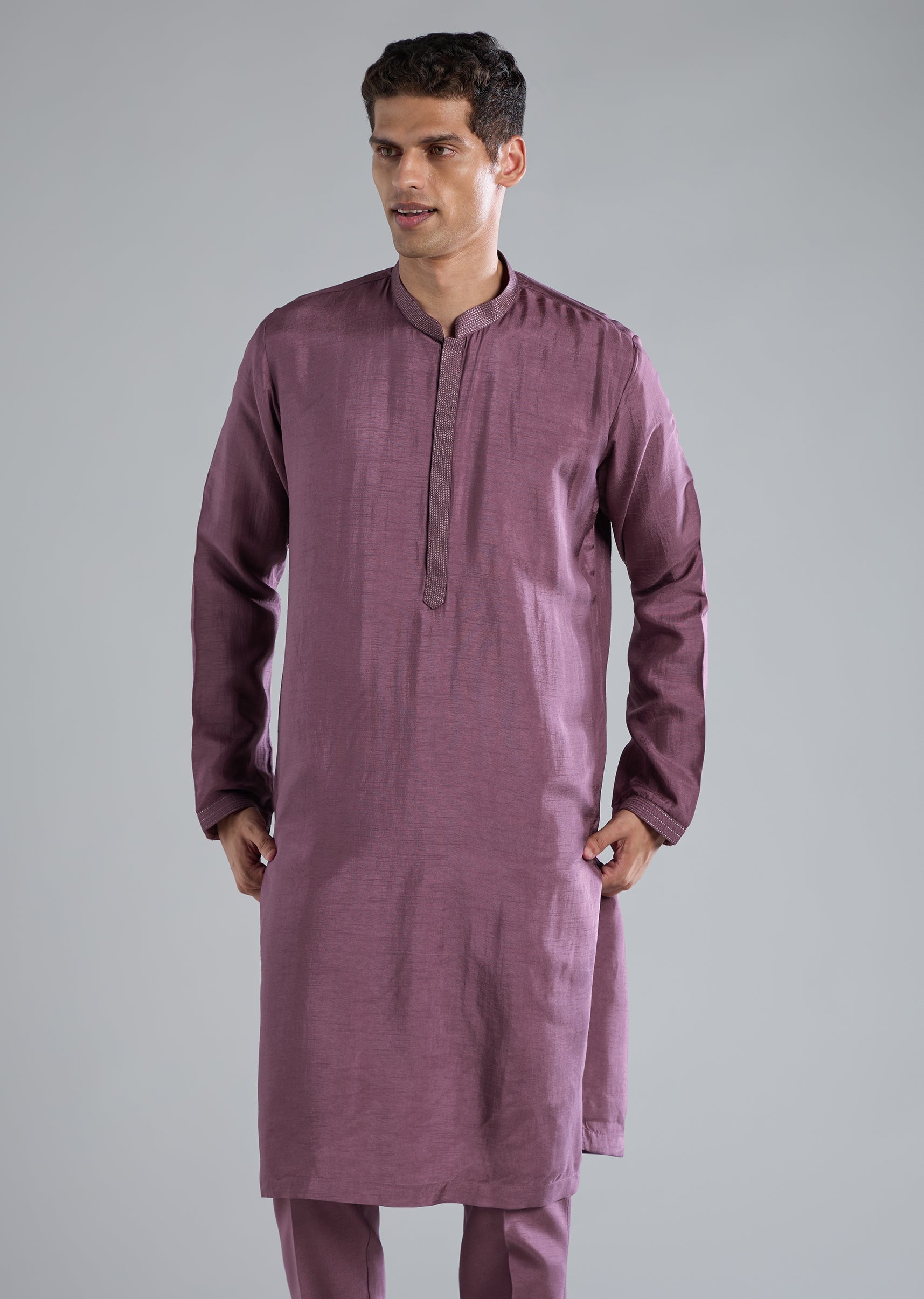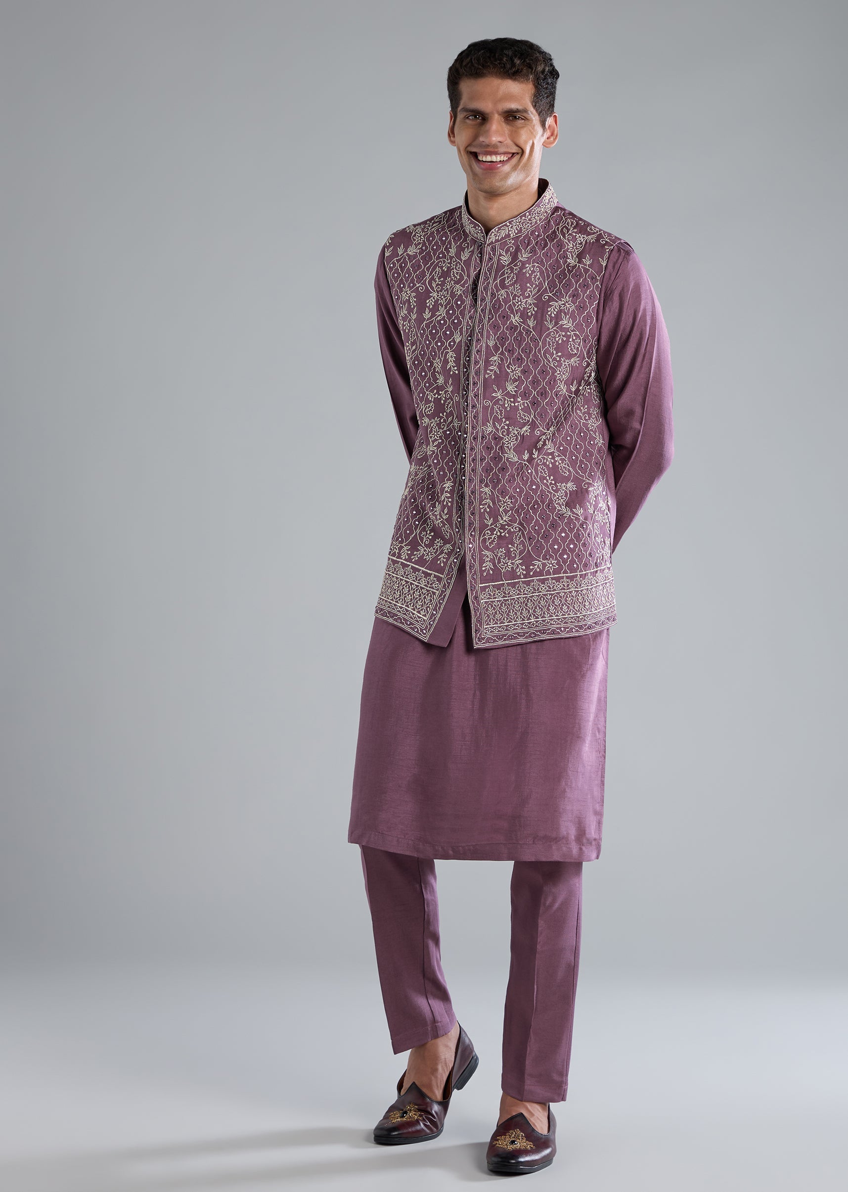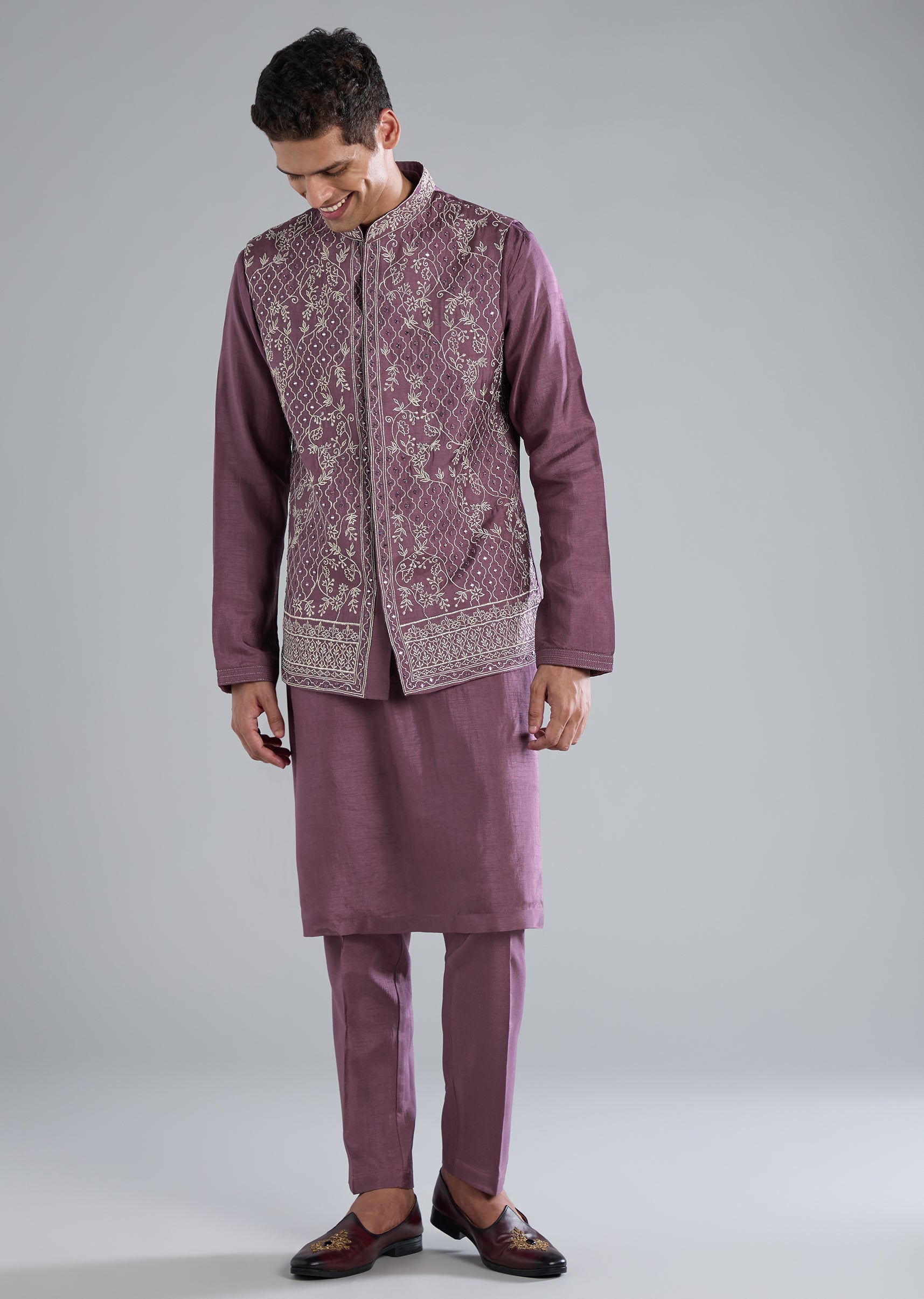 Crafted for festive elegance, this purple kurta jacket set blends premium silk with luxurious dola silk to create a rich and refined celebration look. The ensemble is adorned with delicate zari and mirror work that adds a luminous festive charm, making it the perfect choice for mehendi functions or attending a wedding as a stylish guest. The kurta features a mandarin collar, full sleeves, and a clean front hook eye closure for a polished silhouette. Coordinating bottoms and the matching jacket complete the set with effortless finesse.