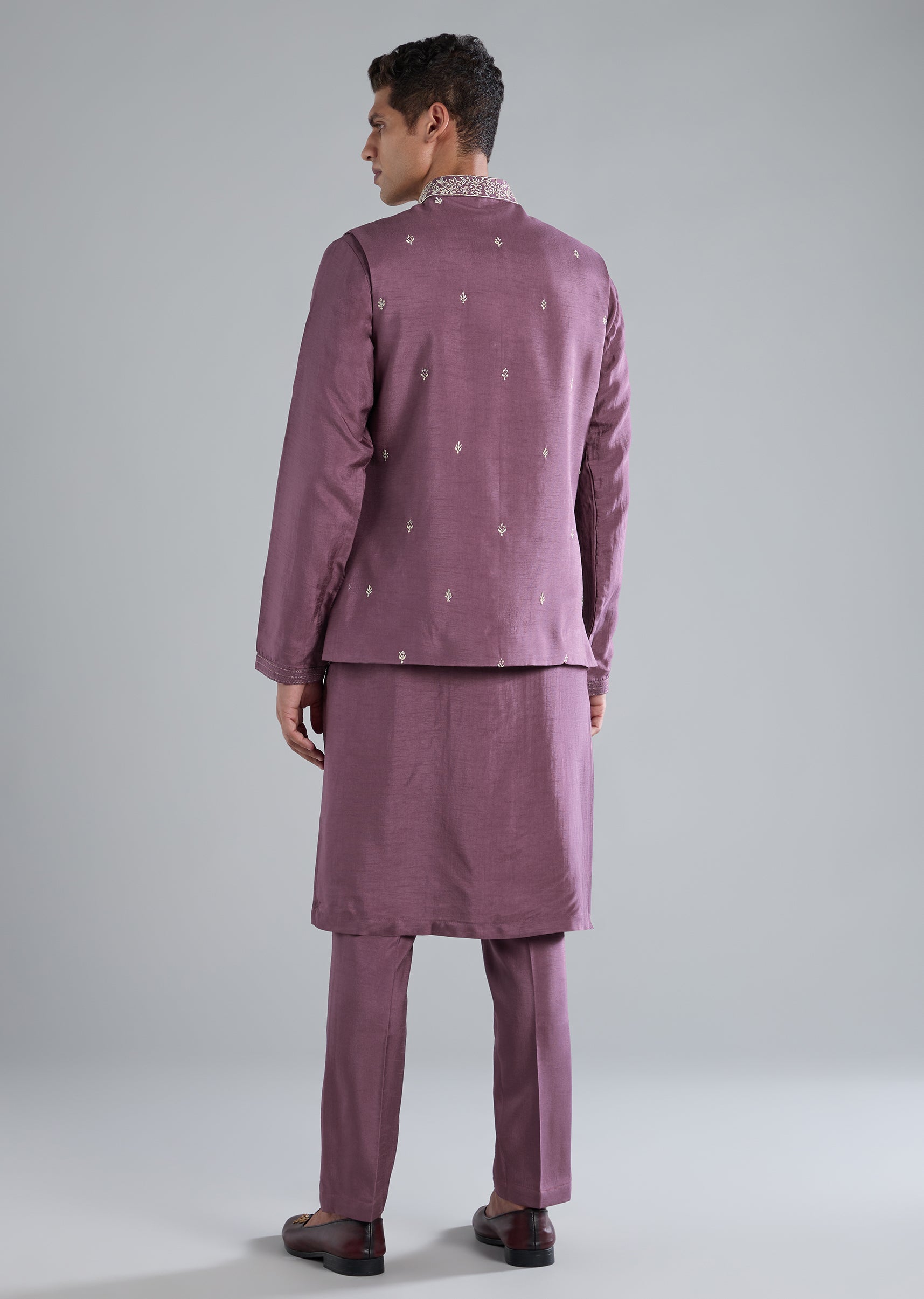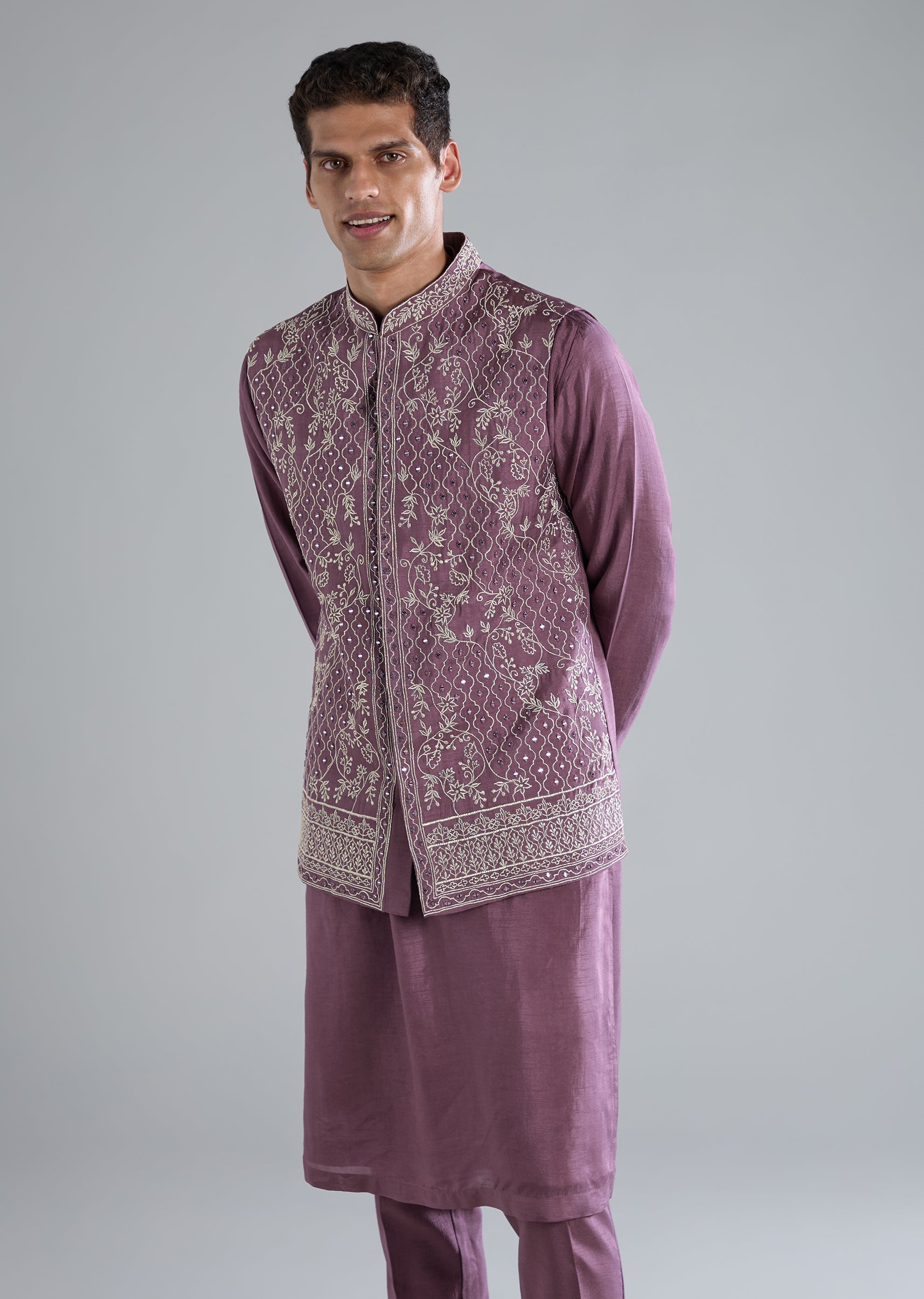 Purple Silk Kurta Jacket Set With Zari Mirror Work