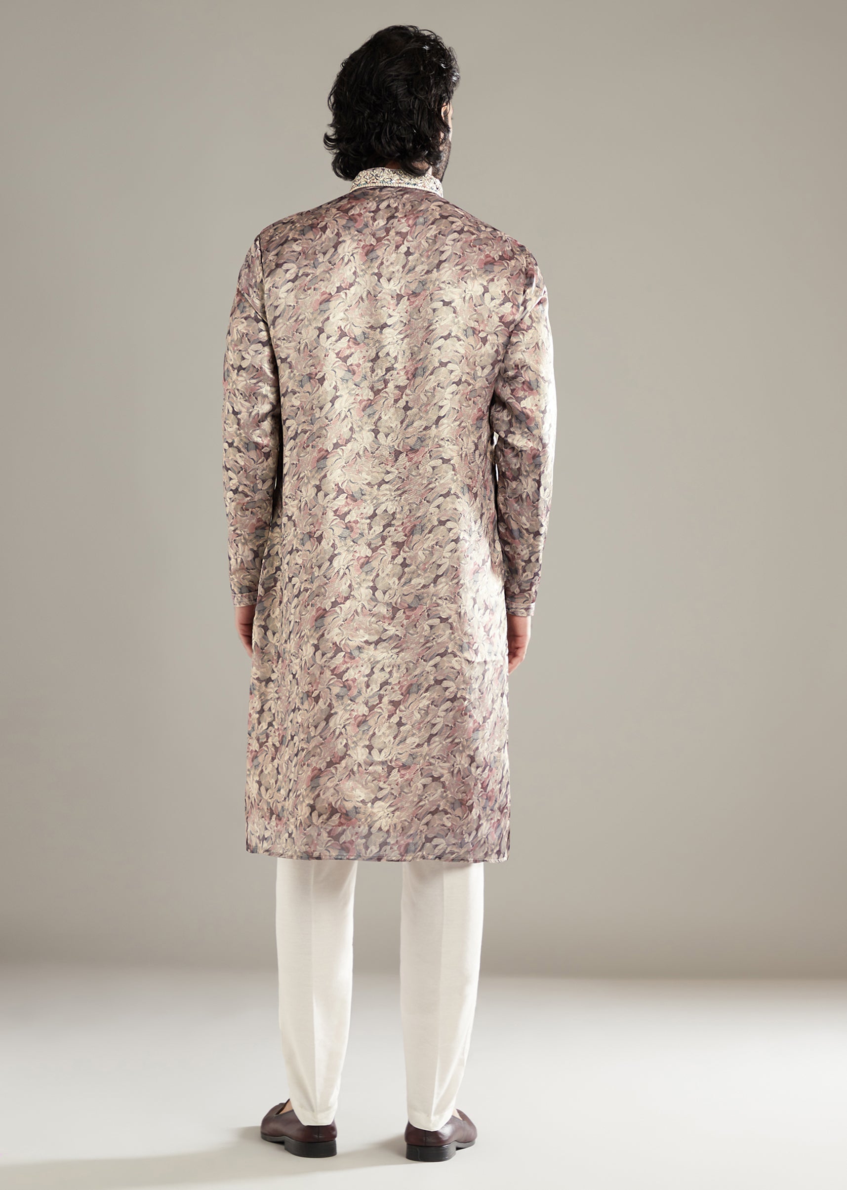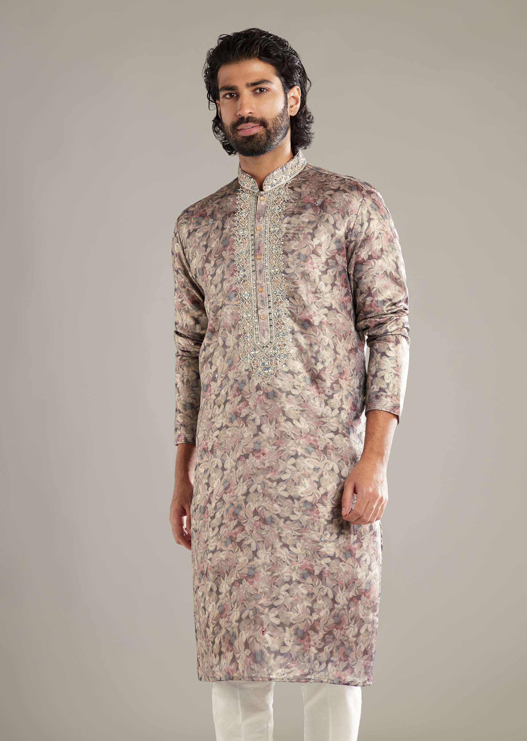 Purple Silk Kurta Set For Men With Floral Print Mirror And Resham Work