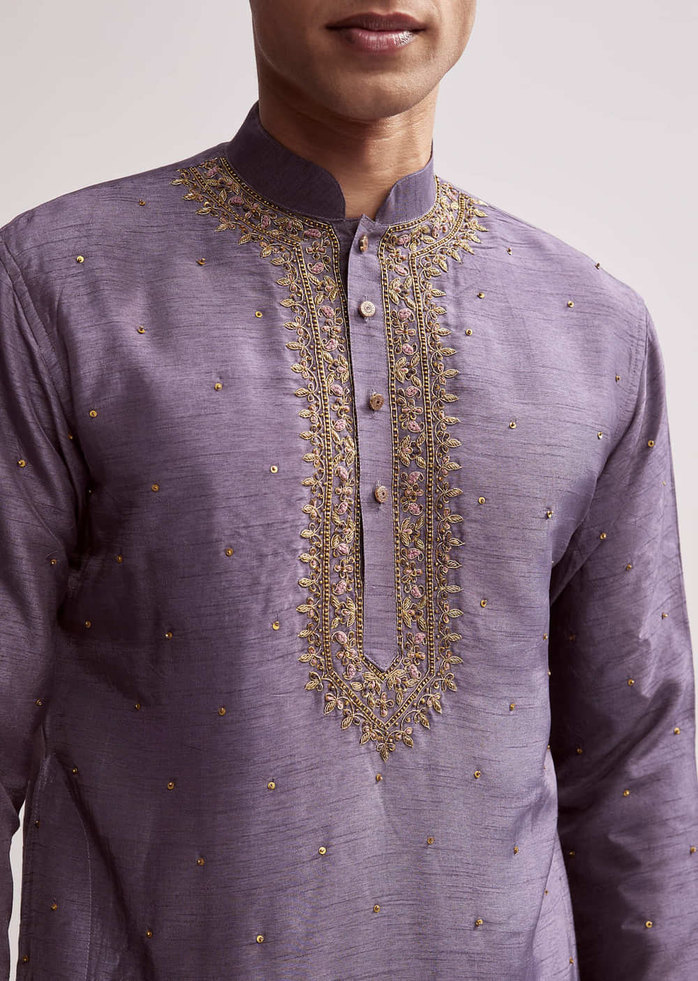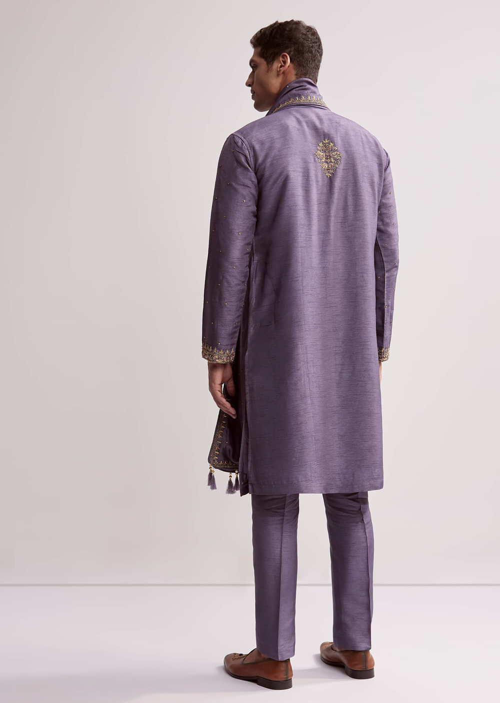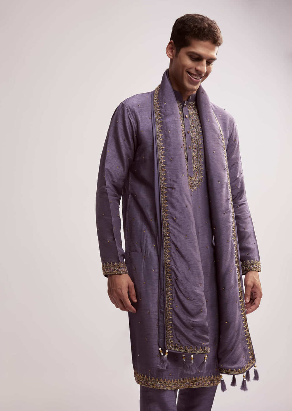 Deep purple makes a bold entry in this purple silk kurta set for men. Hand embroidery in zardosi, sequins, resham, and cutdana adds rich layers, while latkans on the dupatta bring festive energy. It is a perfect sangeet or engagement look for a groom or groomsman who wants to make a statement. Awarded as the Most Trusted Brand, we're delivering styles you love, just as promised.