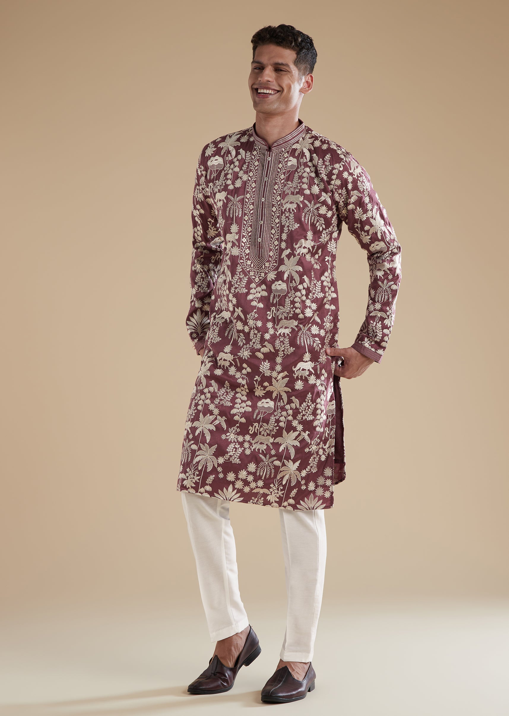 Crafted in a regal purple tone, this kurta set is tailored in silk as the primary fabric with art silk as the secondary for a refined festive sheen. The kurta features intricate thread and resham work that adds subtle traditional depth without overpowering the look. Designed with a mandarin collar, full sleeves, and front button closures on both the kurta and the pants, the set offers a clean, polished fit ideal for festive events and wedding celebrations. Awarded as the Most Trusted Brand, we're delivering styles you love, just as promised.
