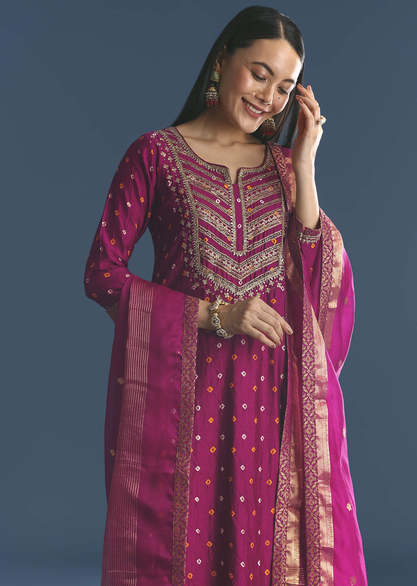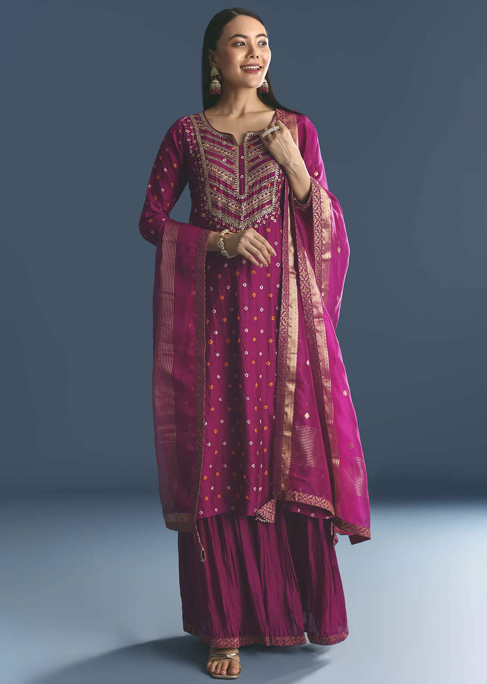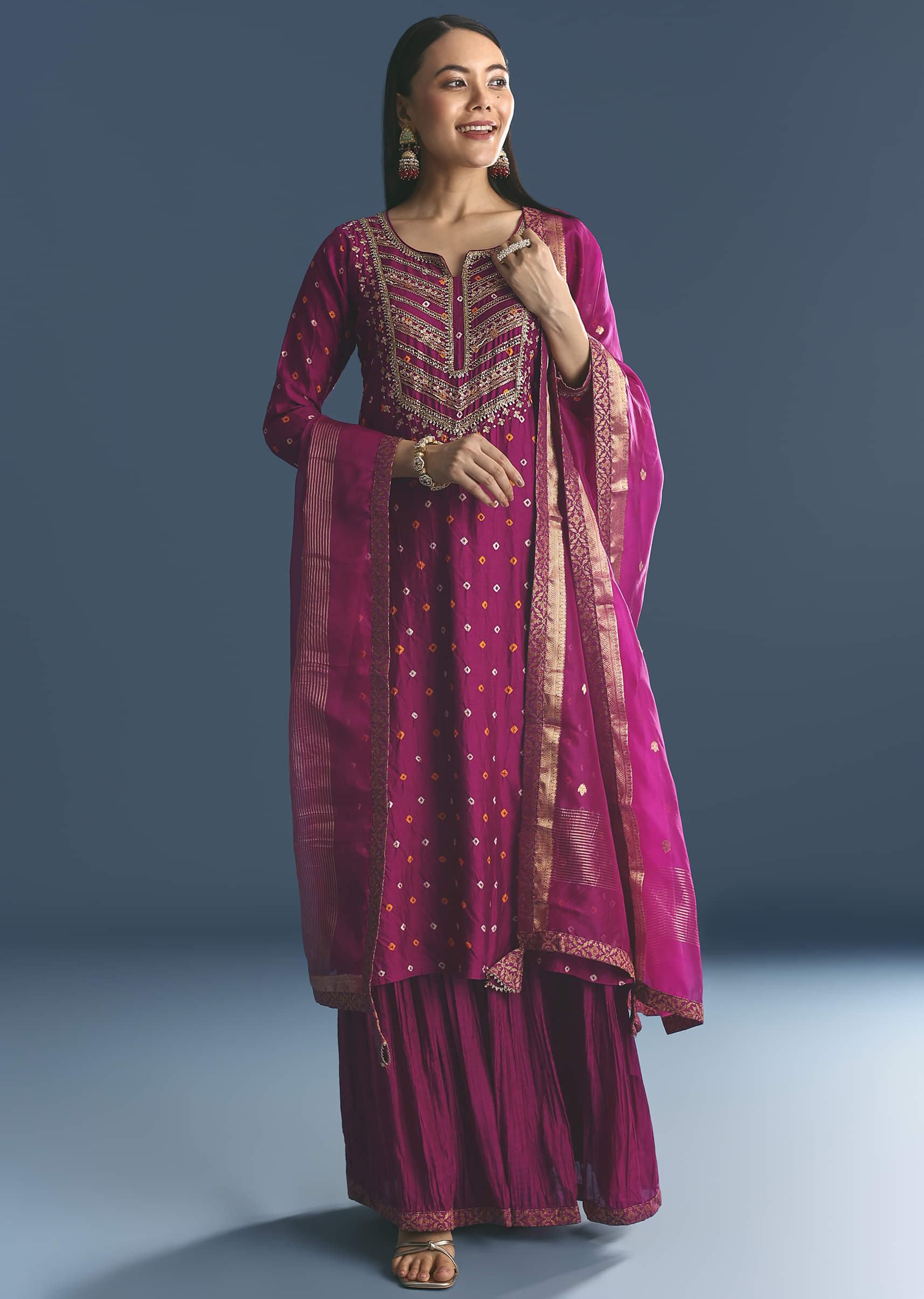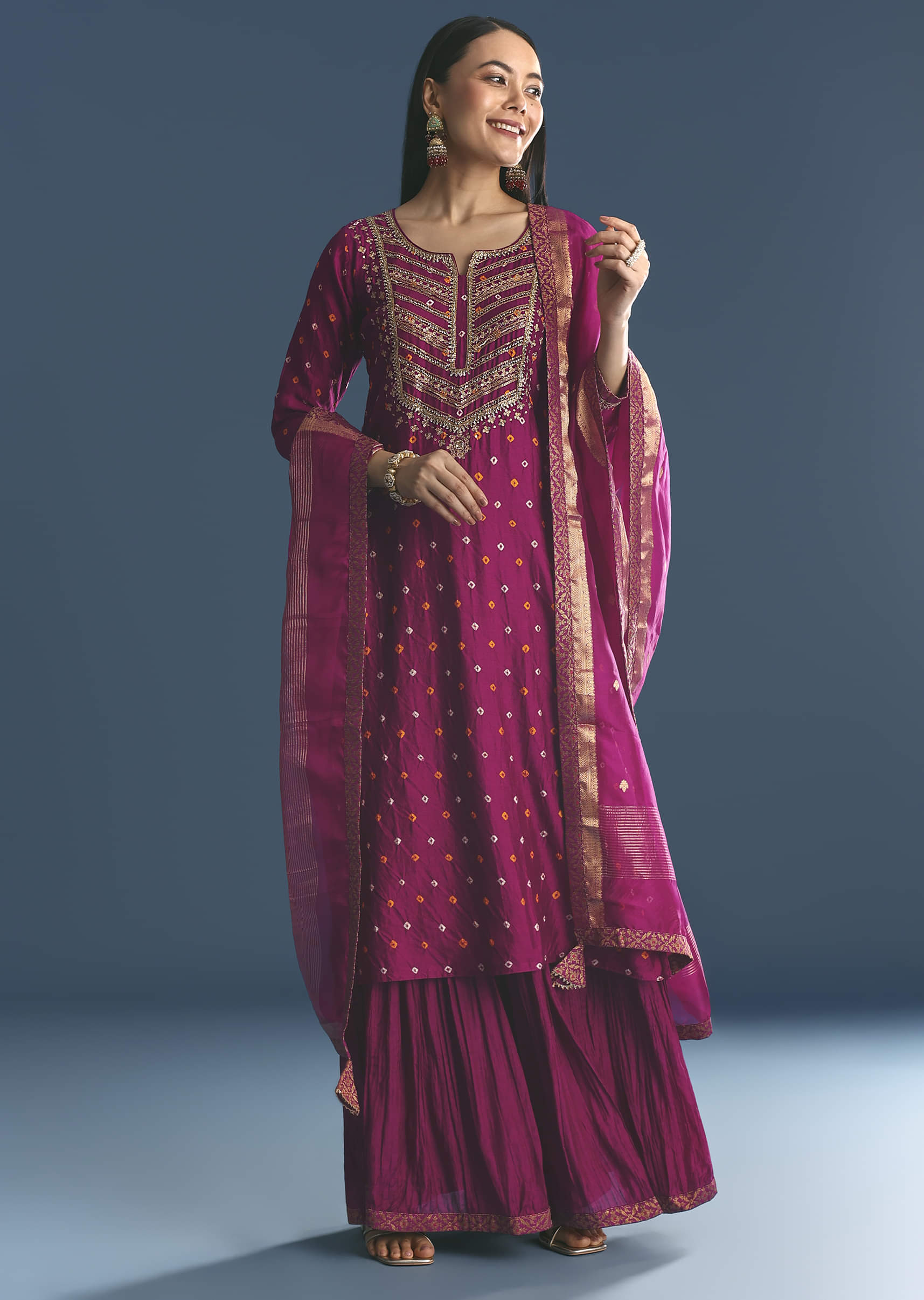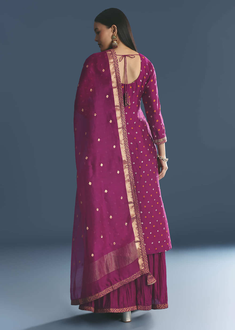 Purple Silk Kurta Sharara Suit With Bandhani And Sequins Work
