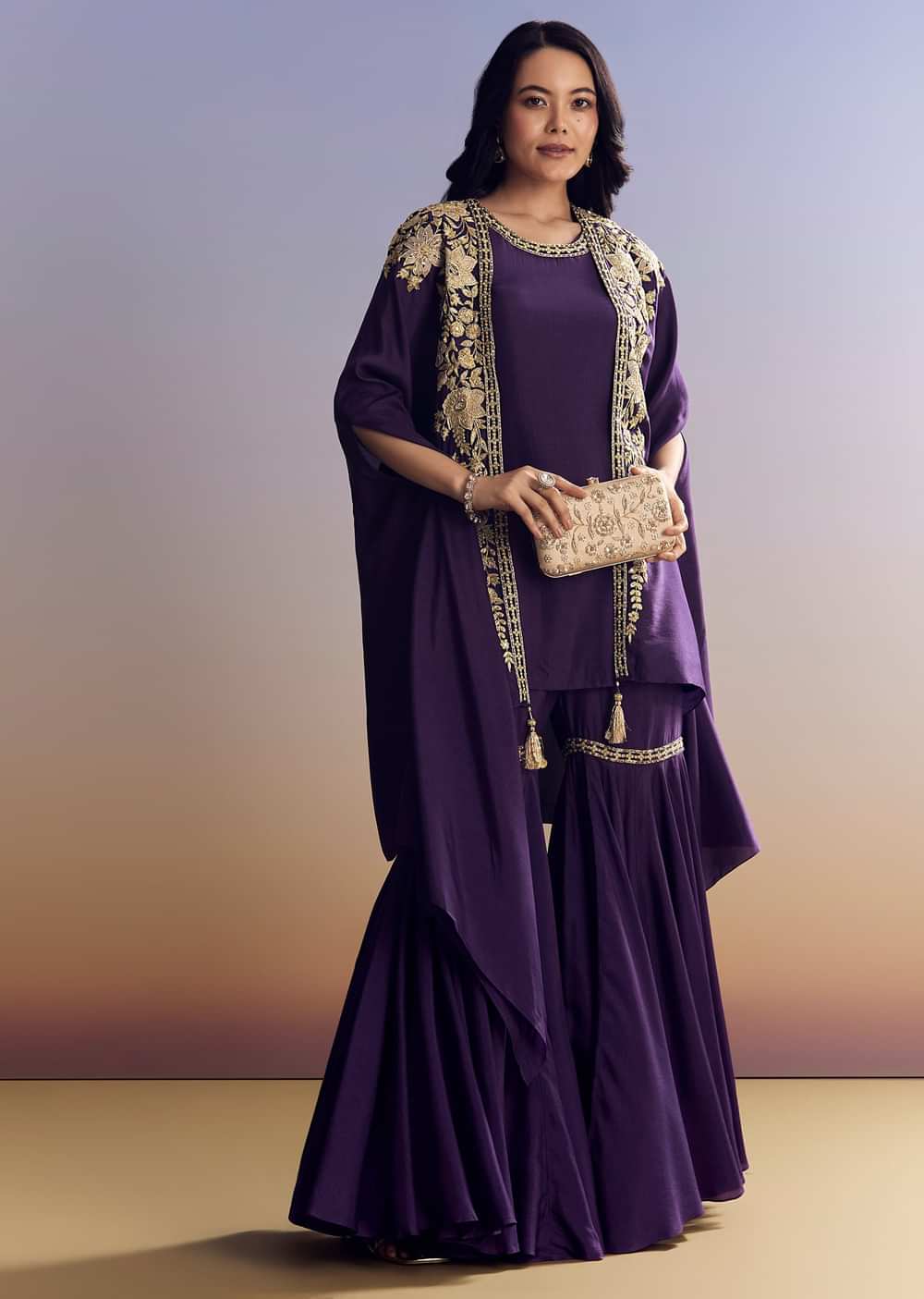 Rich purple Russian silk suit featuring ?? sleeves, round neckline, sharara, and matching zari-adorned cape. Graceful and contemporary for engagement or sangeet gatherings. Awarded as the Most Trusted Brand, we're... More Product Details