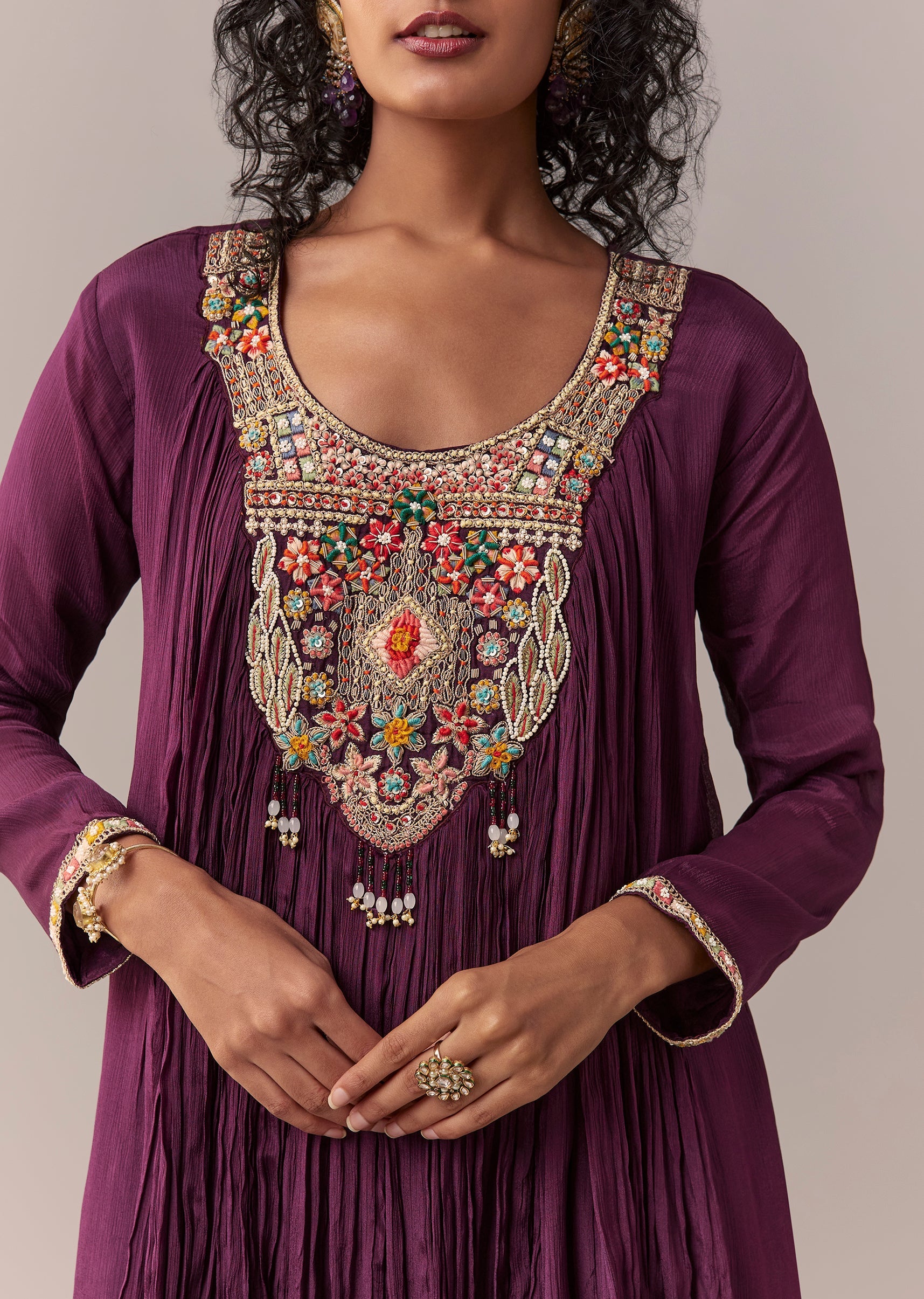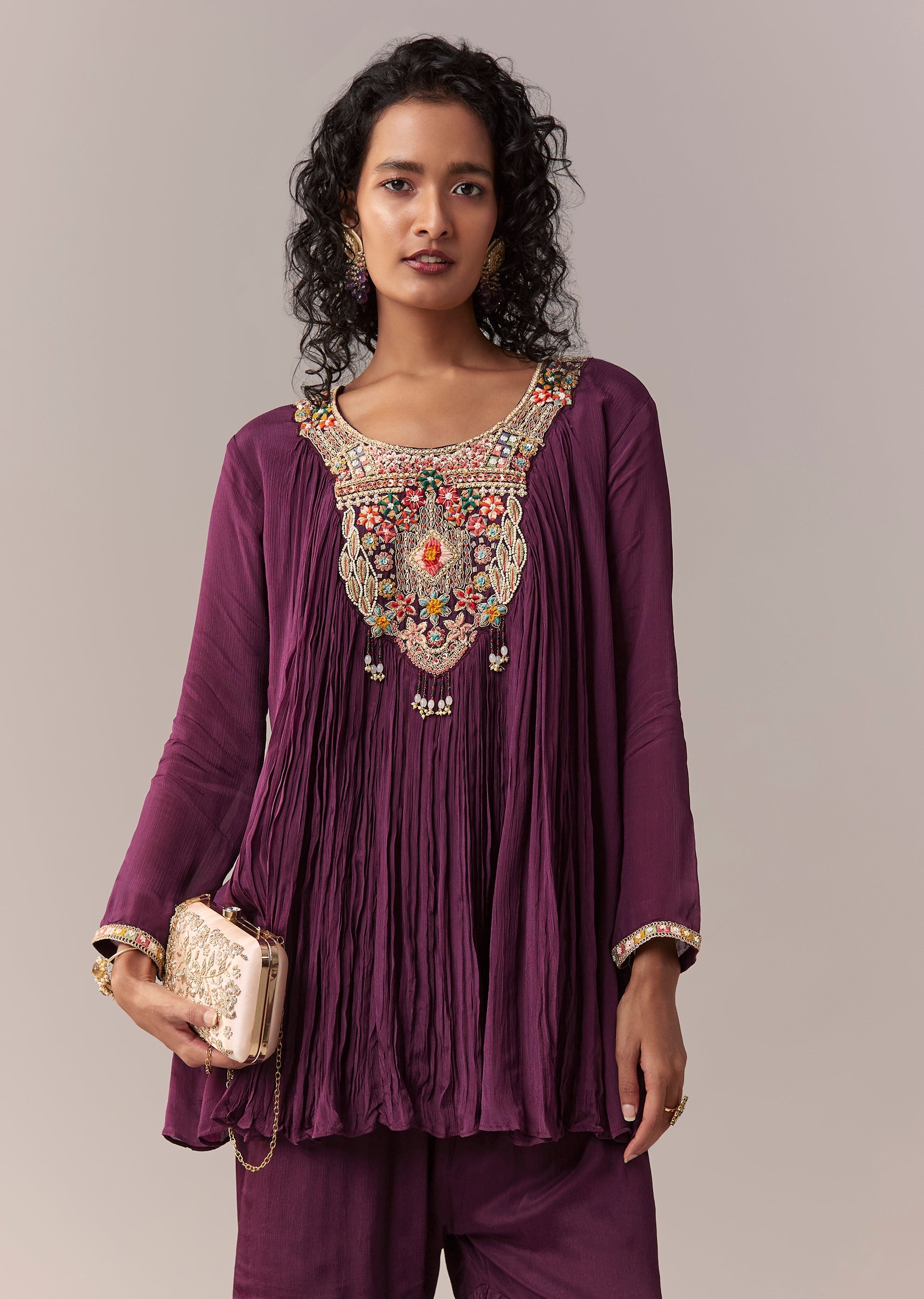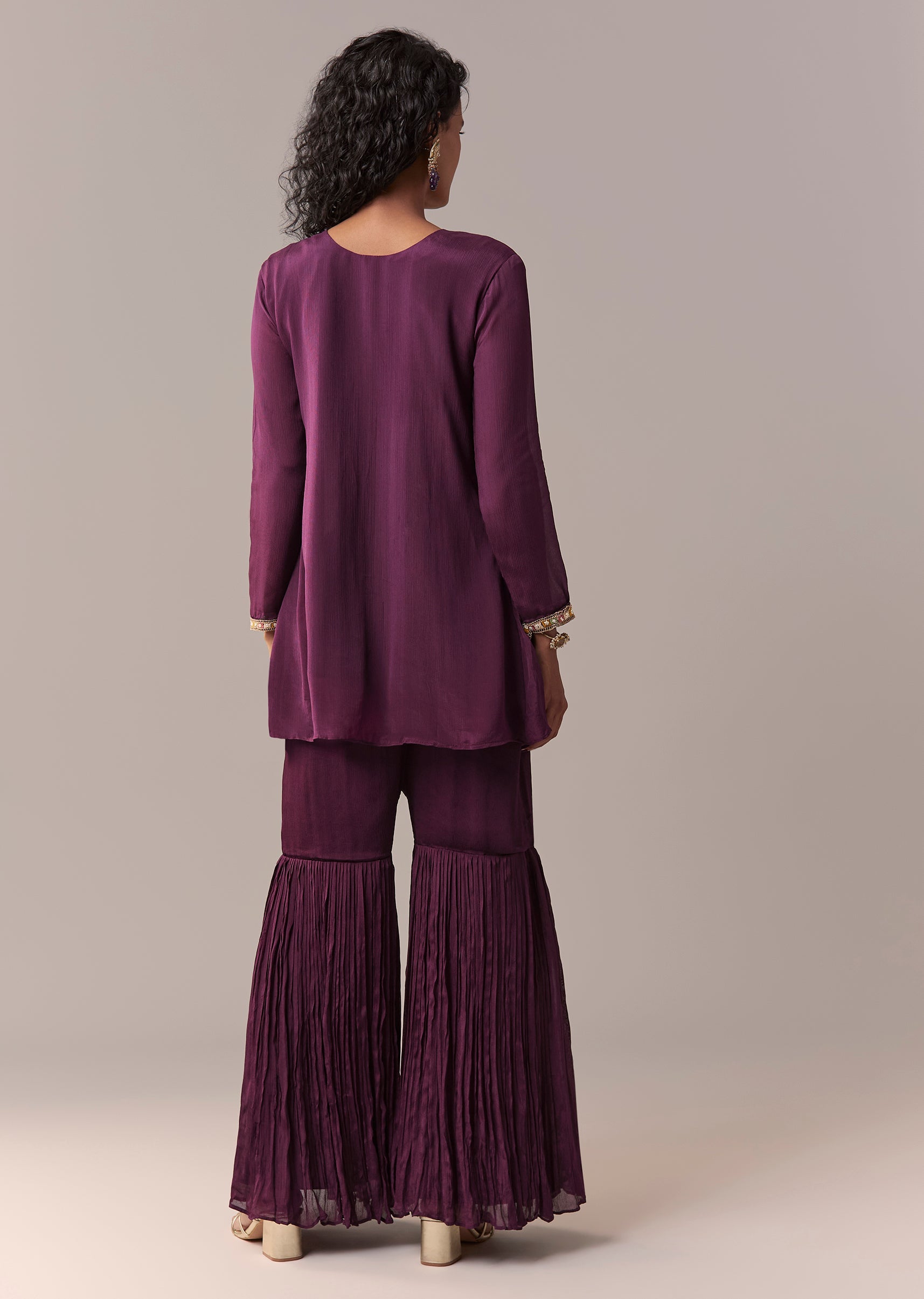 Designed in airy chinon, this purple sharara set brings a modern silhouette with festive finesse. The cape-style top features intricate thread and moti work, styled with full sleeves and a... More Product Details