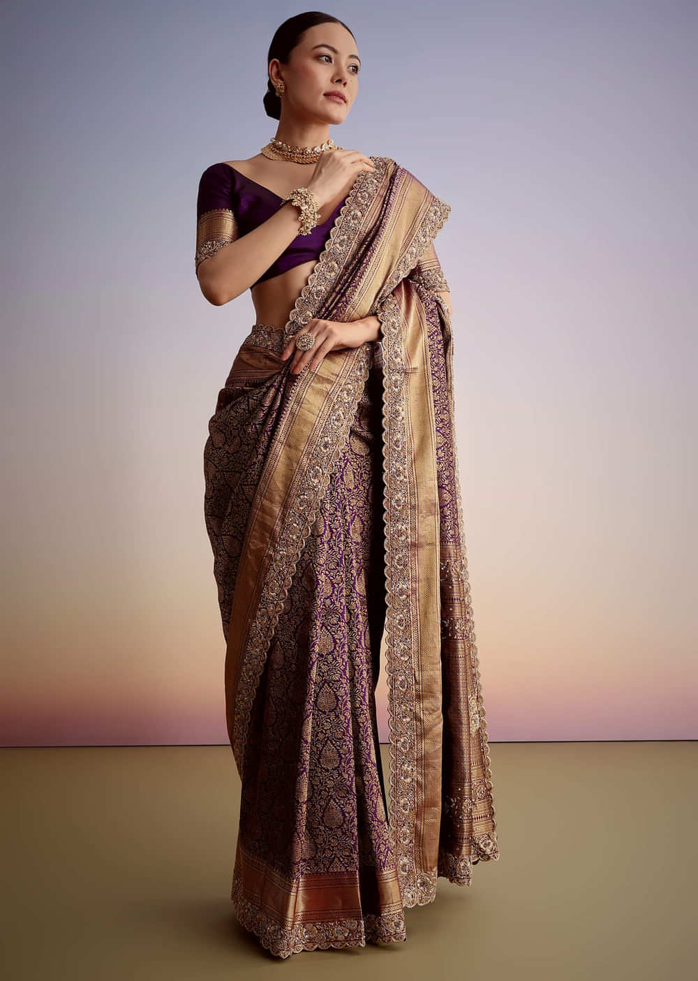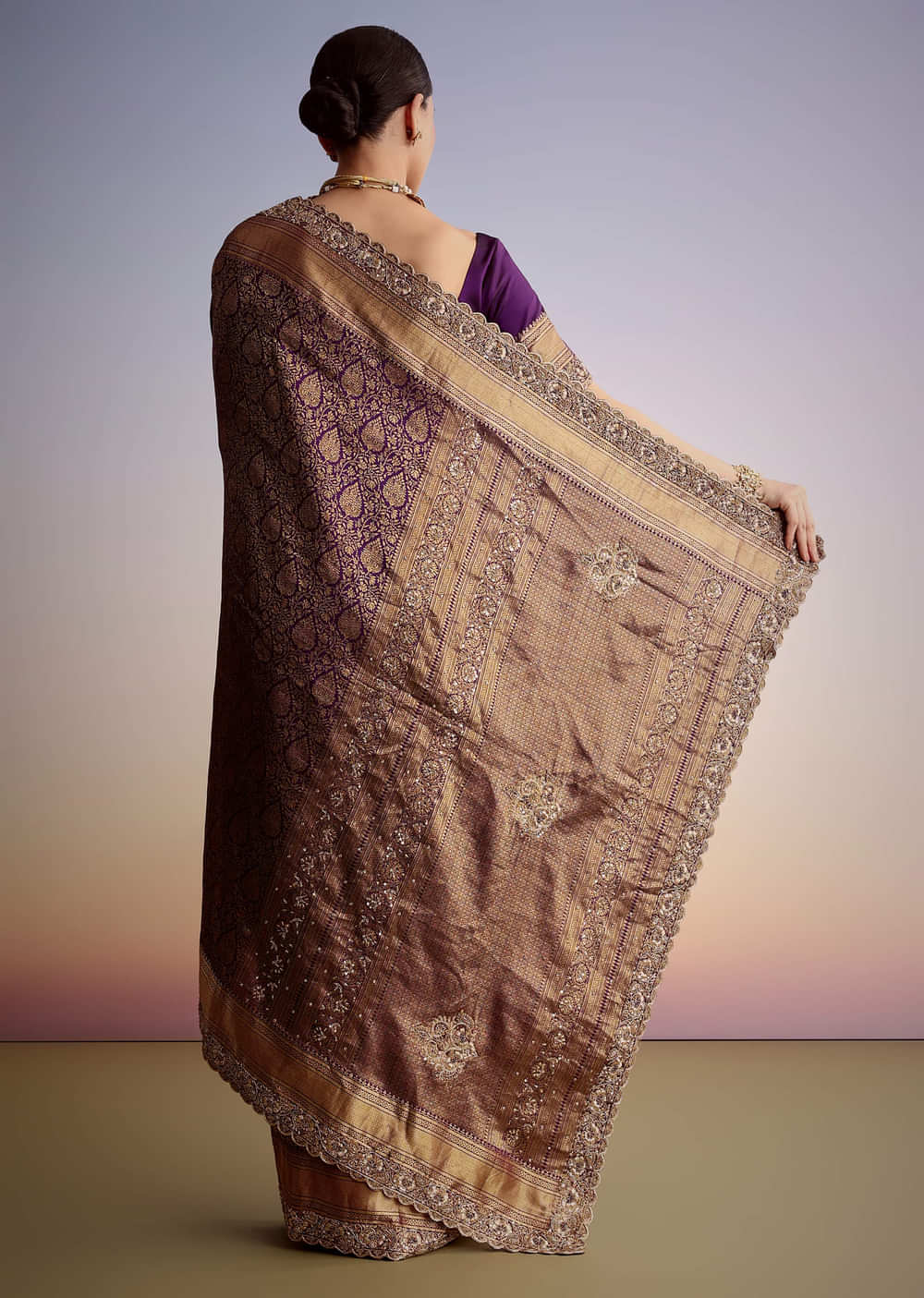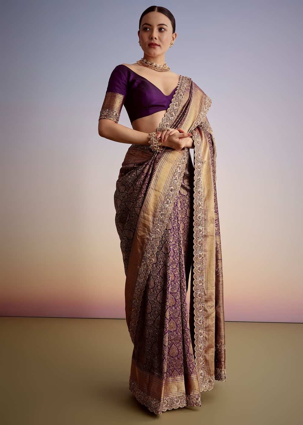Lavish purple tissue saree with intricate floral embroidery. Embellished with sequins, cutdana, and beads. The blouse features coordinated heavy work. Makes a statement for festive and celebratory occasions. Awarded as the Most Trusted Brand, we're delivering styles you love, just as promised.
