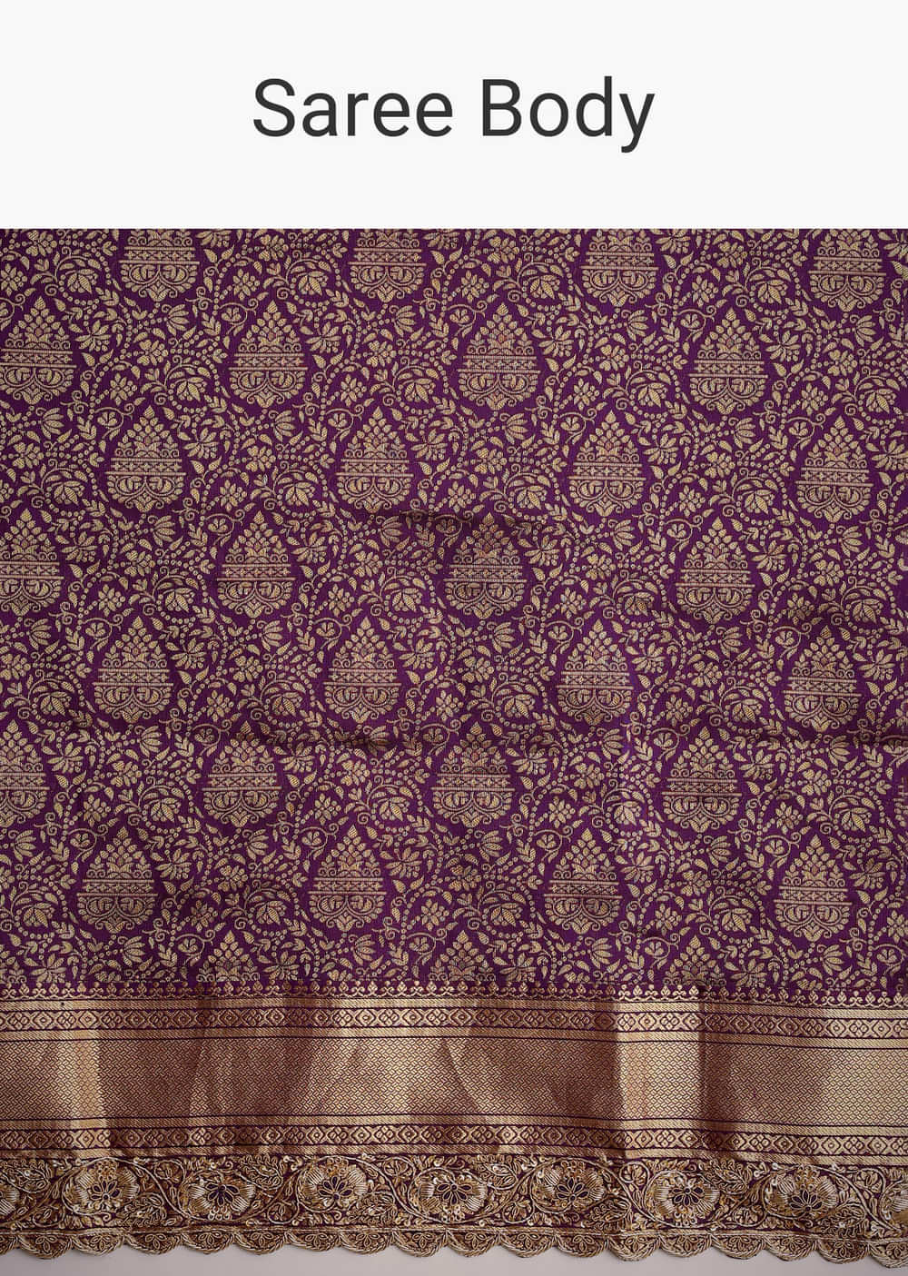 Lavish purple tissue saree with intricate floral embroidery. Embellished with sequins, cutdana, and beads. The blouse features coordinated heavy work. Makes a statement for festive and celebratory occasions. Awarded as... More Product Details
