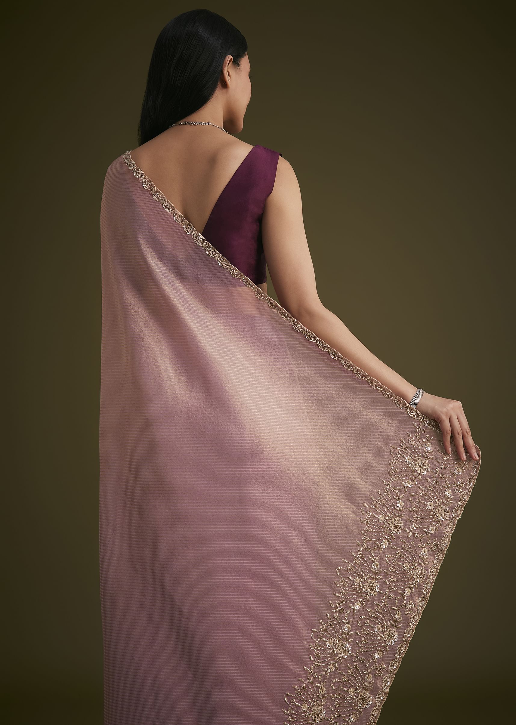 Elevate your wardrobe with this purple tissue saree adorned with intricate cutdana stones and sequins embroidery. The lustrous tissue fabric adds a luxurious texture, while the detailed craftsmanship enhances its sophisticated appeal. Perfect for weddings and evening celebrations, this saree exudes elegance and modern charm. The contrasting blouse fabric further highlights its timeless beauty. Blouse work may vary. Awarded as the most trusted brand we're delivering styles you love just as promised.