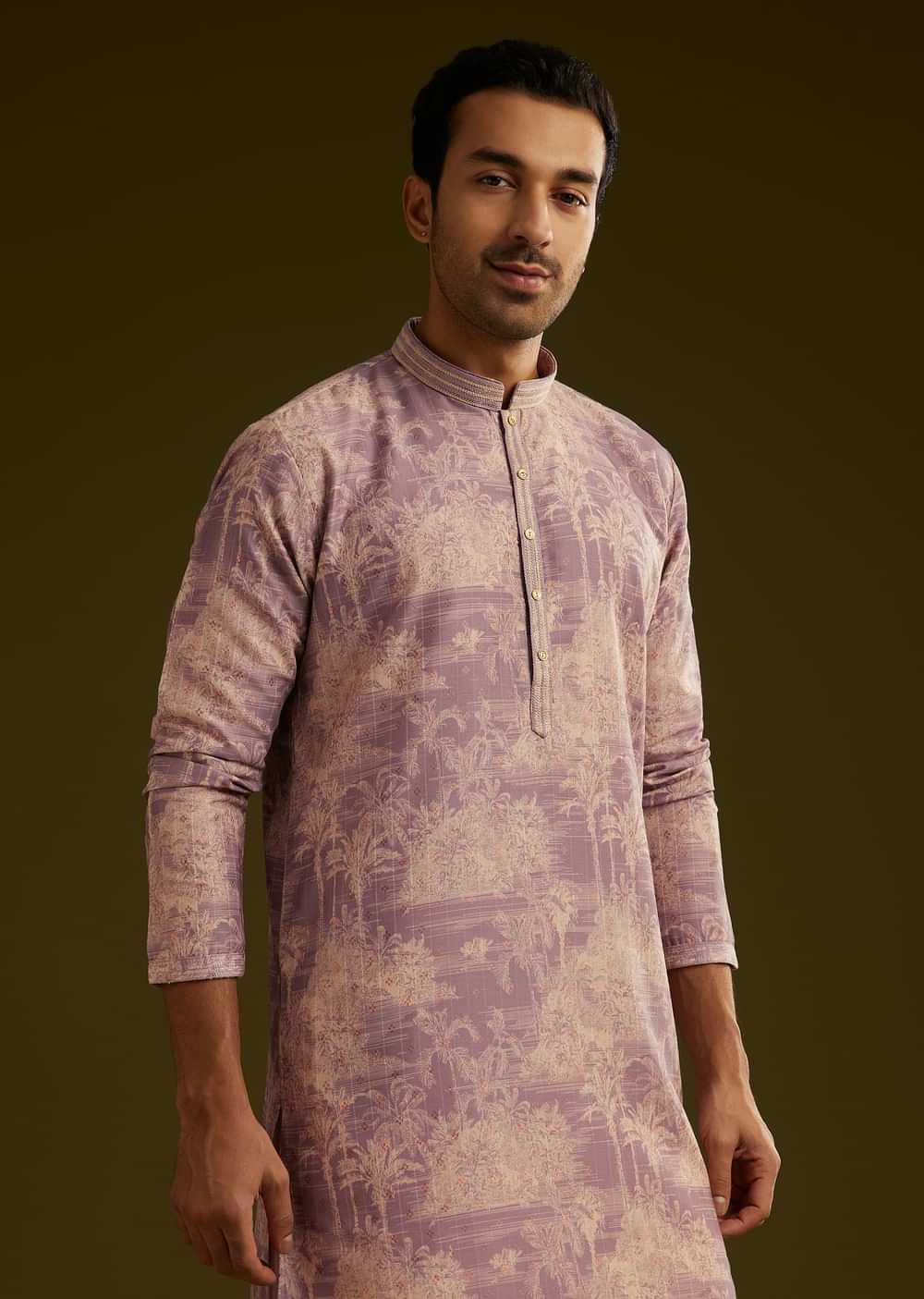 A striking purple silk kurta set with a refined printed design of coconut tree motifs. The mandarin collar full sleeves and front button closure create a structured yet comfortable ethnic look..Awarded As The Most Trusted Brand We'Re Delivering Styles You Love Just As Promised.