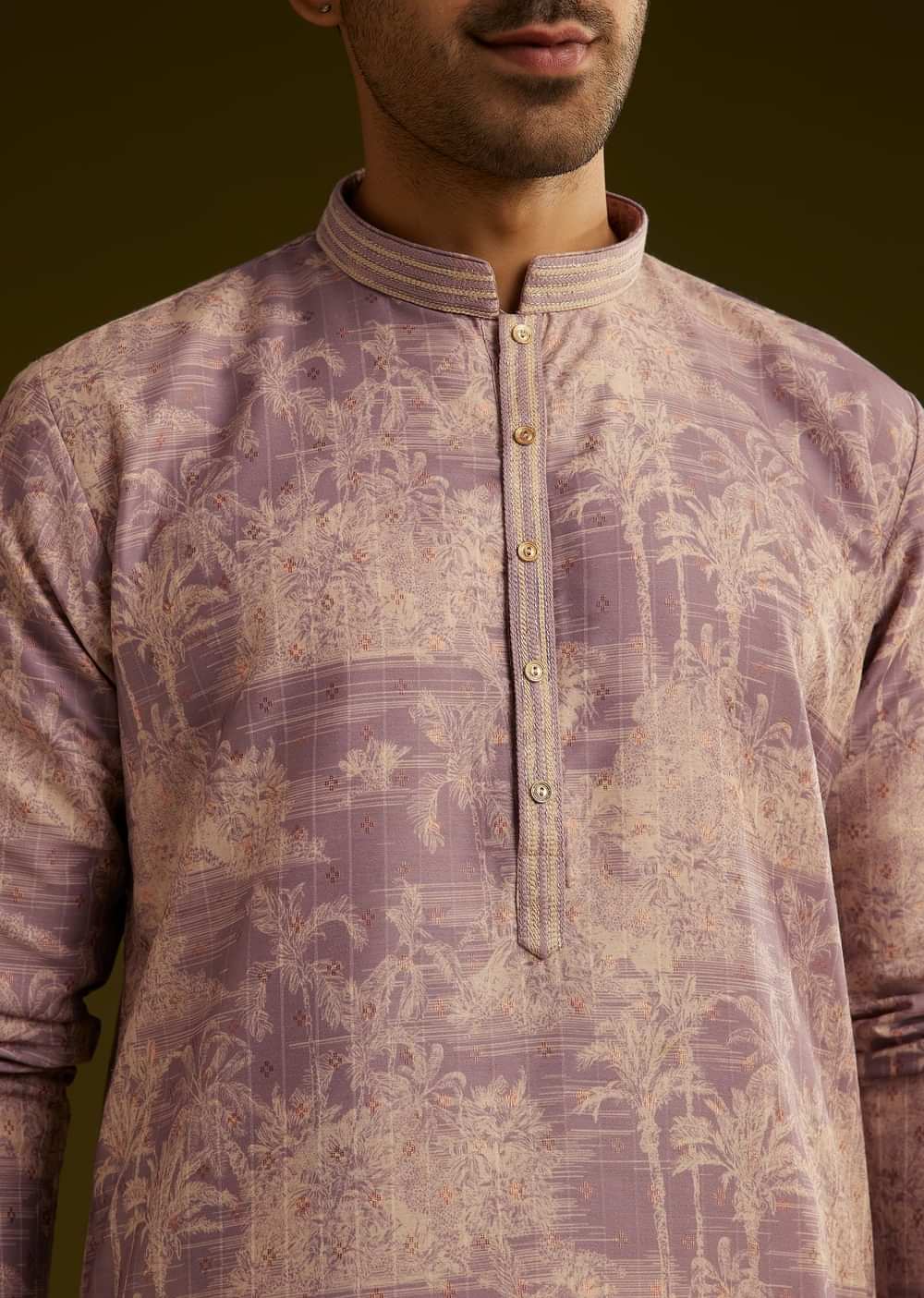 A striking purple silk kurta set with a refined printed design of coconut tree motifs. The mandarin collar full sleeves and front button closure create a structured yet comfortable ethnic... More Product Details
