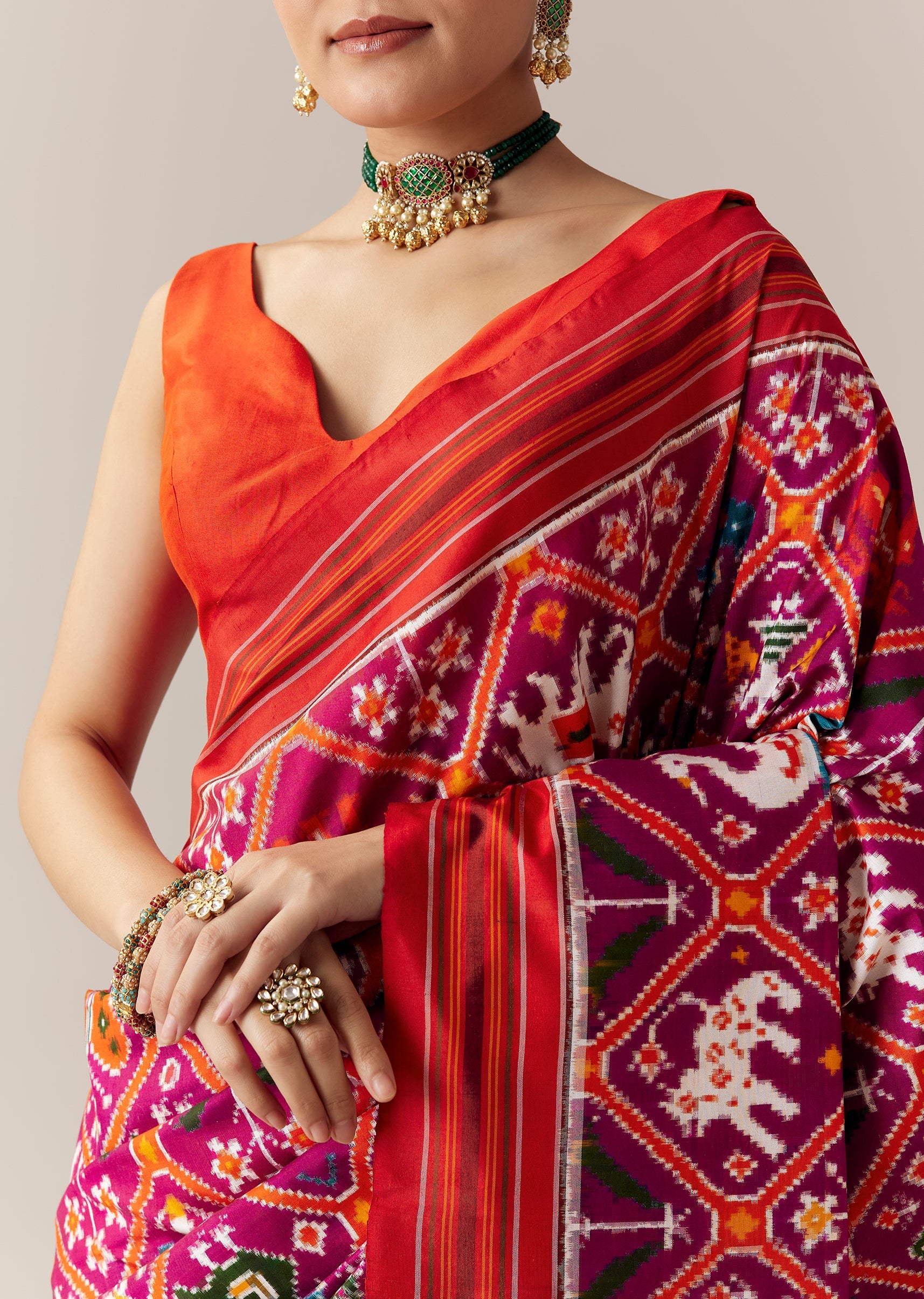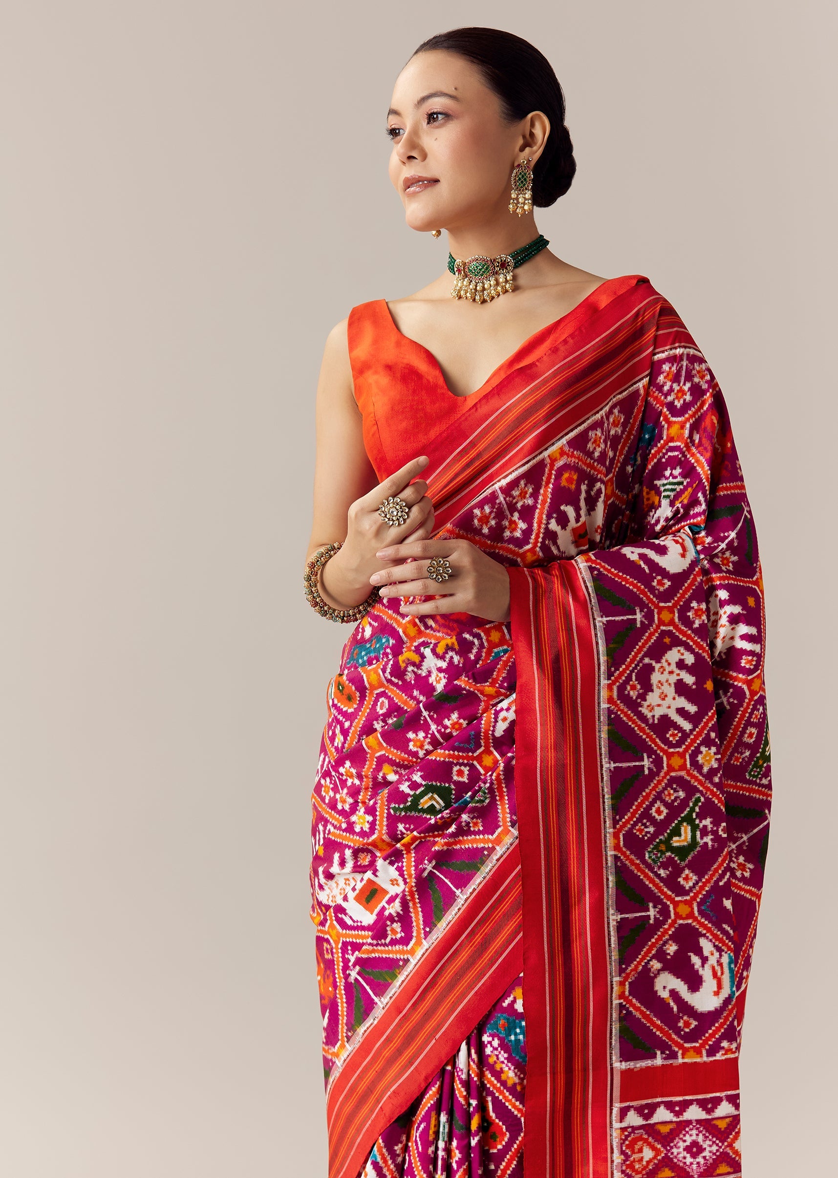 Pair it with antique gold jewelry, a classic bun, and bold kohl eyes to complement its royal purple and red contrast.