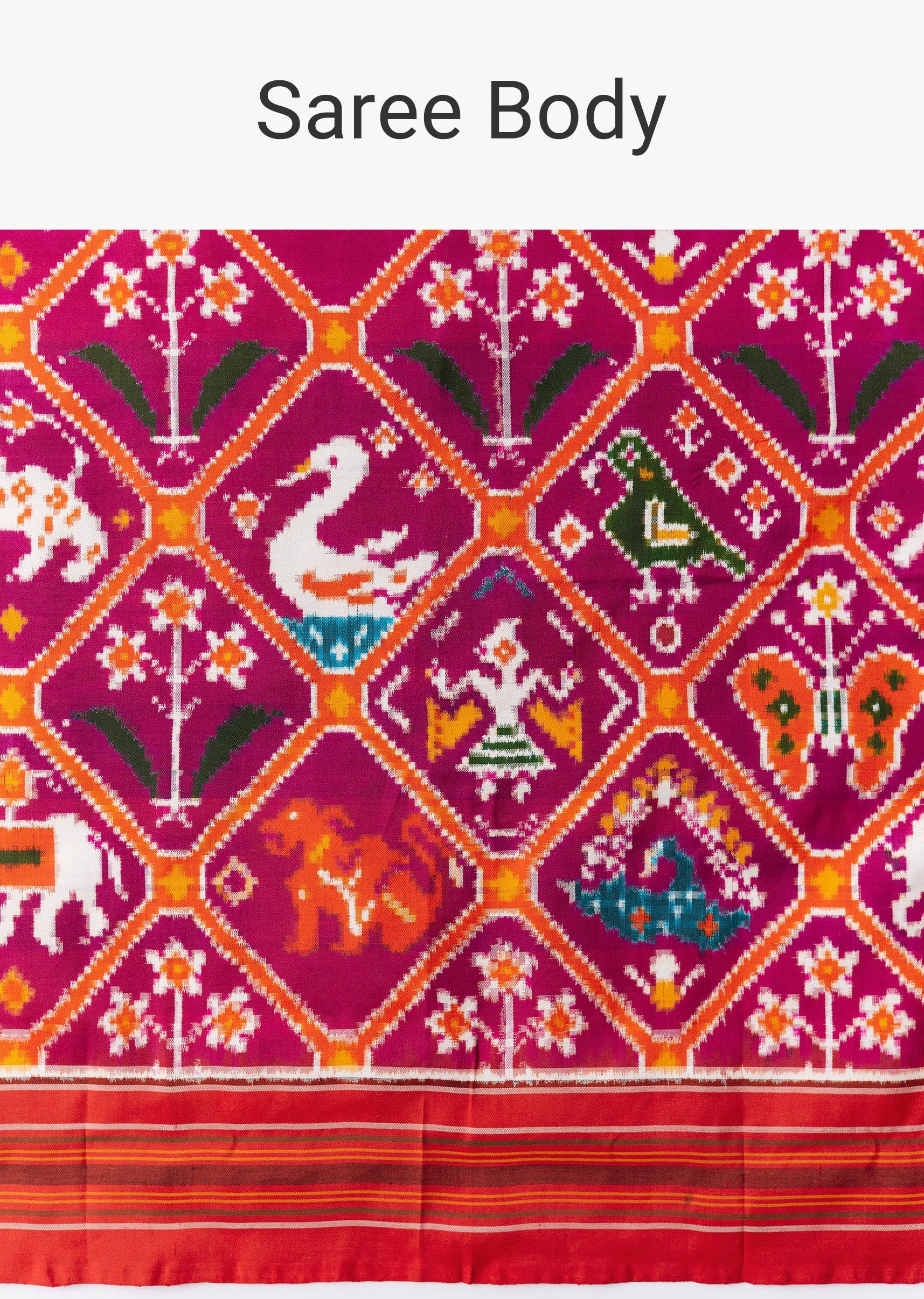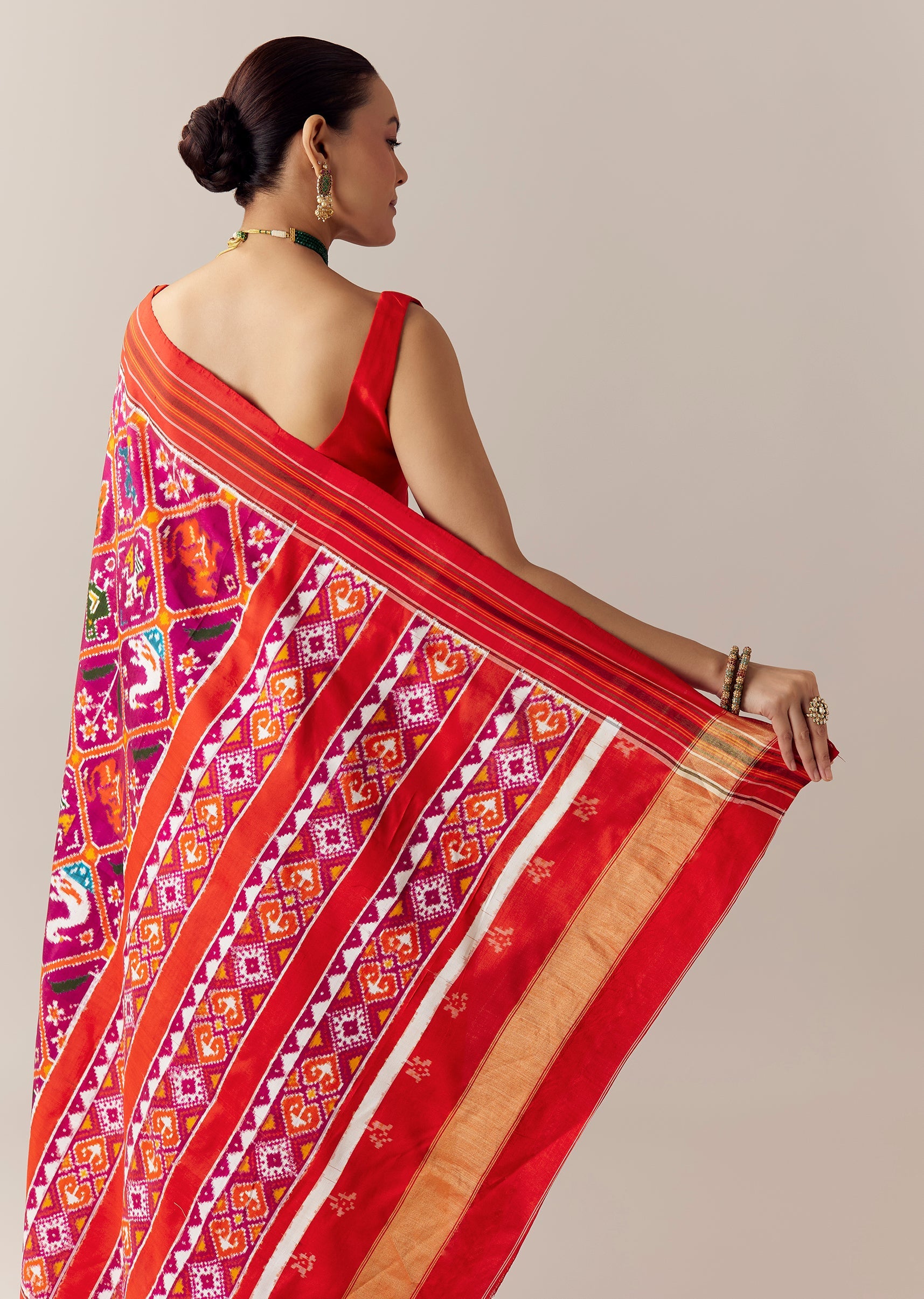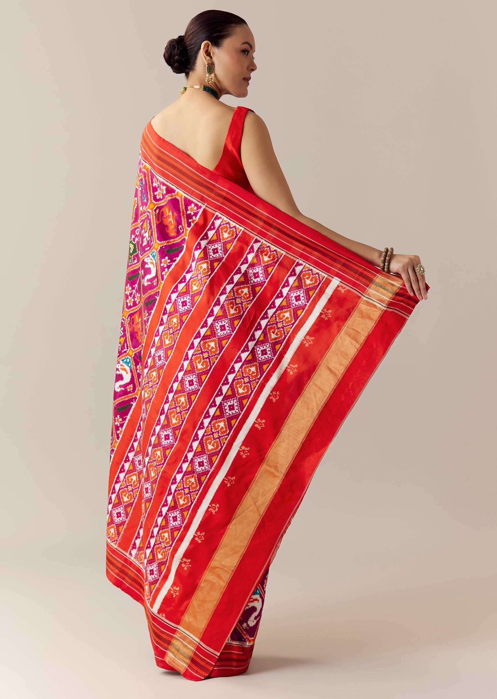 A rich celebration of heritage craftsmanship, this purple Patola silk saree features authentic double ikkat weaving with geometric, natural, and traditional motifs intricately woven across the body. The vibrant contrast red border and matching blouse fabric add striking depth, creating a timeless and culturally rooted ensemble ideal for weddings, festive ceremonies, and grand occasions. Crafted in luxurious silk, the set includes one saree and one unstitched blouse fabric for versatile styling. Awarded as the Most Trusted Brand, we're delivering styles you love, just as promised.