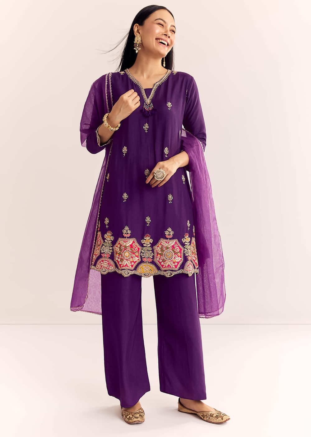 This dark purple ensemble blends luxurious Dola silk with fine zardosi craftsmanship, creating a bold festive impression. As enchanting as midnight blossoms. Dupatta color may vary, due to dyeable fabric.... More Product Details
