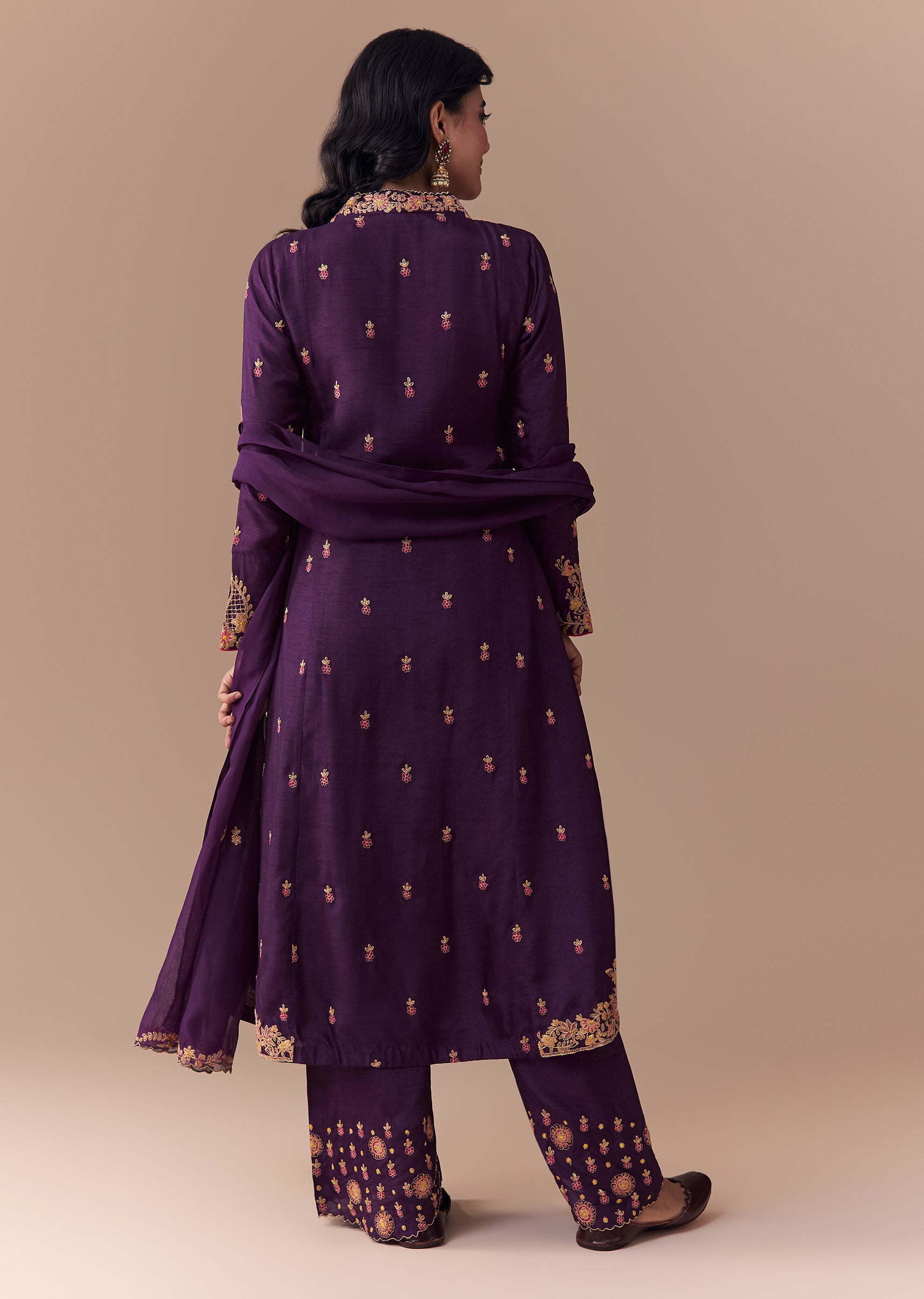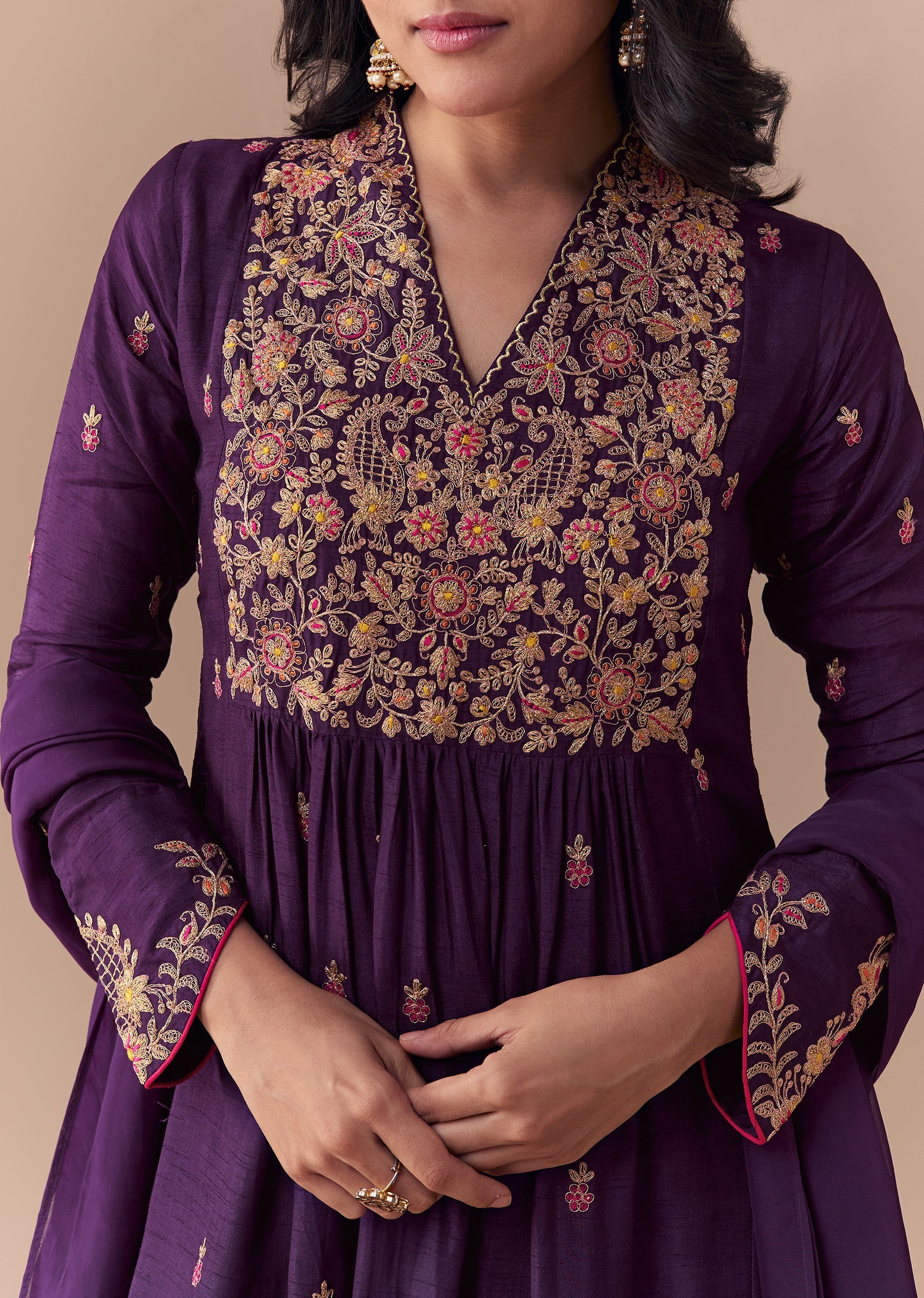 Exude confidence and festive charm in this stunning Anarkali illuminated with zari work that catches the light beautifully. The rich purple silk pant and dupatta add a regal depth that... More Product Details
