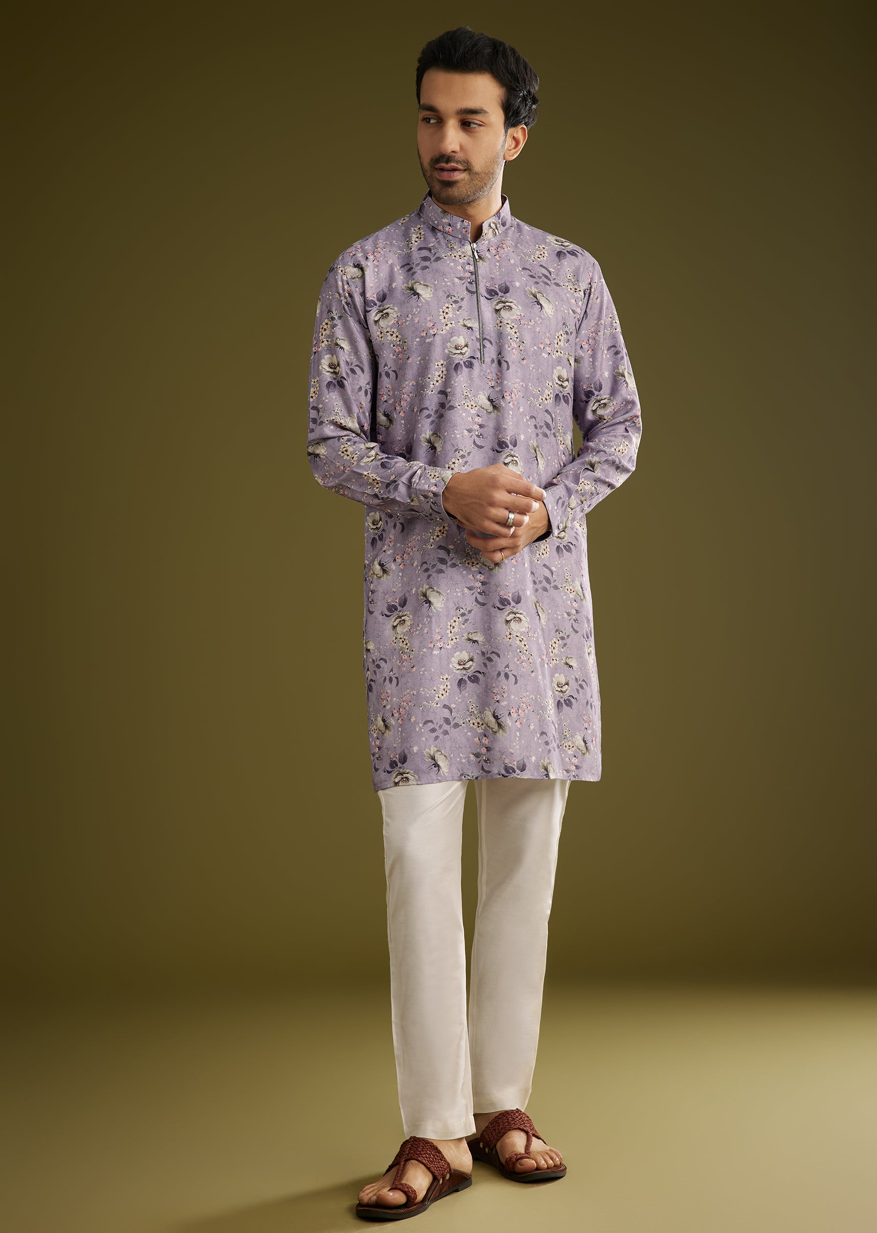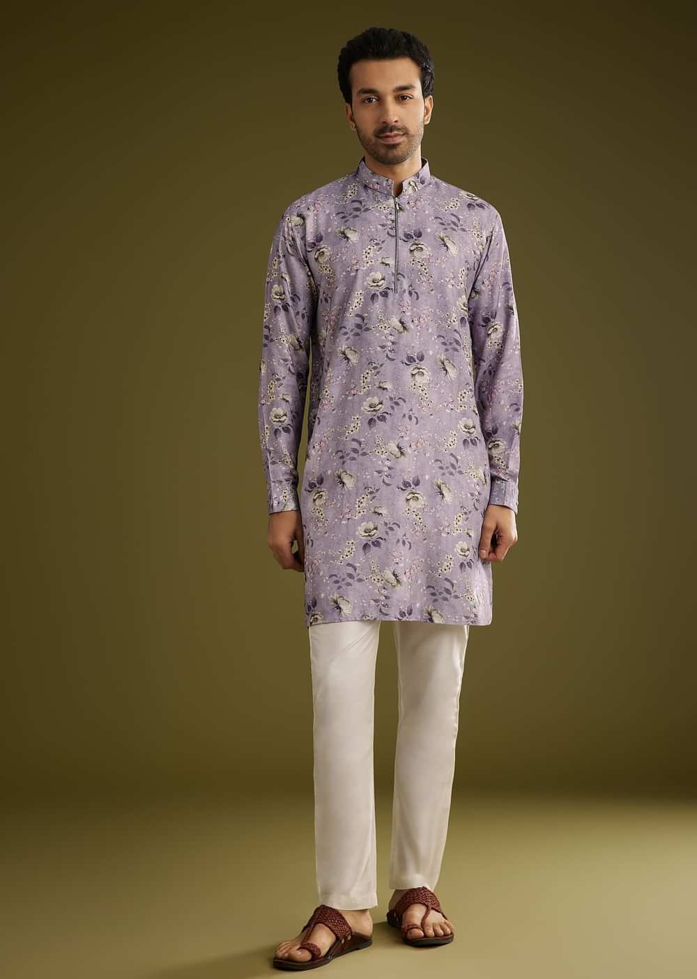Purple Zipper Kurta Set In Russian Silk With Floral Printed