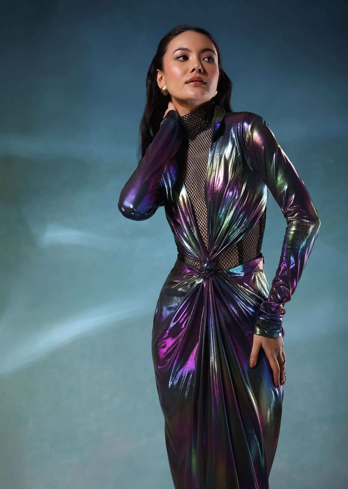 Rainbow Metallic One Piece Gown In Metallic And Mesh Fabric