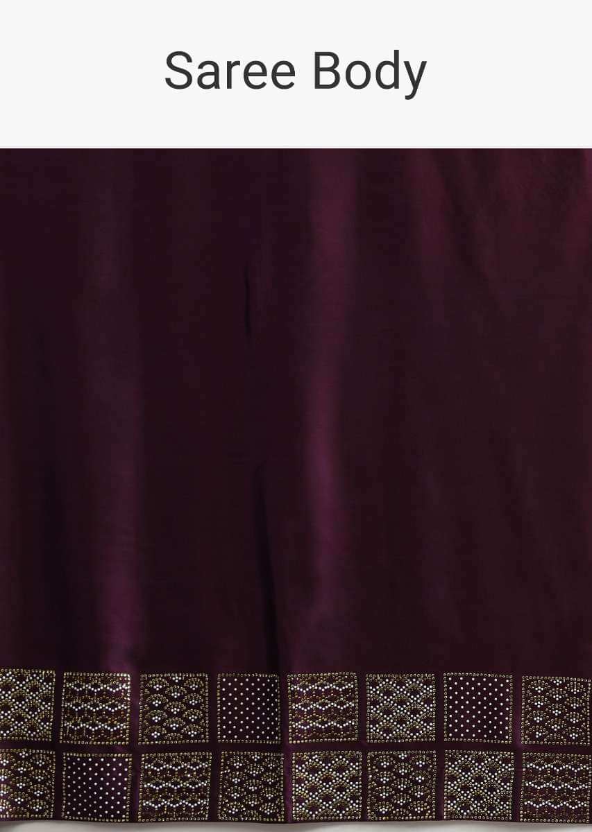 Raisin Purple Saree In Satin With Two Toned Kundan Embellished Border And Ready Stitched Blouse