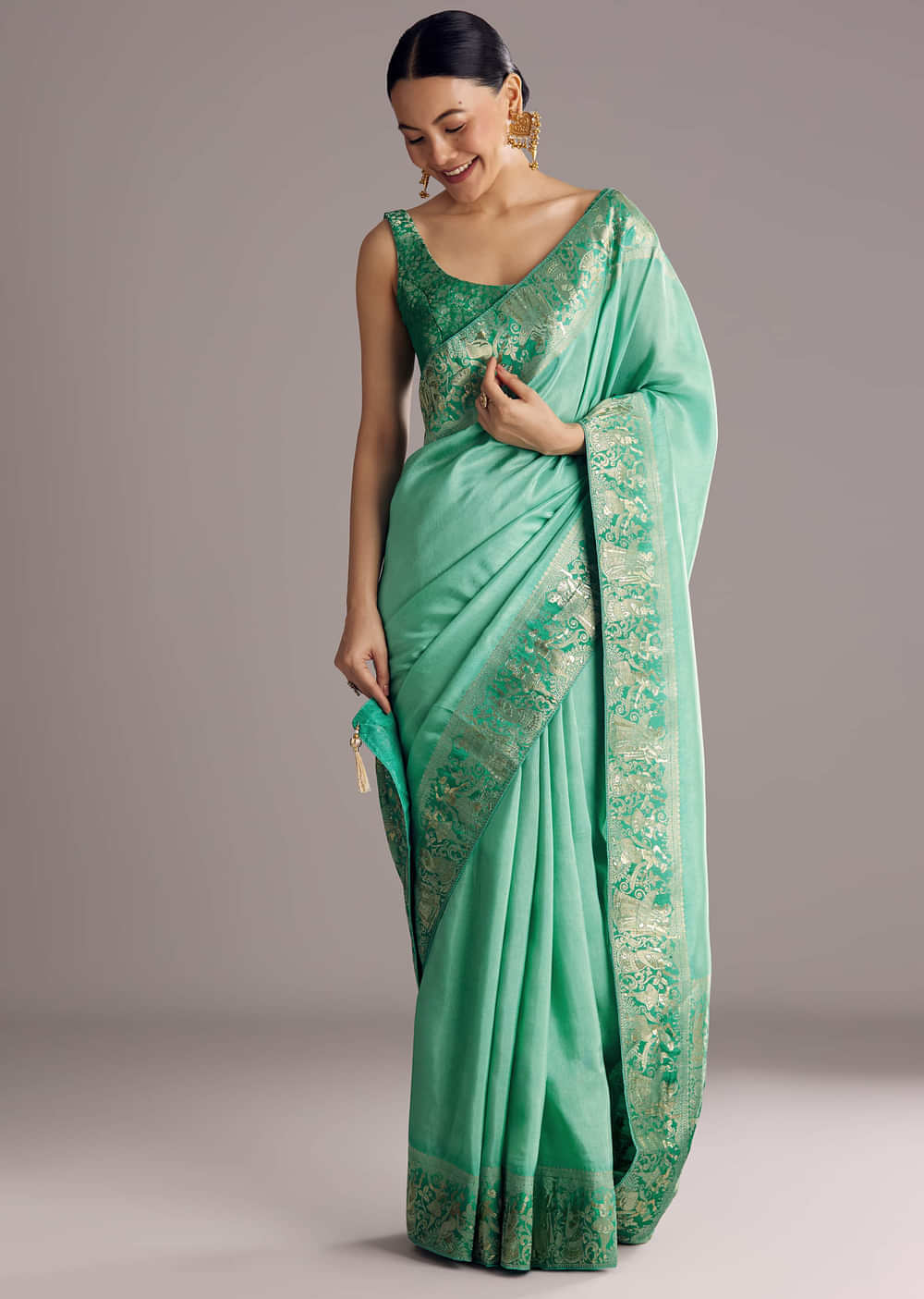 Crafted in luxurious dola silk, this Rama green woven saree features intricate gold foil printed detailing along the border and pallu. Ideal for poojas, festive celebrations, or wedding gatherings, it exudes timeless charm with a modern festive touch. A beautiful choice for guests or close family members at traditional functions. Awarded as the Most Trusted Brand, we're delivering styles you love, just as promised.