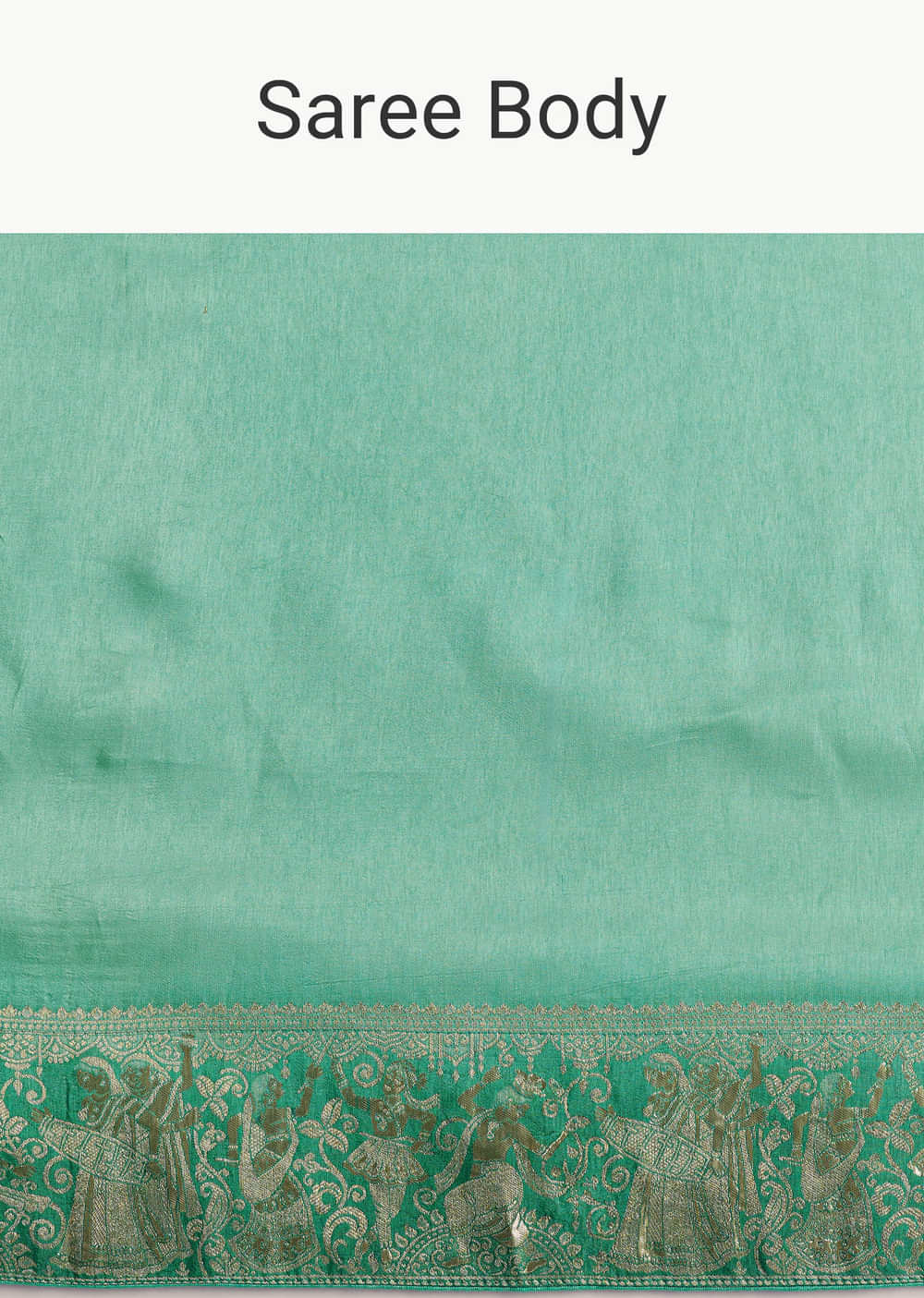 Crafted in luxurious dola silk, this Rama green woven saree features intricate gold foil printed detailing along the border and pallu. Ideal for poojas, festive celebrations, or wedding gatherings, it... More Product Details