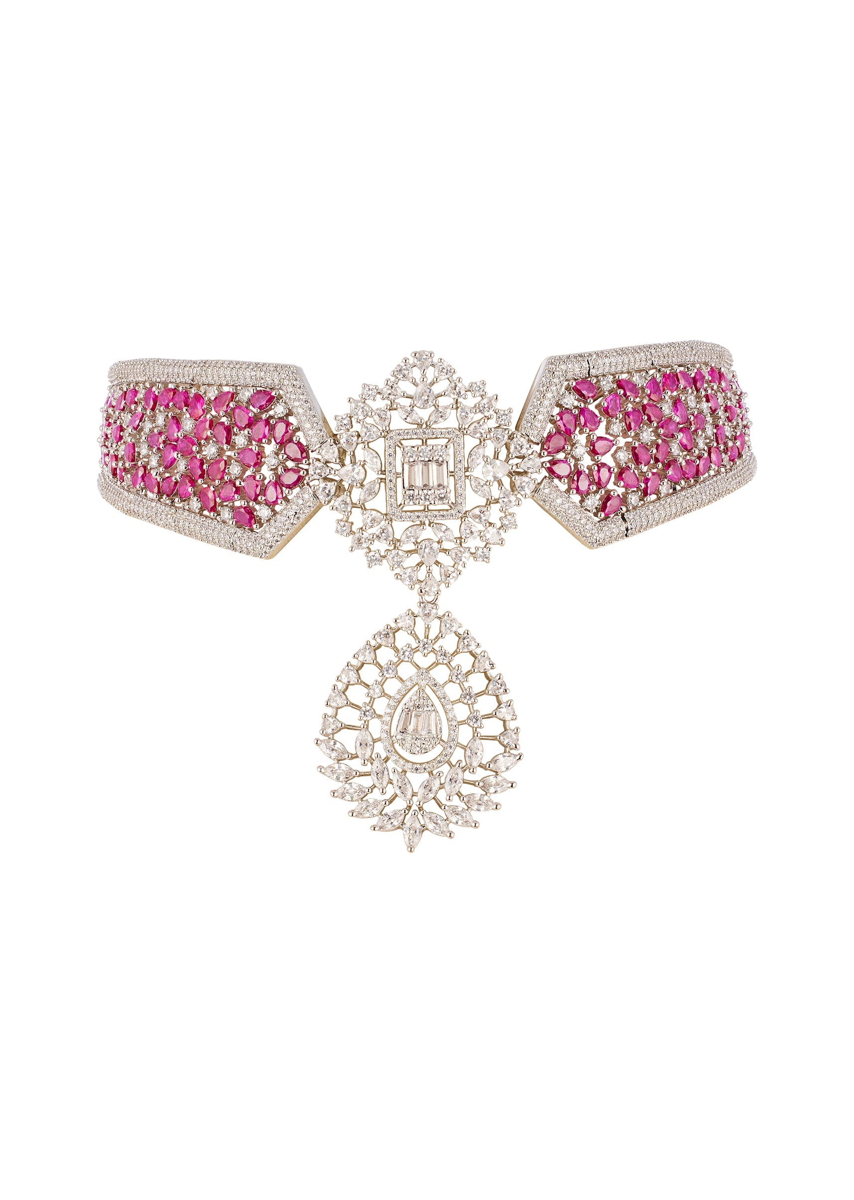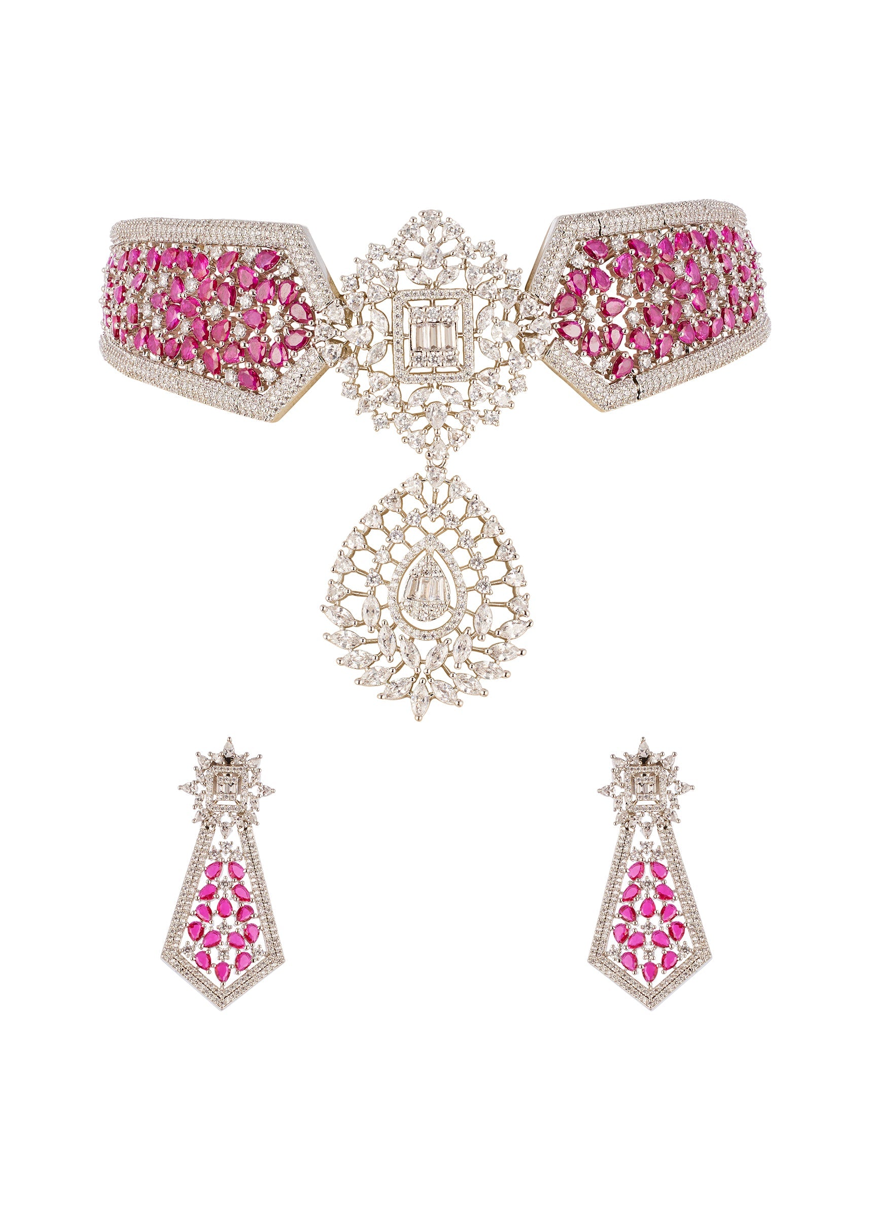 A touch of romance comes alive in this CZ diamond look necklace set highlighted with striking rani pink semi precious stones for a bold yet elegant statement. Crafted in durable rhodium plated brass with an anti tarnish finish, the necklace and matching earrings sparkle beautifully while the vibrant pink adds a bridal festive charm. Perfect for weddings, receptions, and celebratory evenings, this set balances glamour with sophistication. Awarded as the Most Trusted Brand, we're delivering styles you love, just as promised.