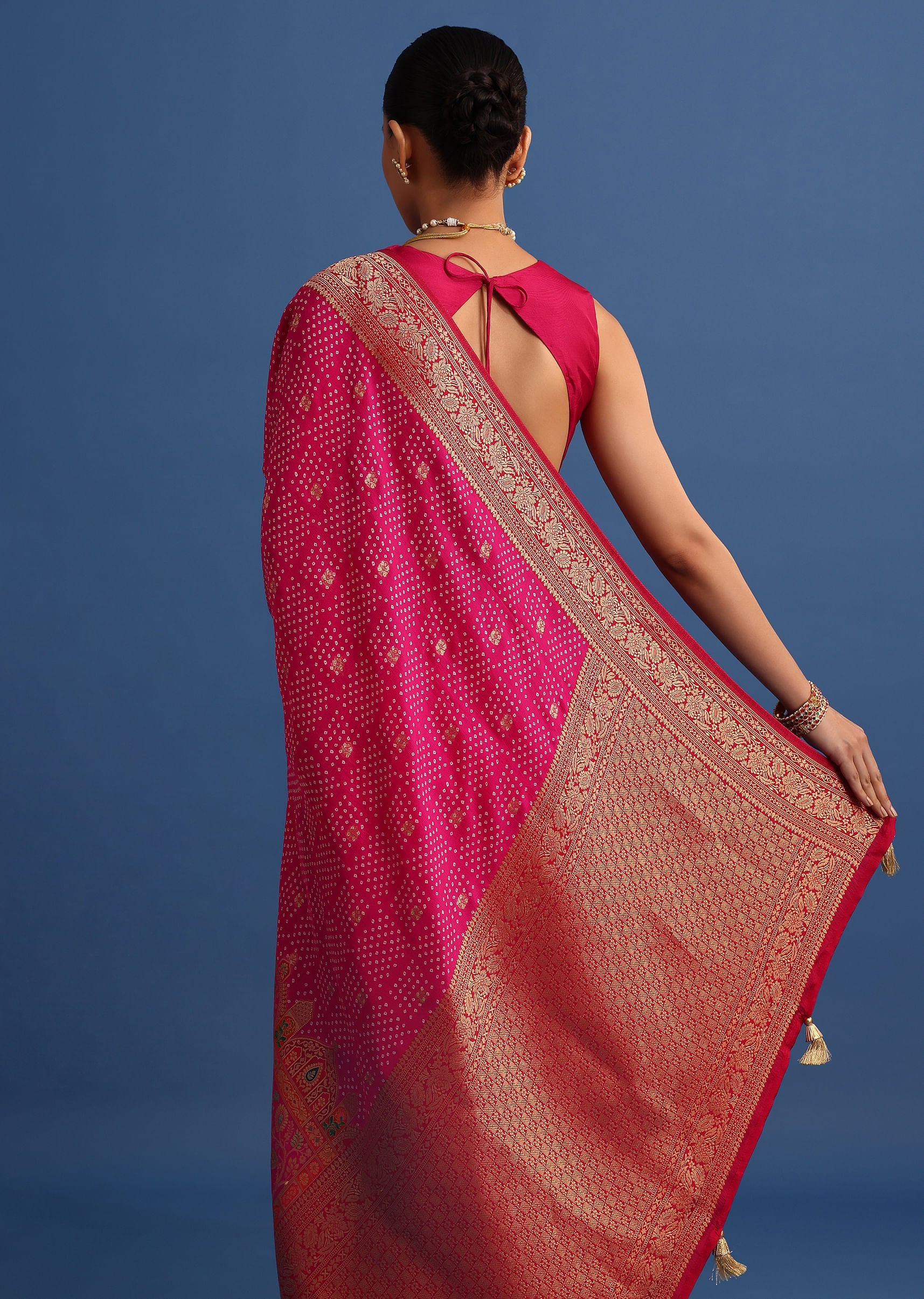 Rani Pink Banarasi Bandhani Satin Saree With Brocade Motifs On Border