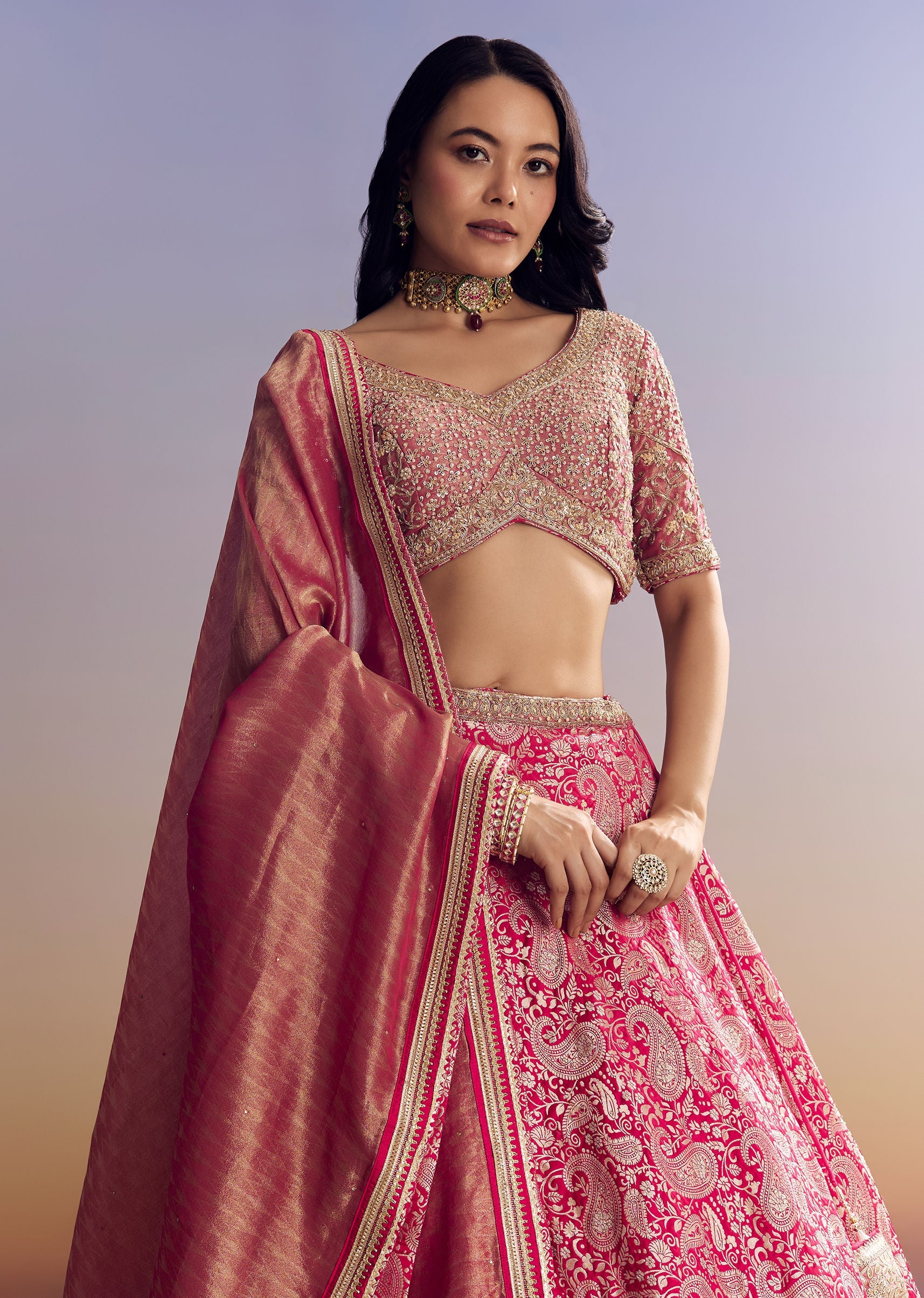 This rich pink lehenga features banarasi detailing, an embroidered choli, and a tissue dupatta. Perfect for wedding functions or engagement events. Awarded as the Most Trusted Brand, we're delivering styles you love, just as promised.