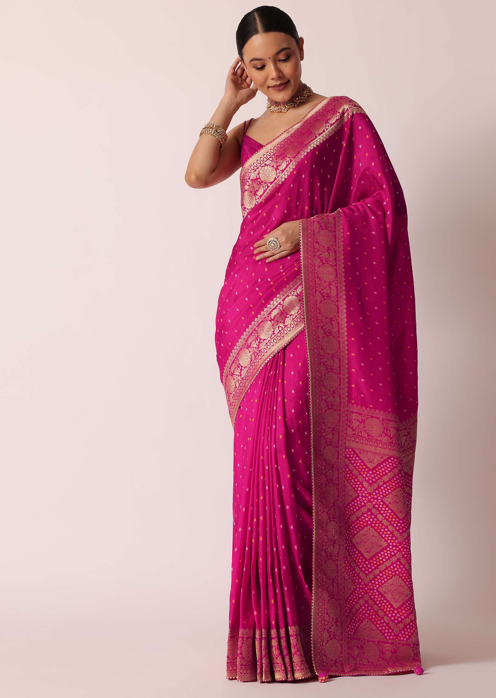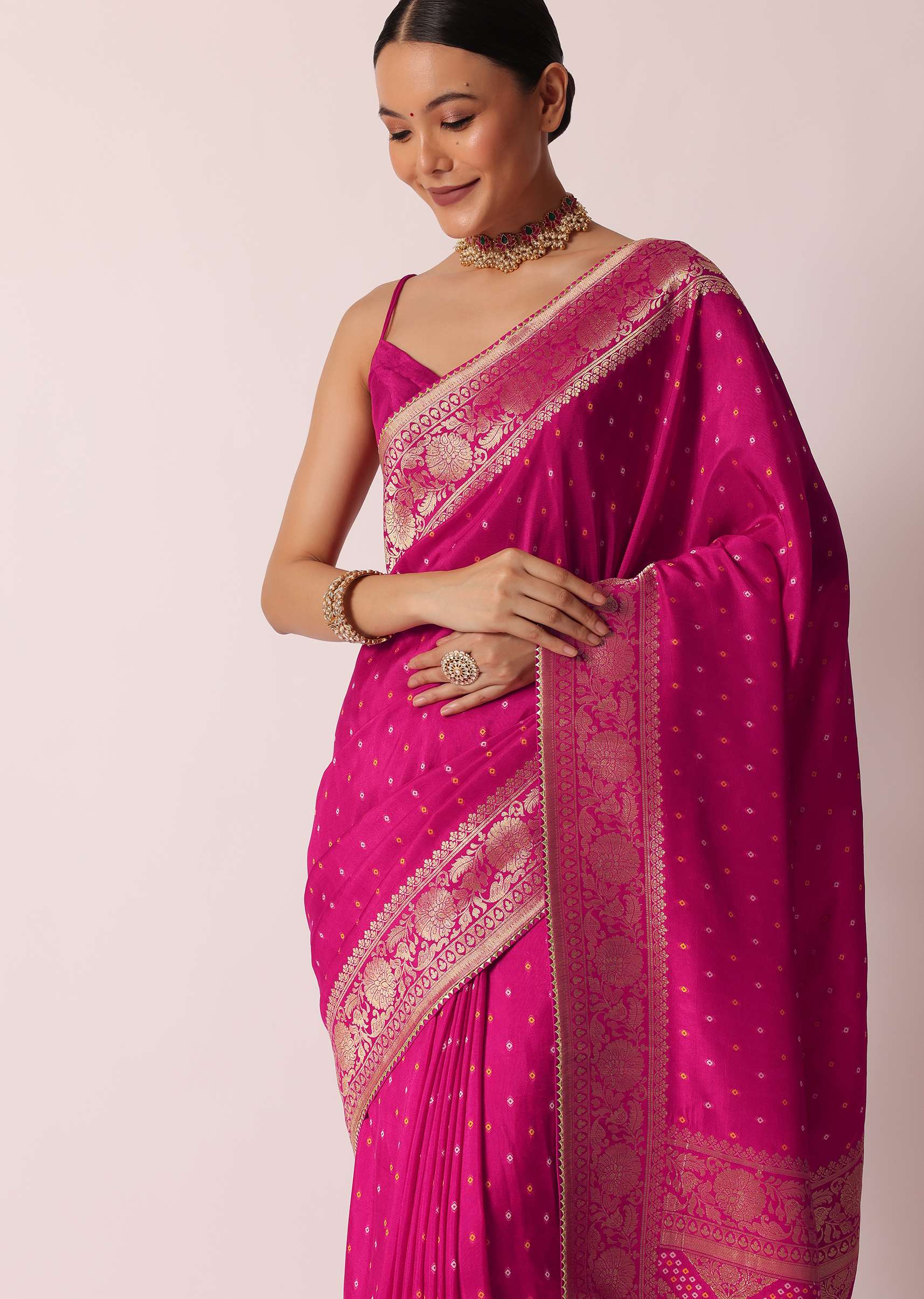 Rani Pink Banarasi Saree With Bandhani Buttis And Unstitched Blouse Piece