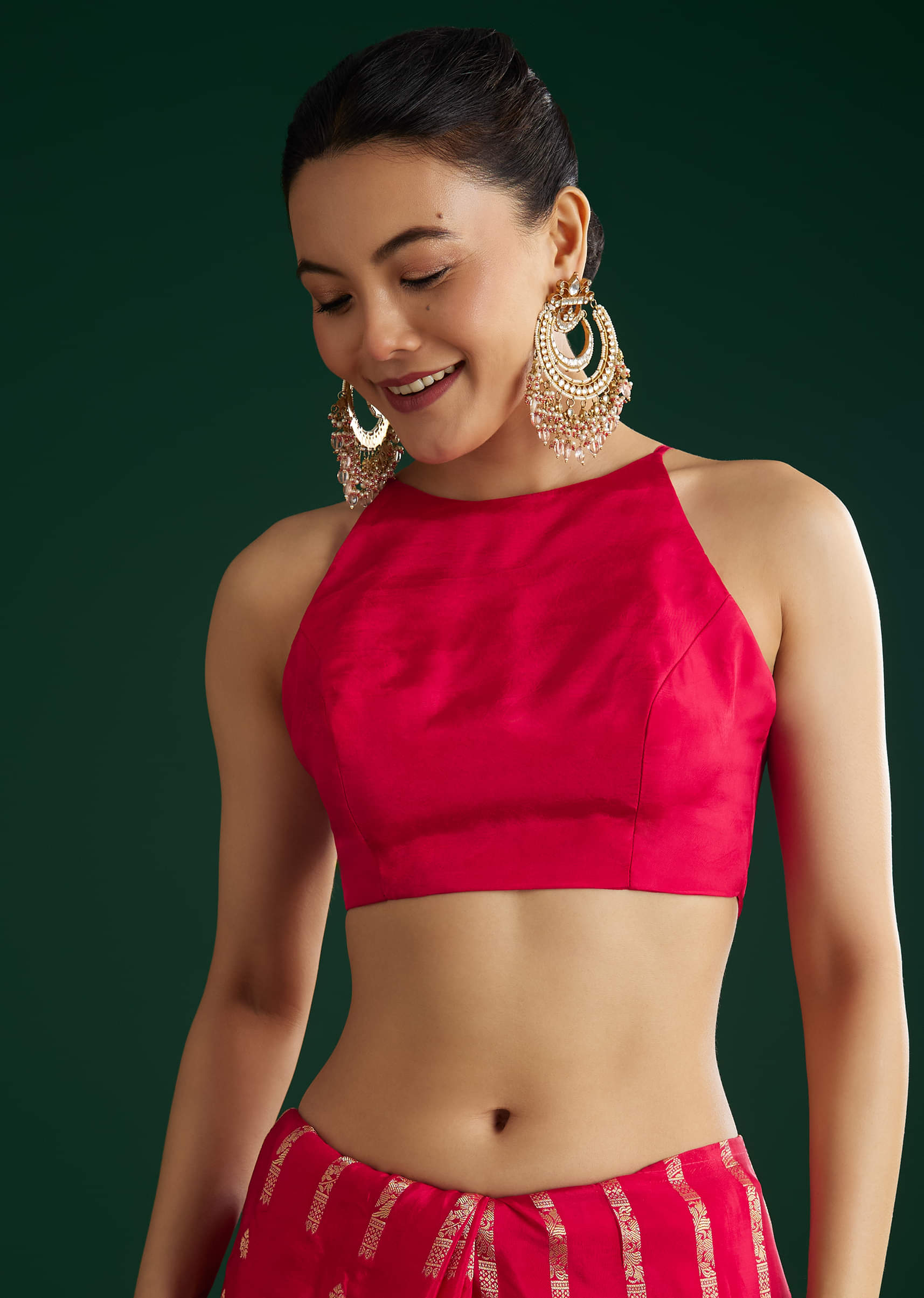 Fit Tips:Ensure the halter blouse fits snugly and use pleat pins for a clean, graceful drape.