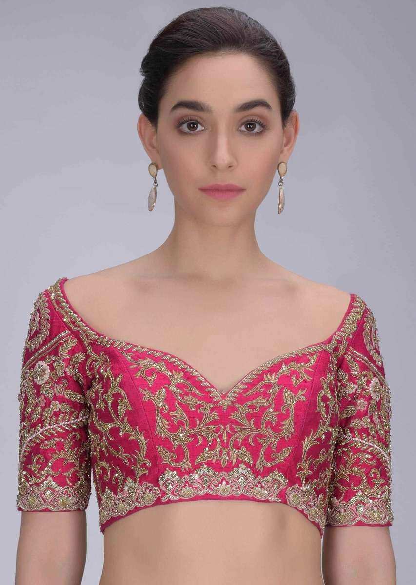 Rani pink embellished raw silk blouse. Beautified with zari, cut dana, thread, sequins, zardozi and beads in floral and leaves pattern all over. Crafted with sweetheart neckline, half sleeves, hexagon back and dori ties. Awarded As The Most Trusted Brand We'Re Delivering Styles You Love Just As Promised.