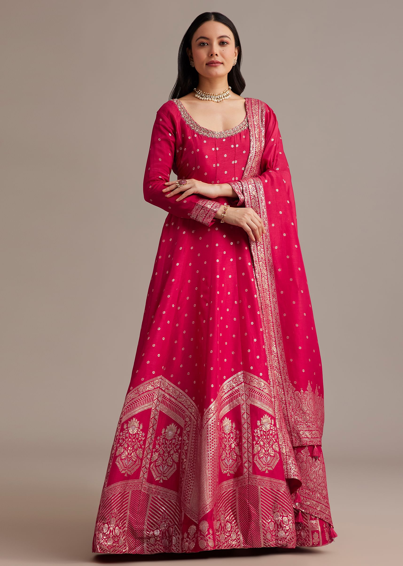 Rani Pink Gold Weave Anarkali Set With Banarasi Dupatta