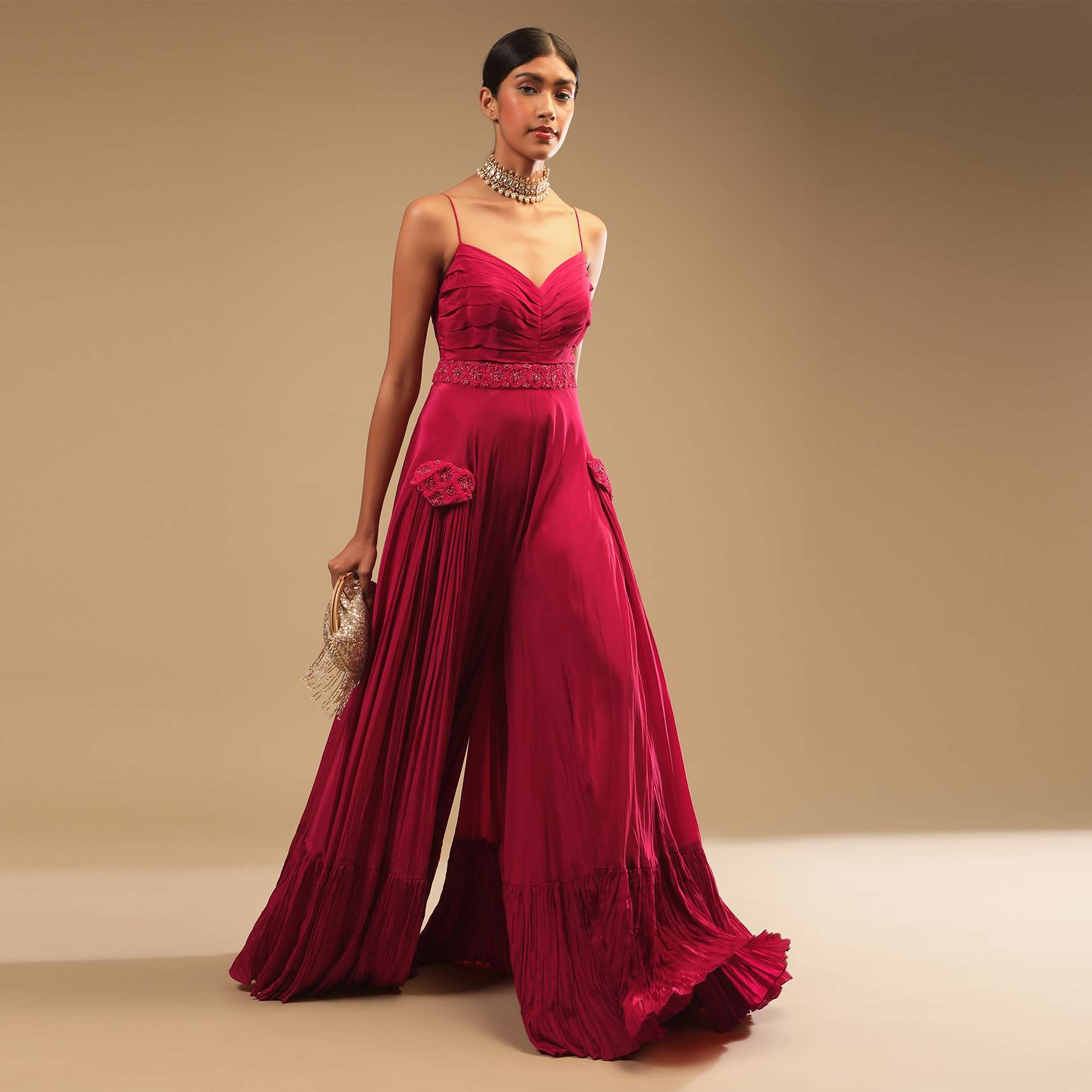 Rani Pink Jumpsuit In Crepe With Tiered Flare, Pleated Bodice And 3D Embroidered Belt And Pocket Detail