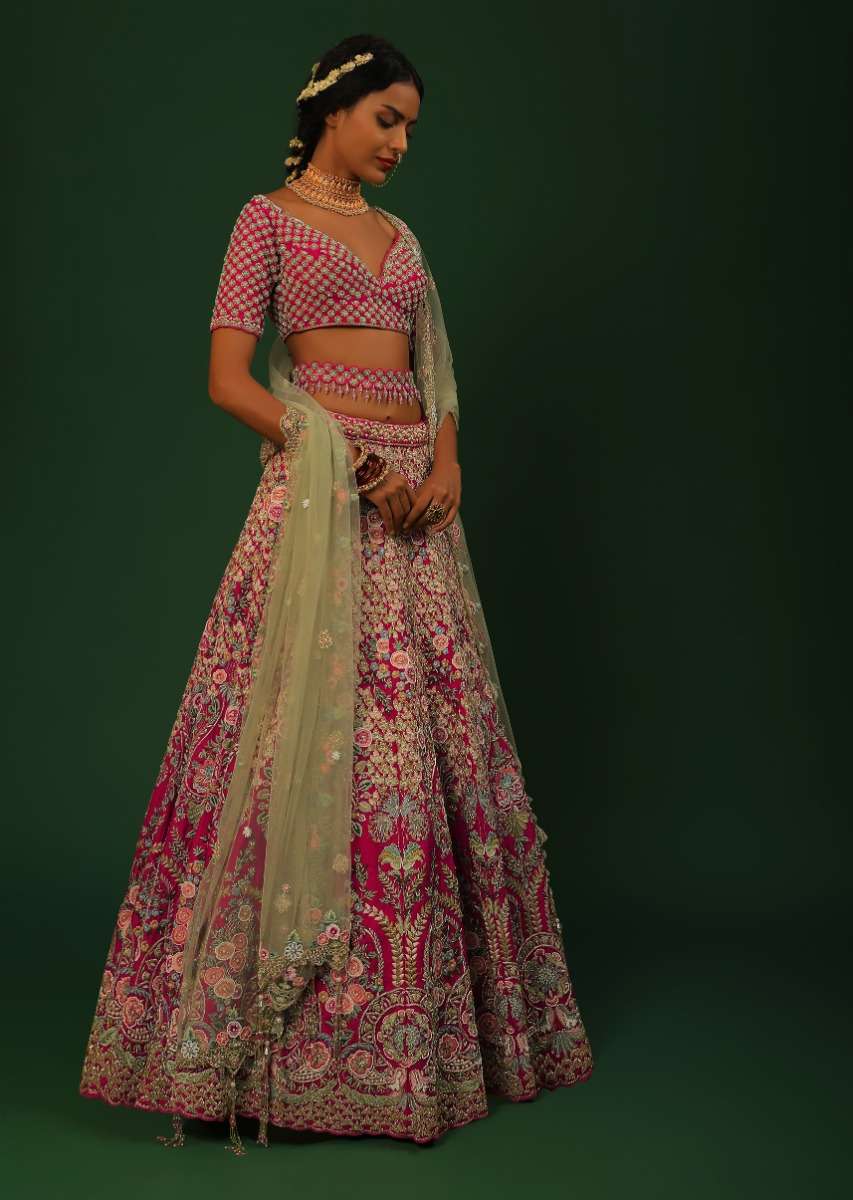 Rani pink lehenga choli in raw silk with heavily embroidered kalis using alluring multi color resham work in floral motifs. It is ornamented with cut dana, moti and multicolored sequins that add bling to this beautiful lehenga. Paired with a heavy embroidered choli in raw silk in floral buttis. It is crafted with half sleeves, plunging neckline, back hooks and elaborate tassels. Cinched at the waist with an embroidered belt. Topped with a contrasting green net dupattaith multi colored floral border and buttis. Trimmed with tassels on the border. This piece comes with padding and cancan. Awarded as the Most Trusted Brand, we're delivering styles you love, just as promised.