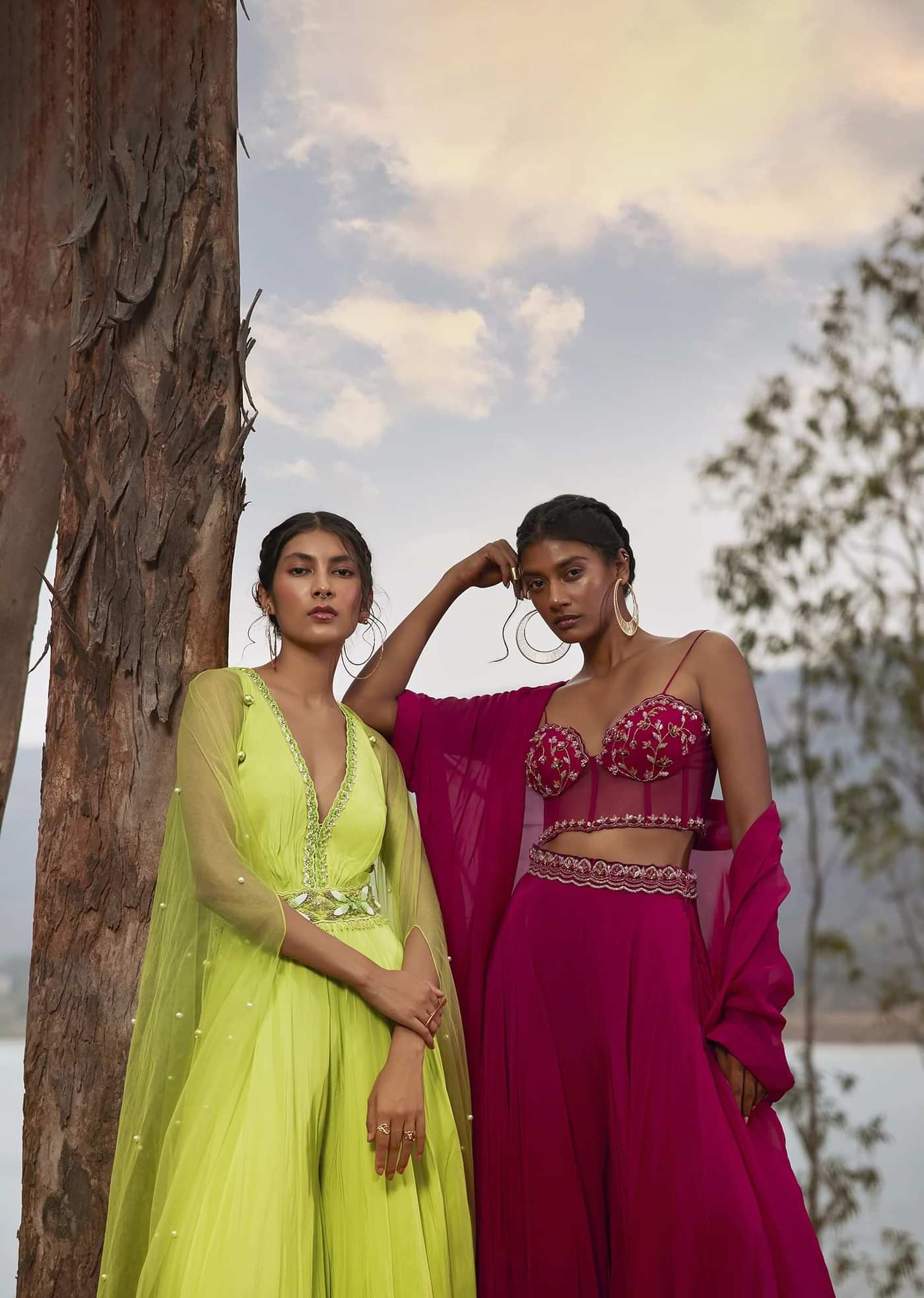 Introducing the ravishing palazzo jacket set with a corset blouse, a true epitome of chic and glamour. The outfit features a corset blouse with fancy sleeves and a deep sweetheart... More Product Details