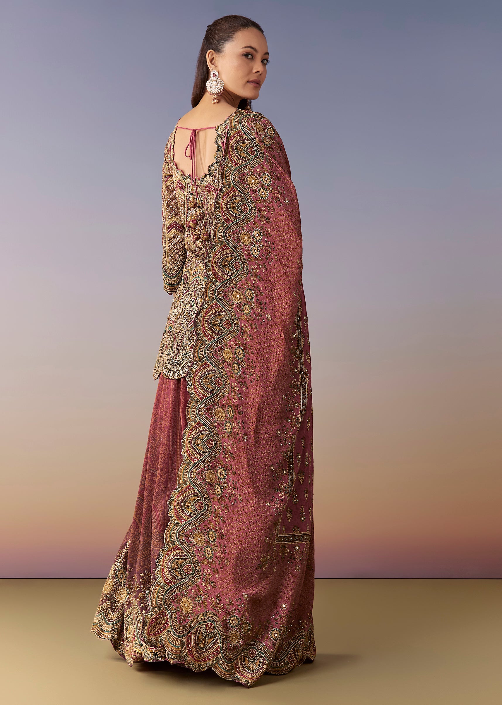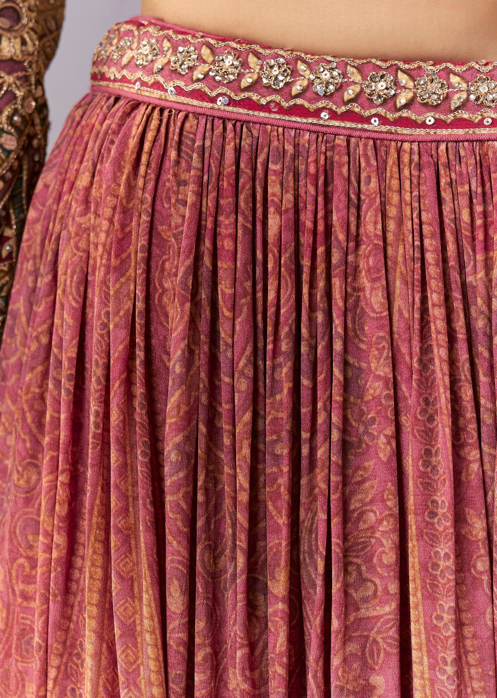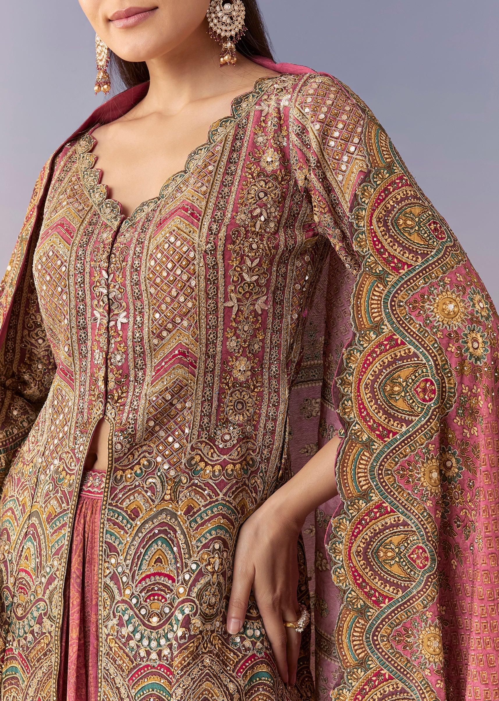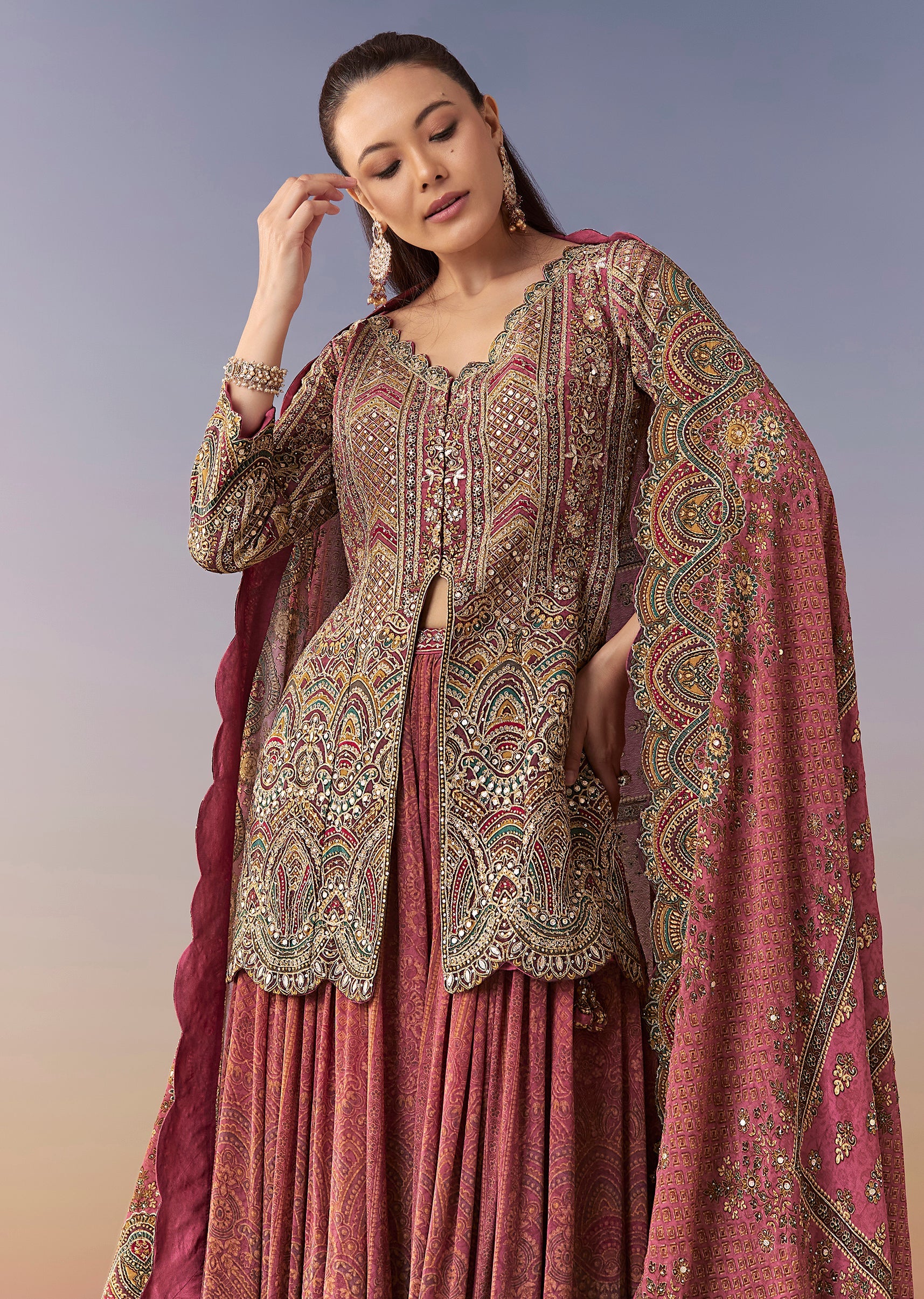 Crafted in crepe, this A-line printed kurta features gotta work with mirror detailing and a stylish front slit. Designed with a V-neckline and front hook-eye closure, it is paired with... More Product Details