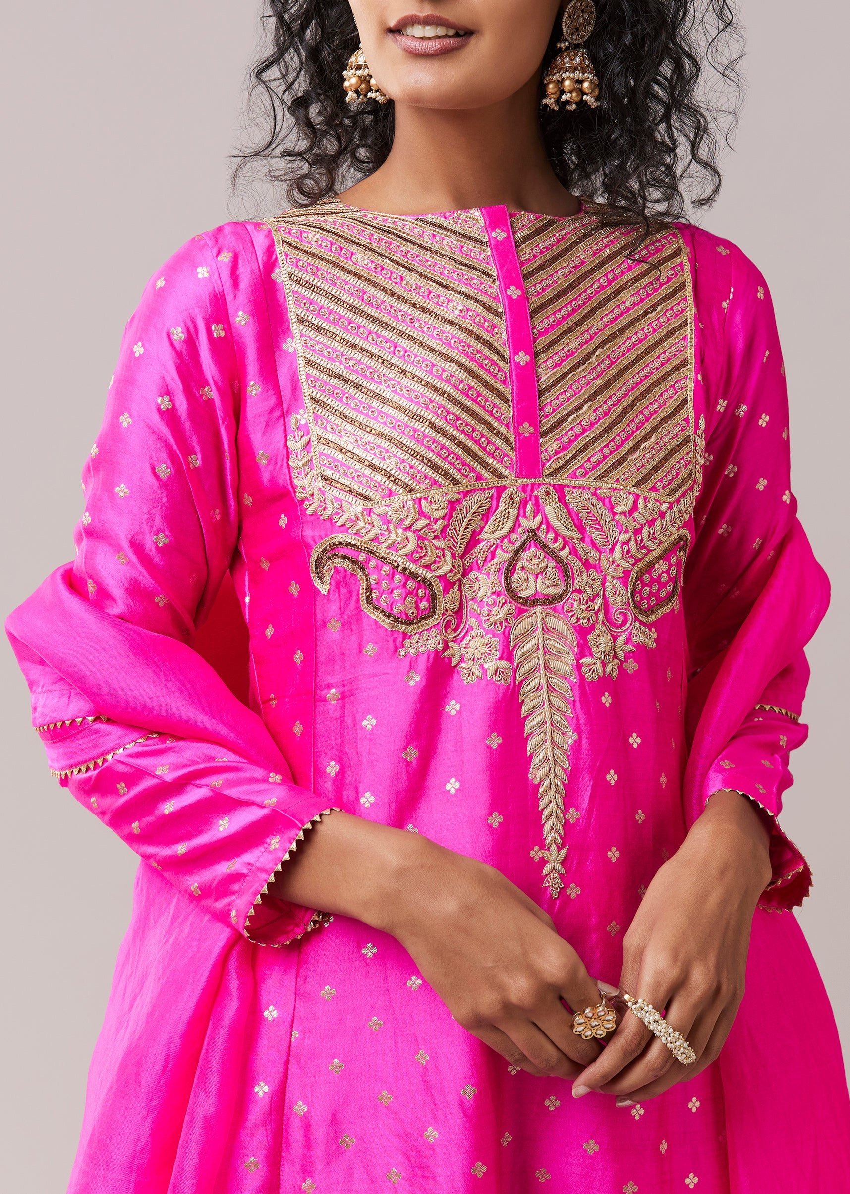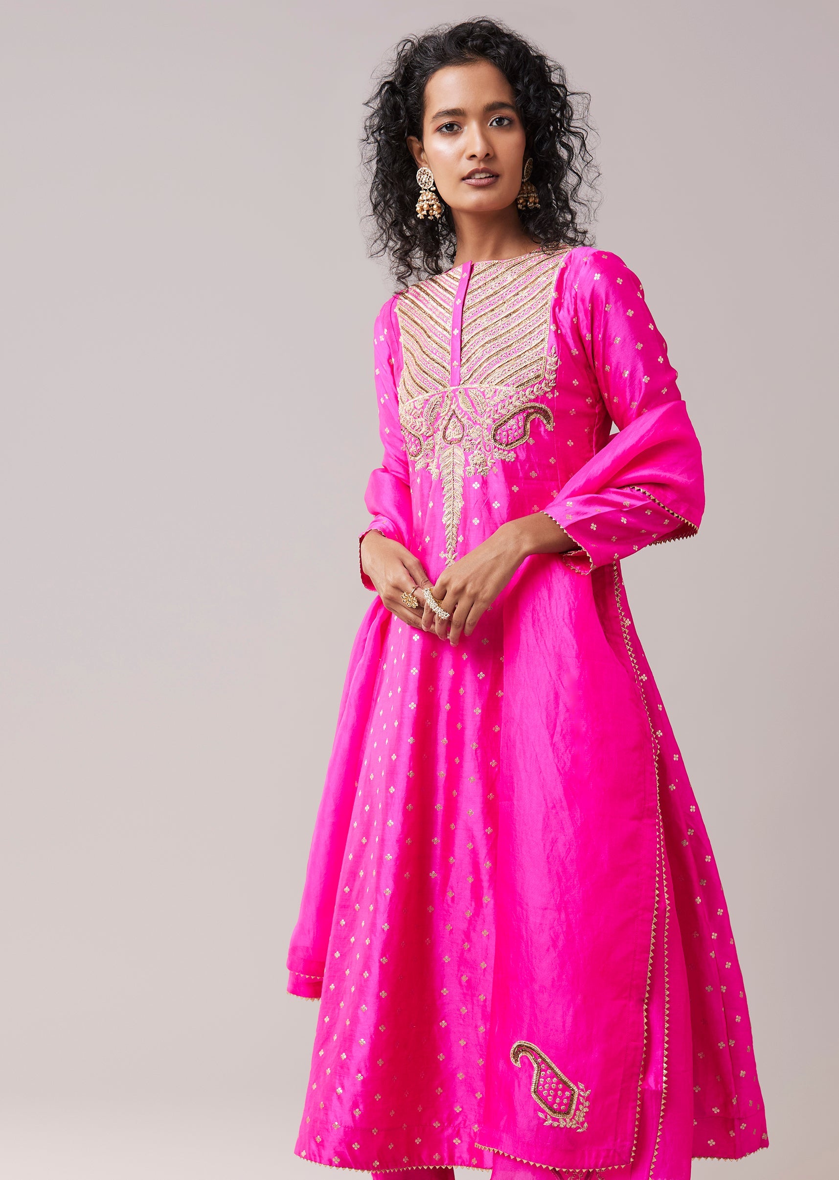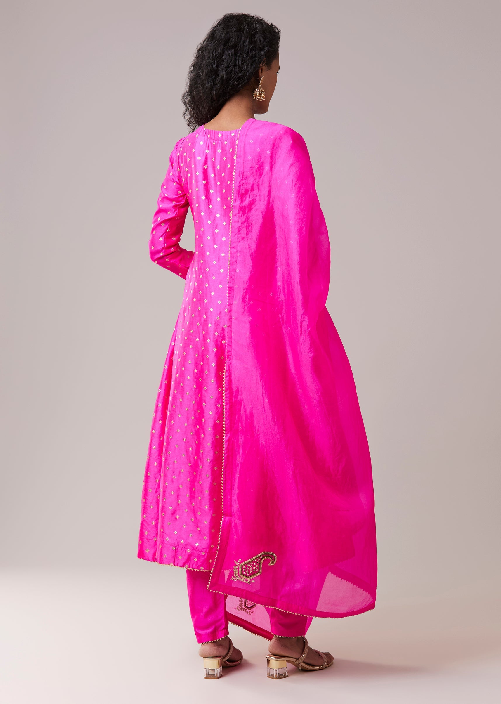 Rani Pink Pure Chiniya Silk Gota Work Anarkali Set